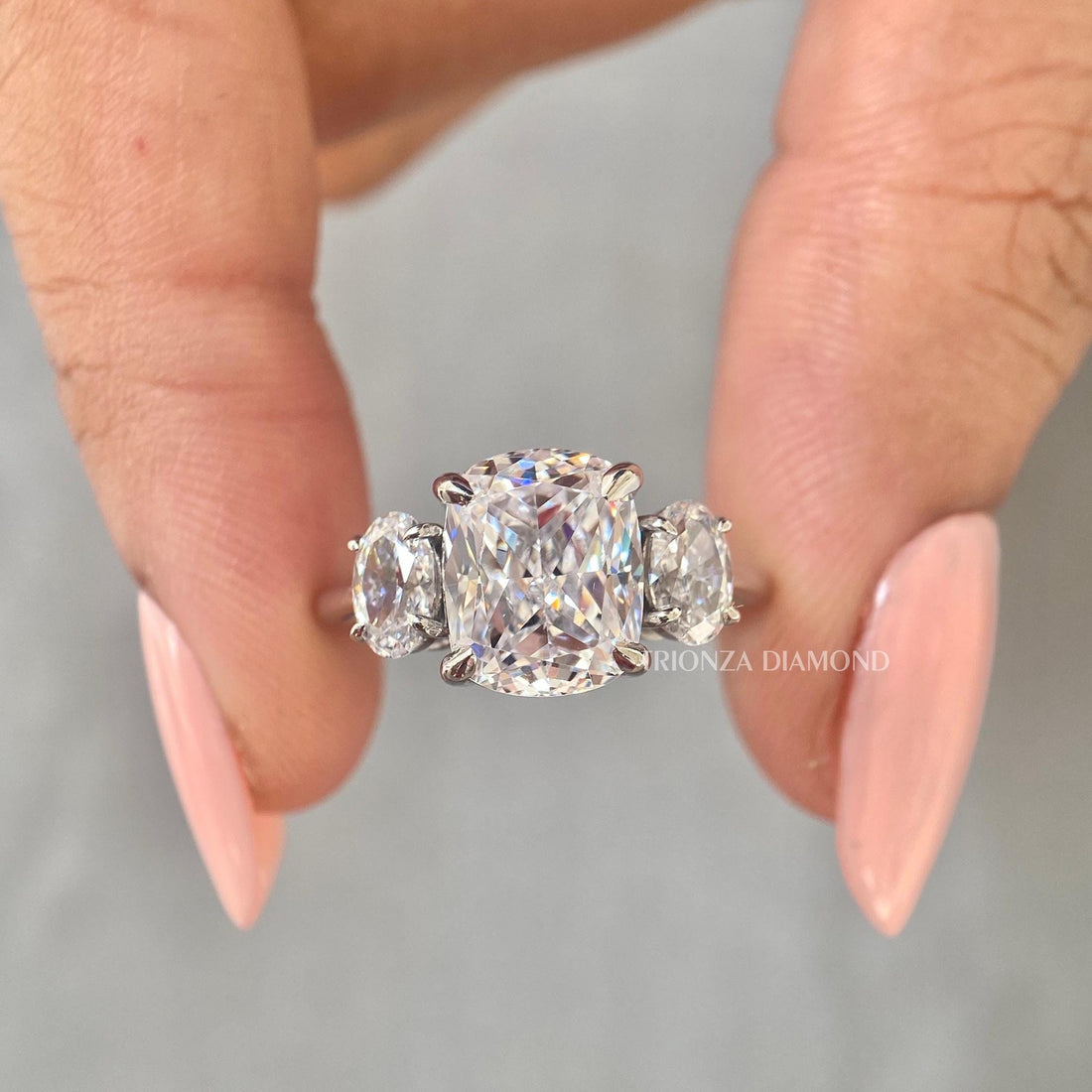 3 CT Cushion E/VVS2 Lab Grown Diamond Three Stone Ring | Oval Cut