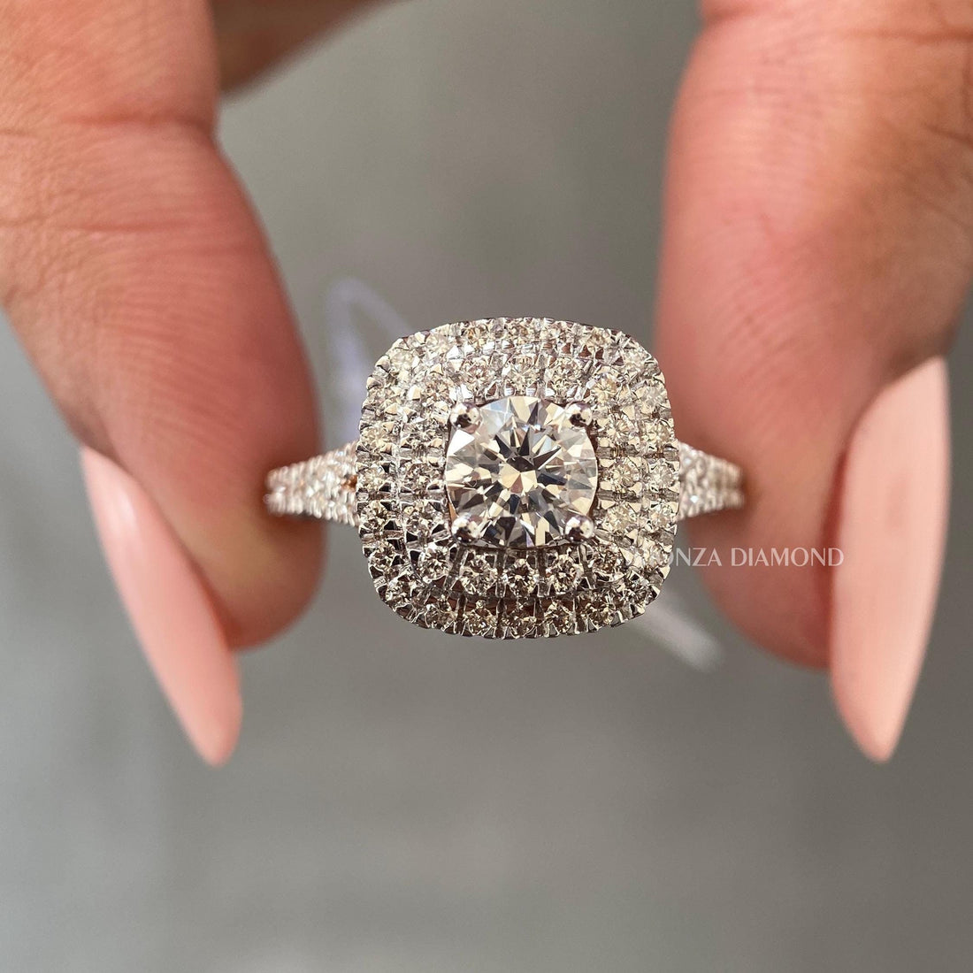 This exquisite 1.70 TCW Round Cut Diamond Ring features a stunning Double Cushion Halo Design,...