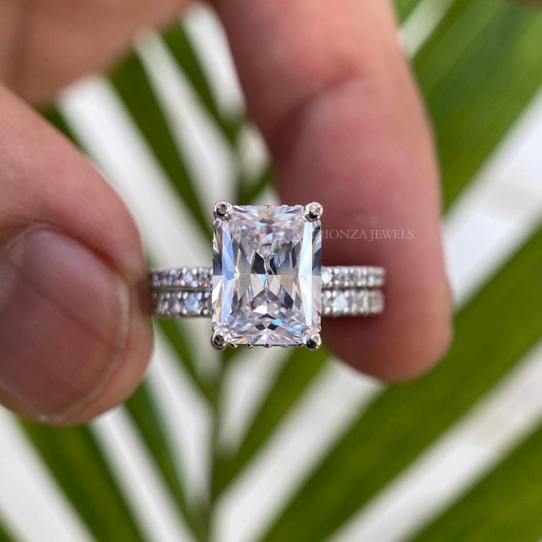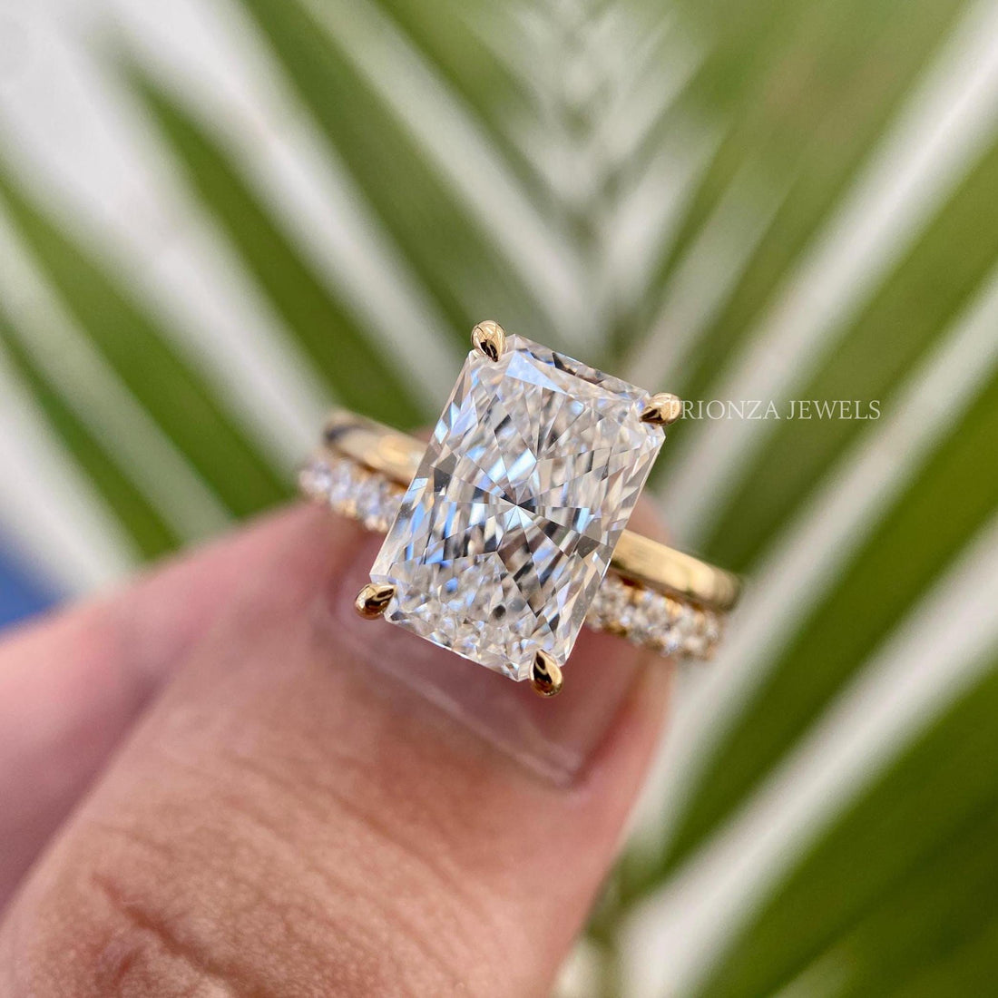 Discover our unique Engagement Ring Set, featuring a stunning 3 carat Radiant Moissanite engagement ring...