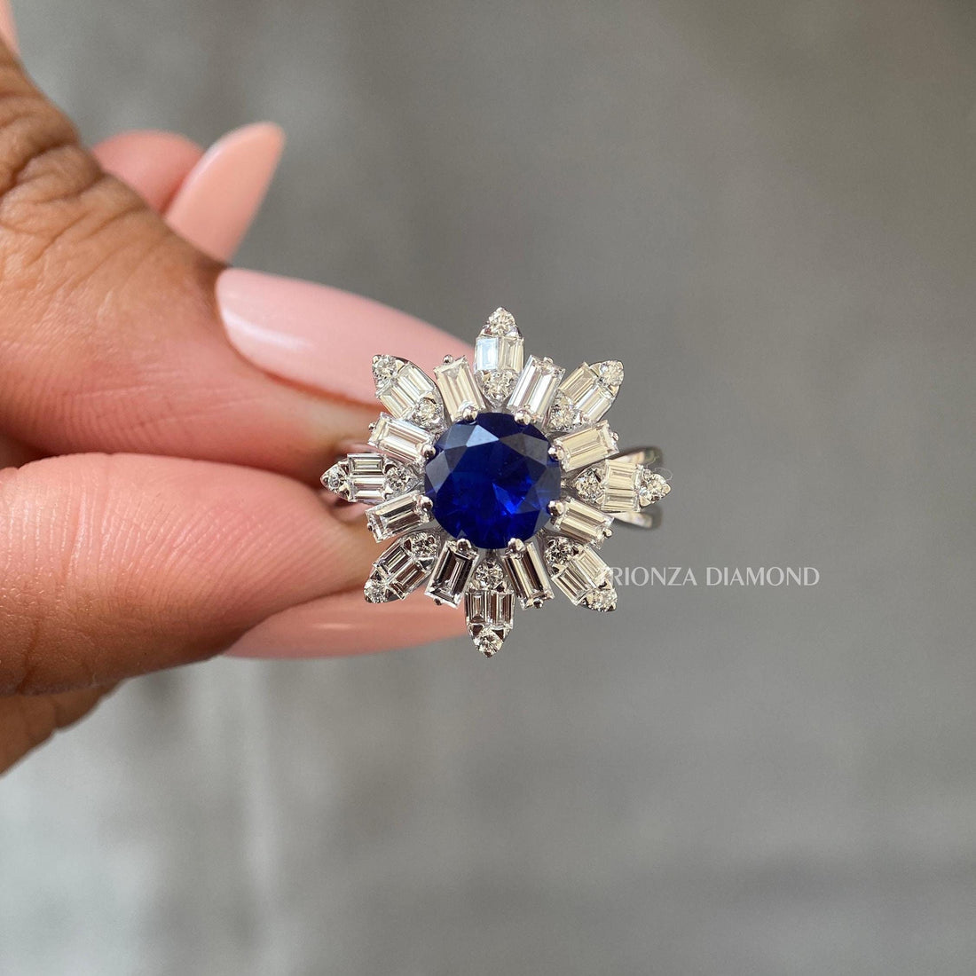 This exquisite Blue Floral Design Wedding Ring features a stunning round cut blue diamond and...