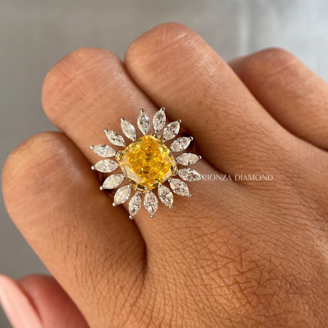 This exquisite Yellow Cushion with Side Halo Marquise Flower Design Ring features an IGI Certified...