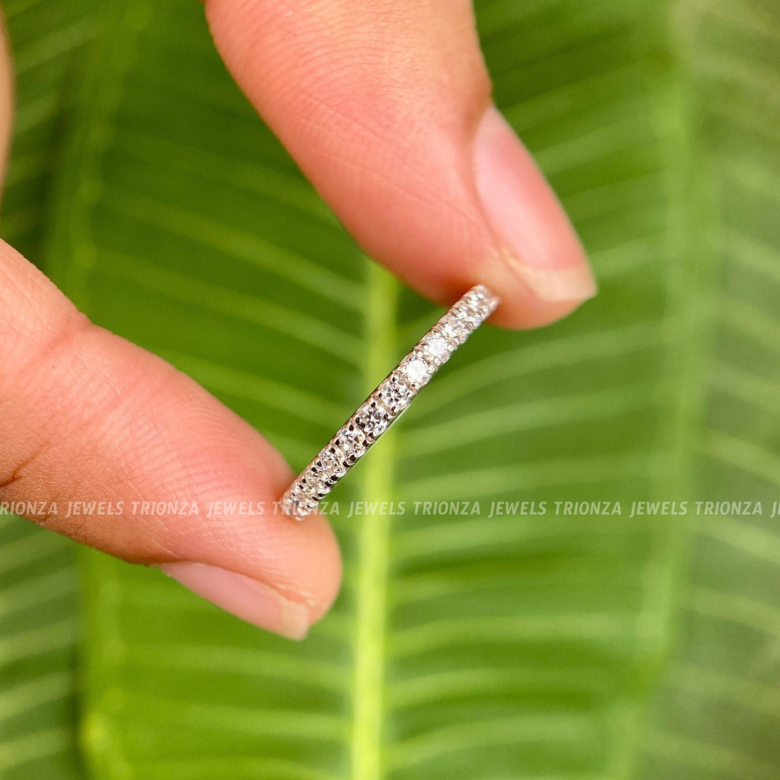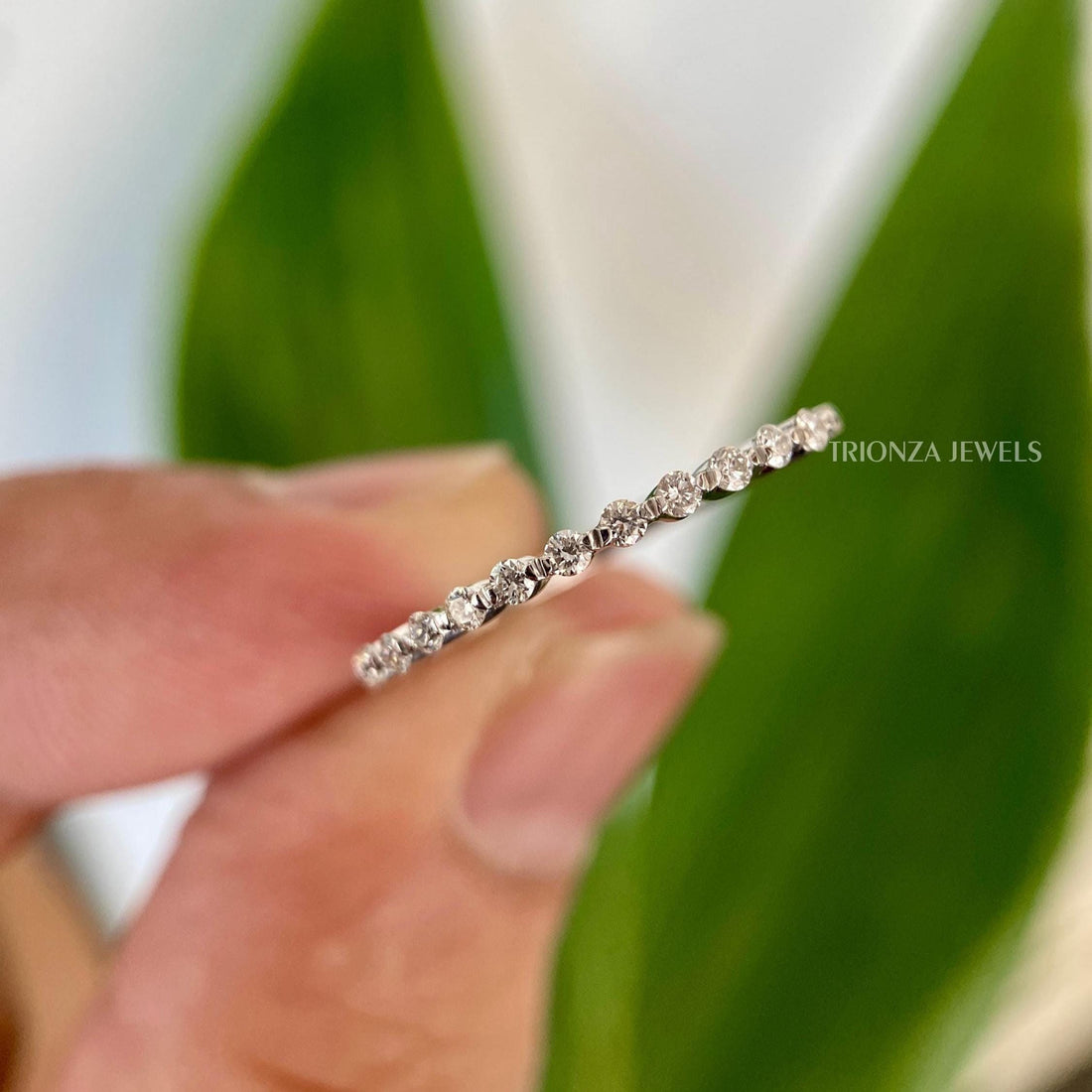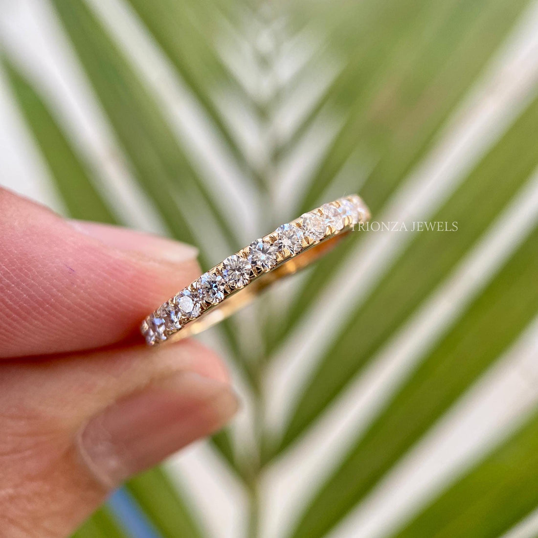 Find the ideal sparkle, to, comfort ratio with a moissanite diamond half eternity band. With radiant stones facing upwards, this style delivers the highest glow with a comfortable back side that is perfect for wearing every day. Every moissanite half eternity band is made strong and can be resized, thanks to the expert setting techniques we use at Trionza Diamond. By selecting a perpetuity band made from earth, friendly materials, you can still enjoy the luxuries of life without causing harm to nature. Get an ethical half eternity wedding band that can be easily layered, thus representing your ever, lasting bond with the understated beauty of the practical style.