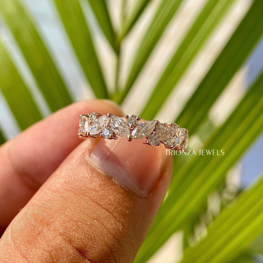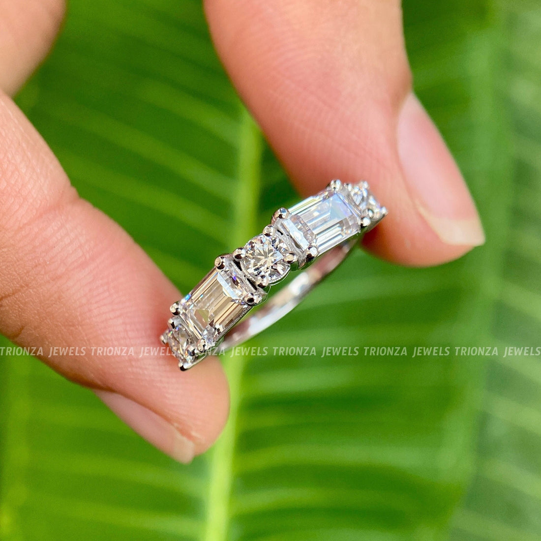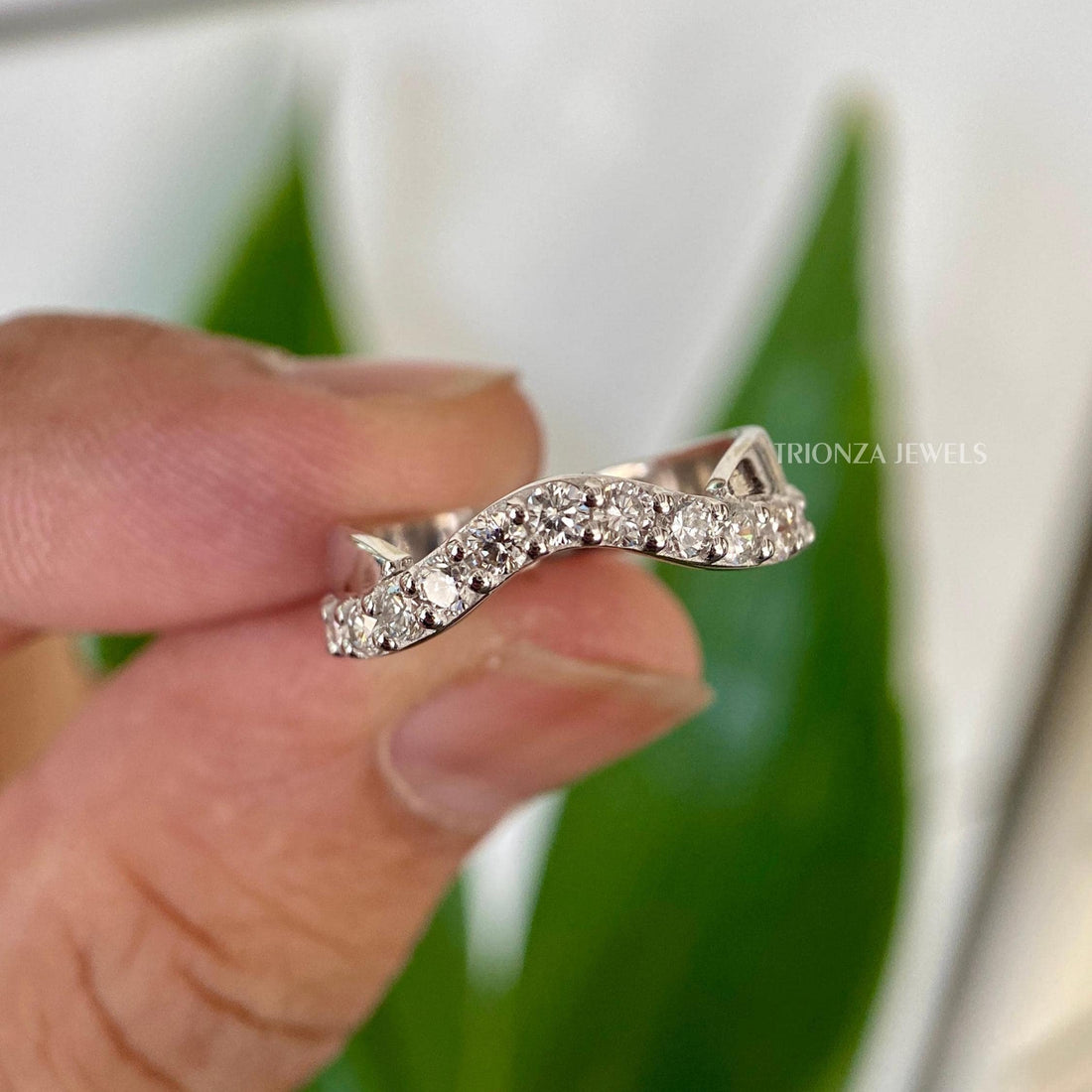 Find the ideal sparkle, to, comfort ratio with a moissanite diamond half eternity band. With radiant stones facing upwards, this style delivers the highest glow with a comfortable back side that is perfect for wearing every day. Every moissanite half eternity band is made strong and can be resized, thanks to the expert setting techniques we use at Trionza Diamond. By selecting a perpetuity band made from earth, friendly materials, you can still enjoy the luxuries of life without causing harm to nature. Get an ethical half eternity wedding band that can be easily layered, thus representing your ever, lasting bond with the understated beauty of the practical style.