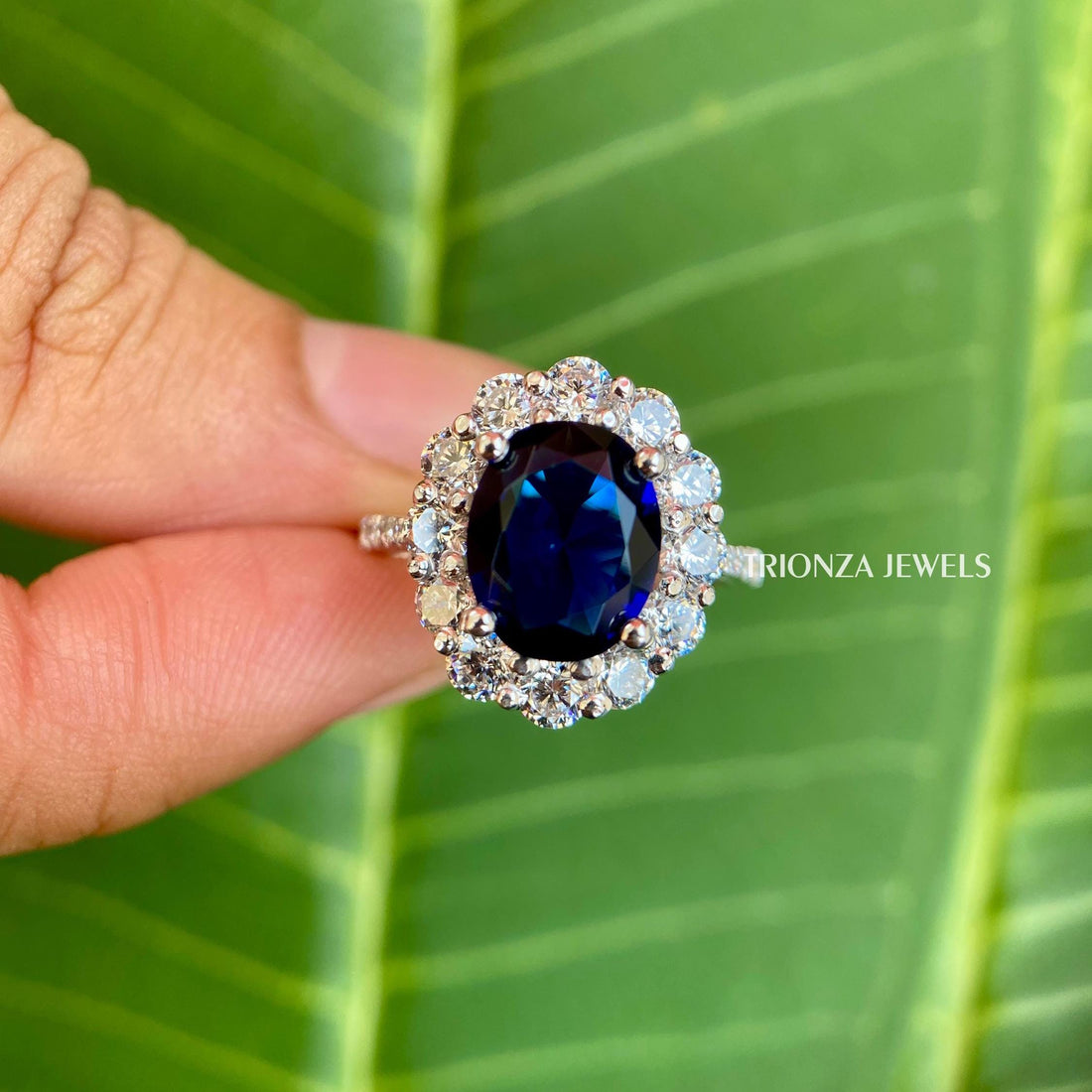 3.00 CT Blue Oval Moissanite Engagement Ring - Halo Starburst Handmade