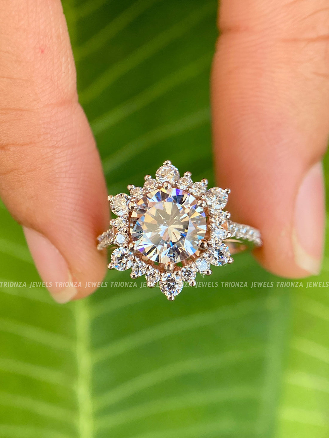 Presenting the exquisite 3.50 CT Starburst Round Cut Moissanite Diamond Floral Halo Engagement Ring, a...
