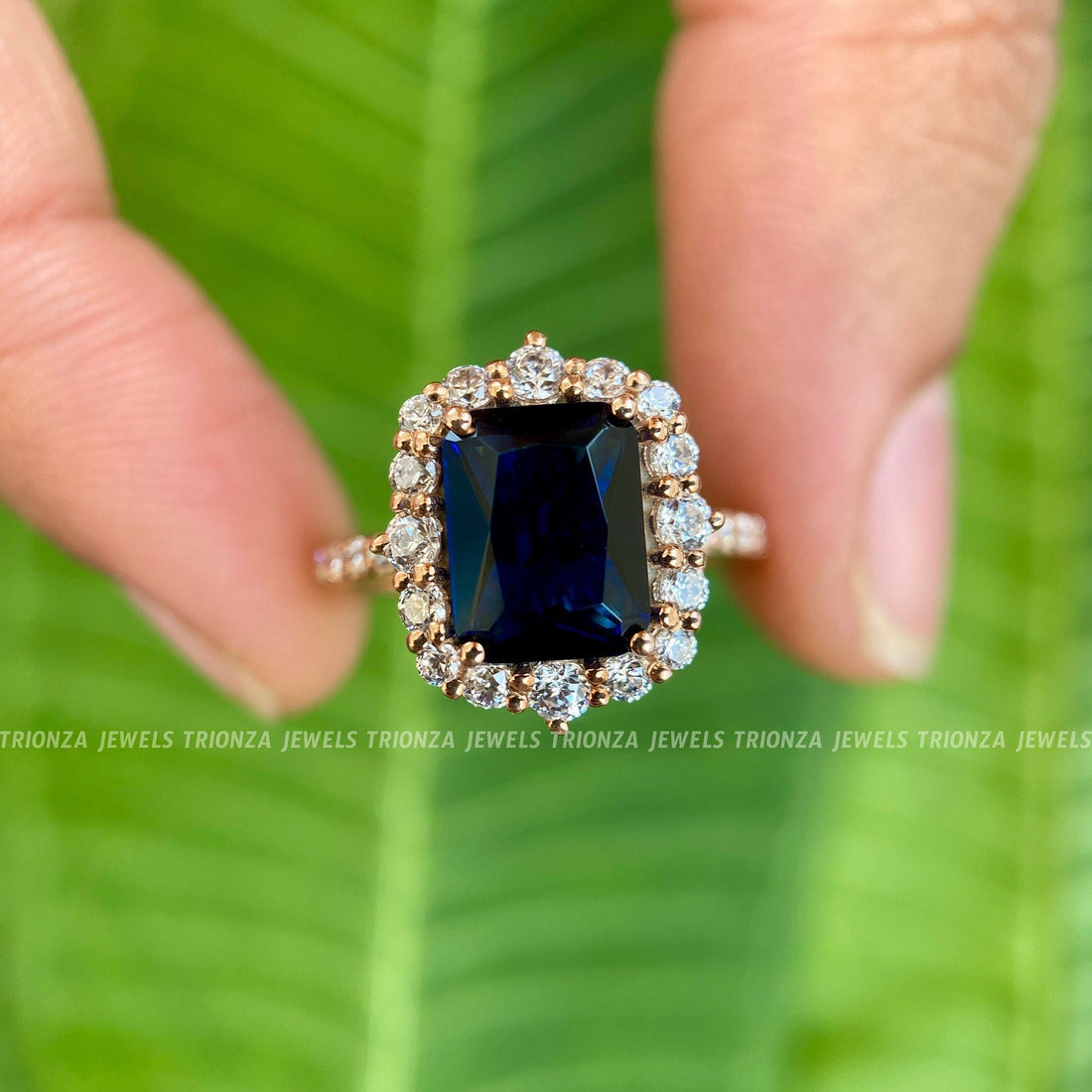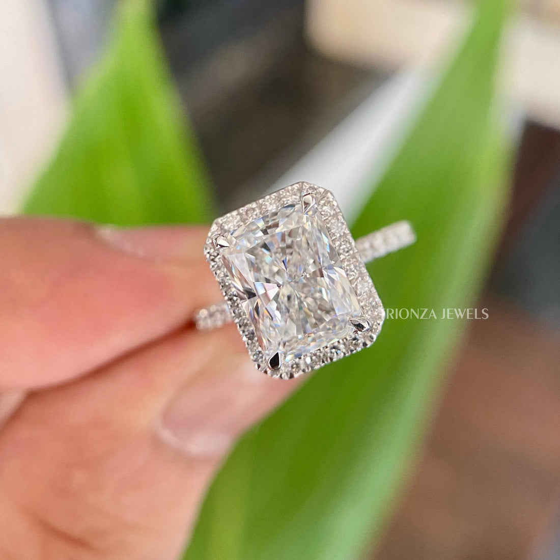 Discover our stunning Radiant Moissanite Diamond Ring, featuring a dazzling halo of round moissanite diamonds....