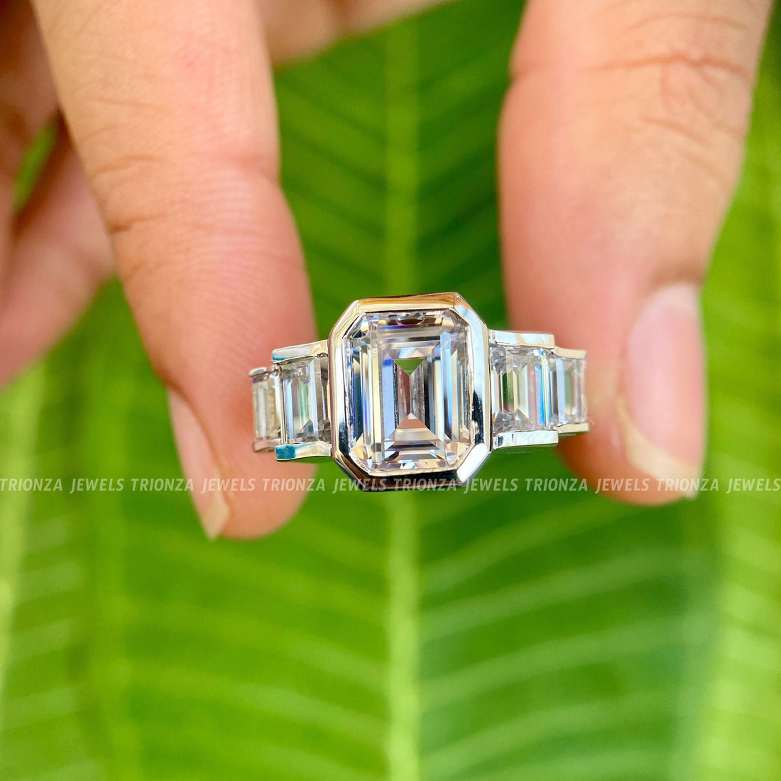 Discover our unique Moissanite Bezel Set Engagement Ring, featuring a stunning 3.0 CTW Emerald Cut...