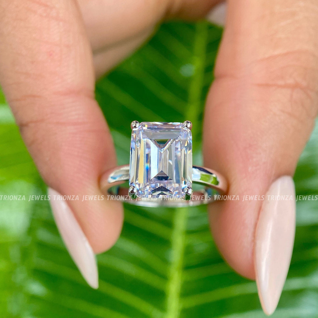 This stunning 4 Carat Brilliant Elongated Emerald Cut Moissanite Solitaire Ring is available in Rose...