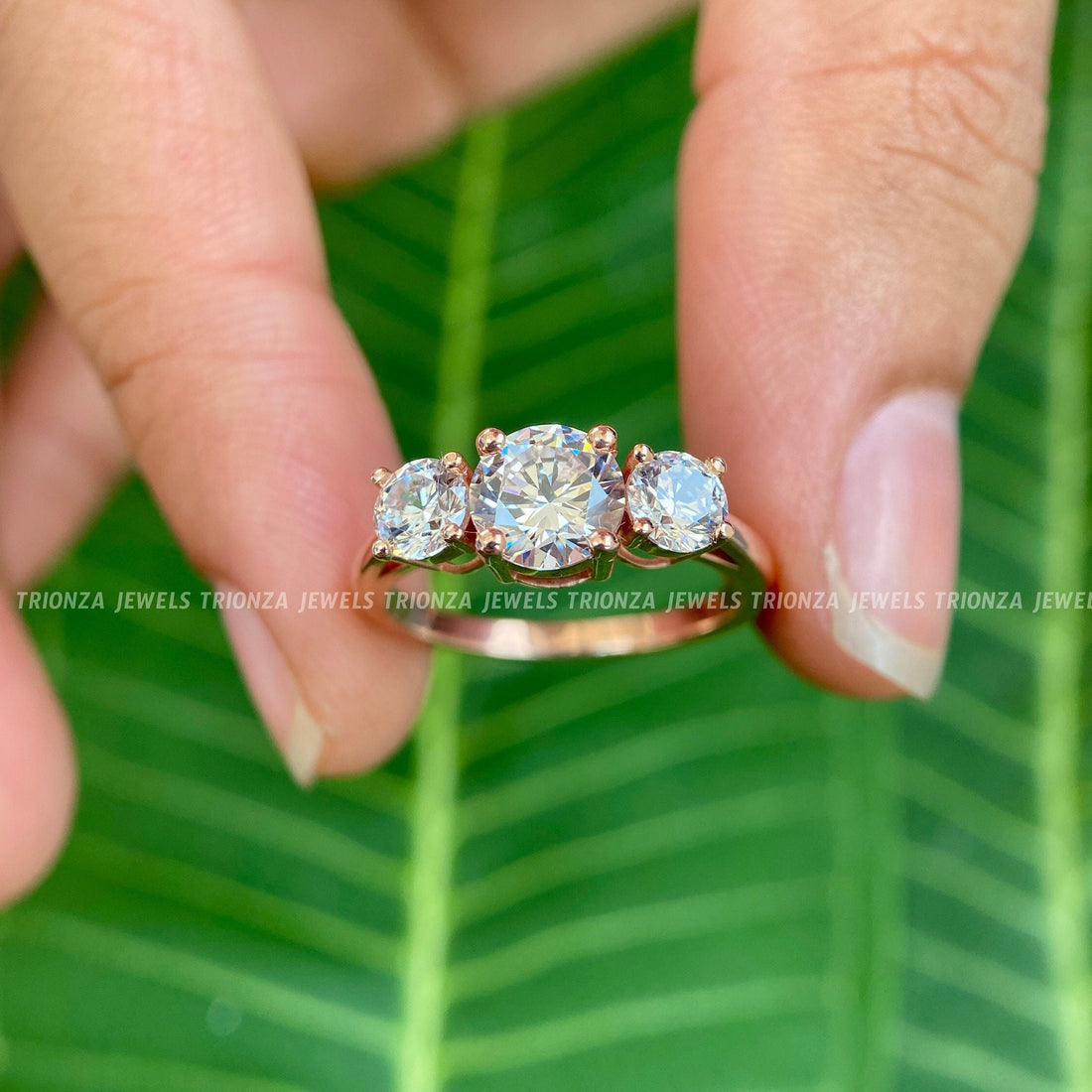 Three Stone 1.5 CT Round Moissanite Engagement Ring 14k Gold