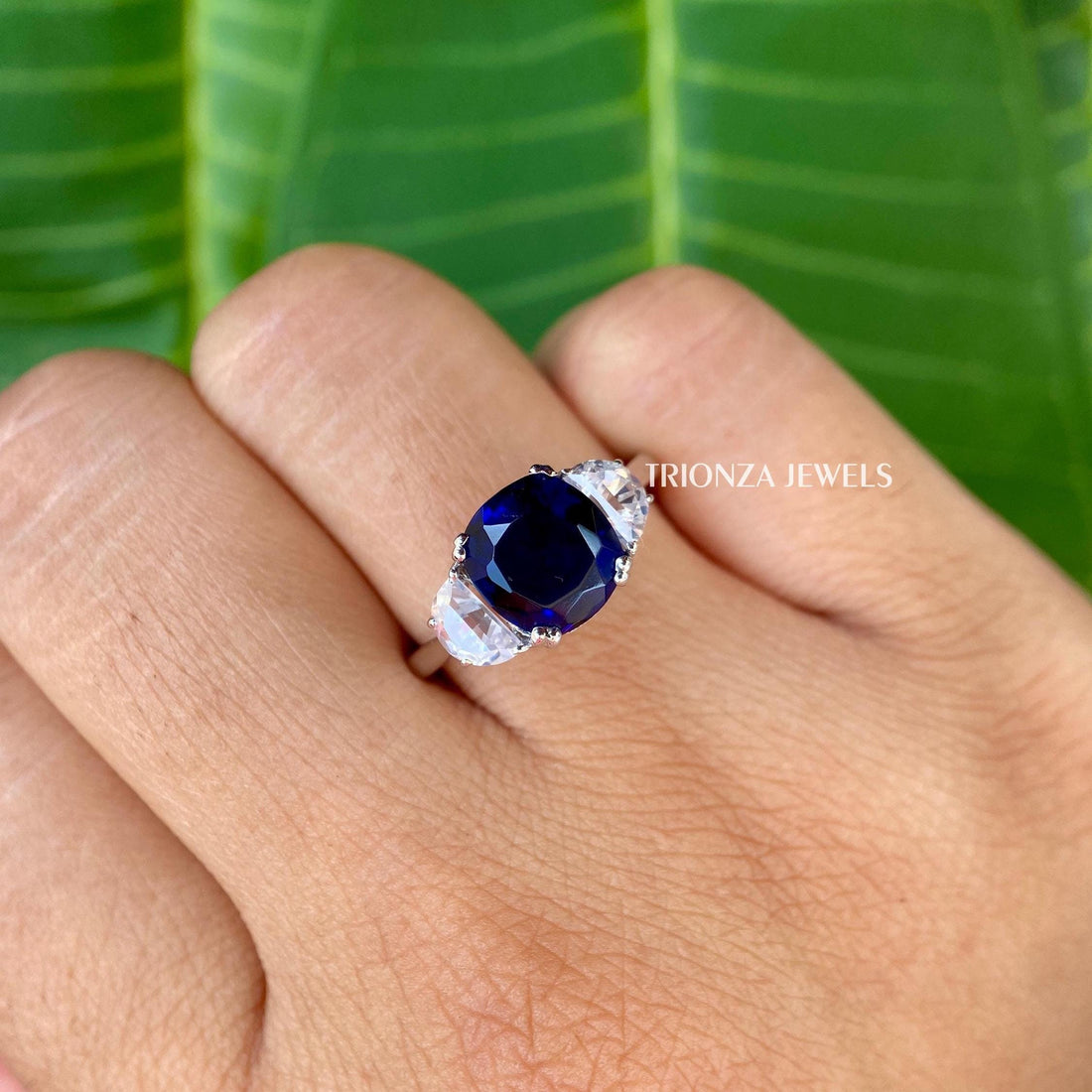 Blue Cushion Moissanite Three Stone Ring | Half Moon Diamond | Gift Her