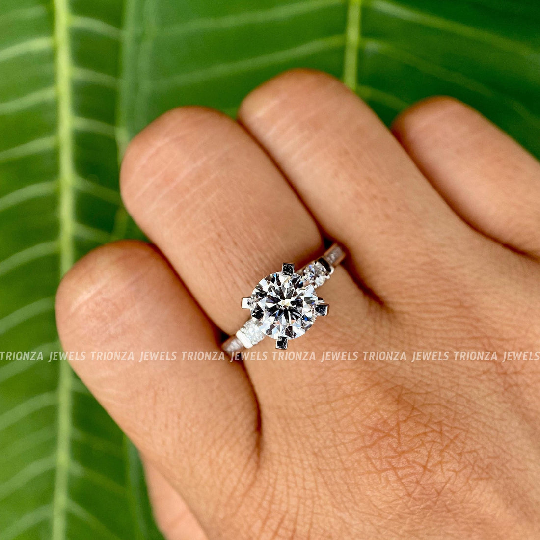 Celebrate your unique journey with our collection of moissanite diamond three stone rings. Each stone stands for your past, present, and future, making an absolutely stunning and heartfelt expression of love that lasts forever. Trionza Diamond is very conscious about setting each stone carefully in order to achieve visually perfect harmony together with the functionality and durability of the ring, so our expert setting techniques are what we rely most on in making every moissanite three stone ring offer perfect balance and lasting durability. By opting for a sustainable three stone ring, you literally breathe the best of the fire without the planet suffering. Make an impact with your love story by choosing an ethical three stone engagement ring that unites thoughtful conception with top, notch workmanship for a brilliant life shared.