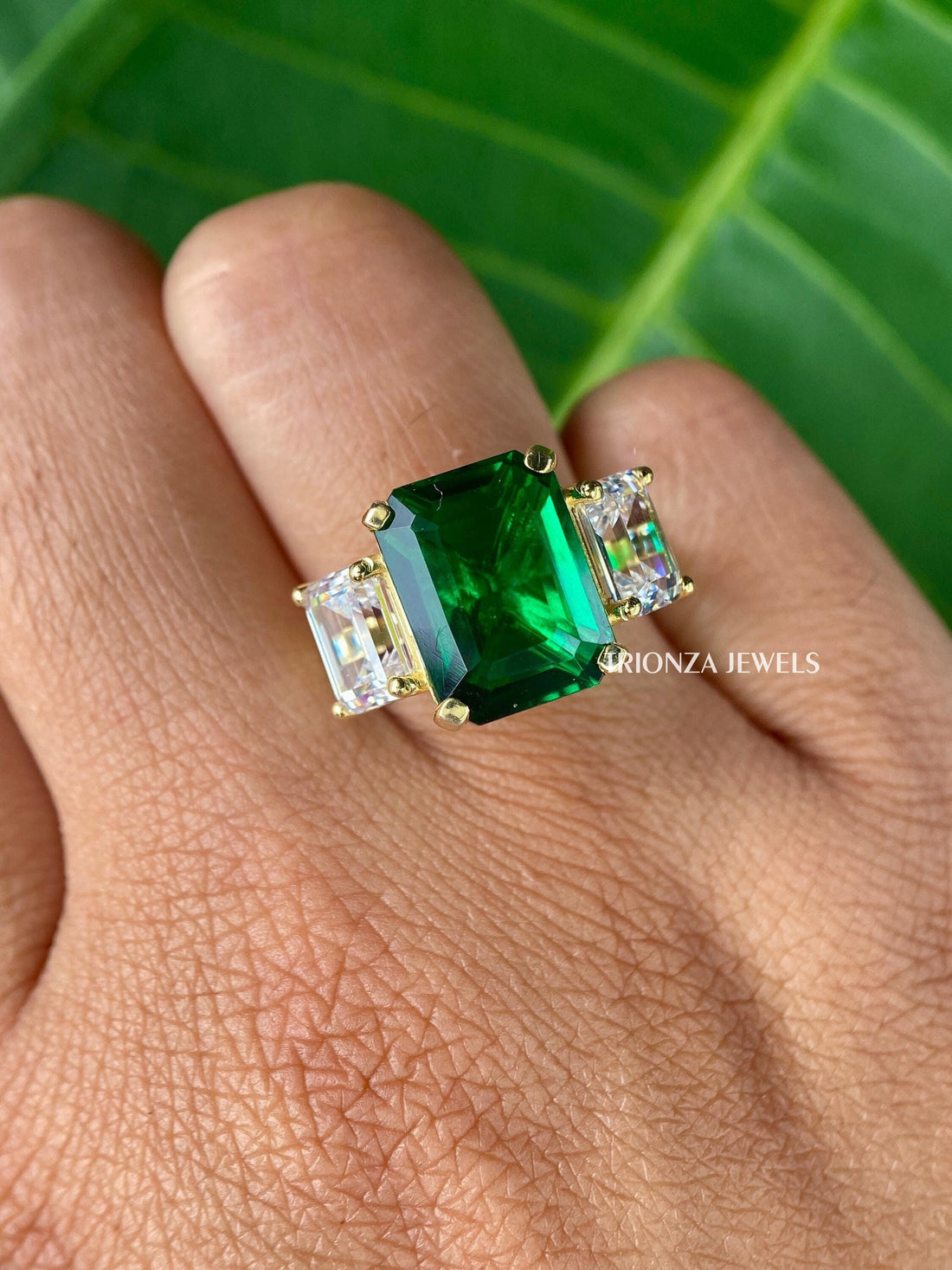 Green Emerald Moissanite Three Stone Engagement Ring, 8.02 TW