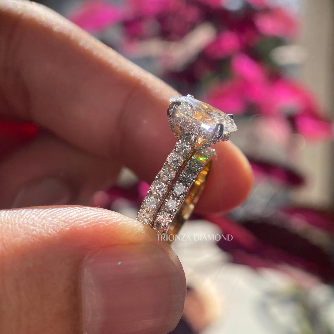 Discover the Oval lab grown diamond bridal set that visually stretches and glamorises the finger while lightening up the whole set with sparkling brilliance. At Trionza Diamond, we make sure that every set is a perfect match, the engagement ring and band lining up for a smooth, comfort, fit end. By choosing a lab grown diamond bridal set, you are not only getting the highest quality of a diamond with no environmental impact. Shop for the perfect ethical oval bridal set today. Make a promise that will last forever with a perfectly matching oval lab grown diamond engagement ring set, created for a lifetime of love.