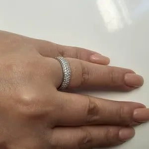 I got this wedding band to go with my 3 stone engagement ring and it fits and complements my ring perfectly! It’s very sparkly and beautiful