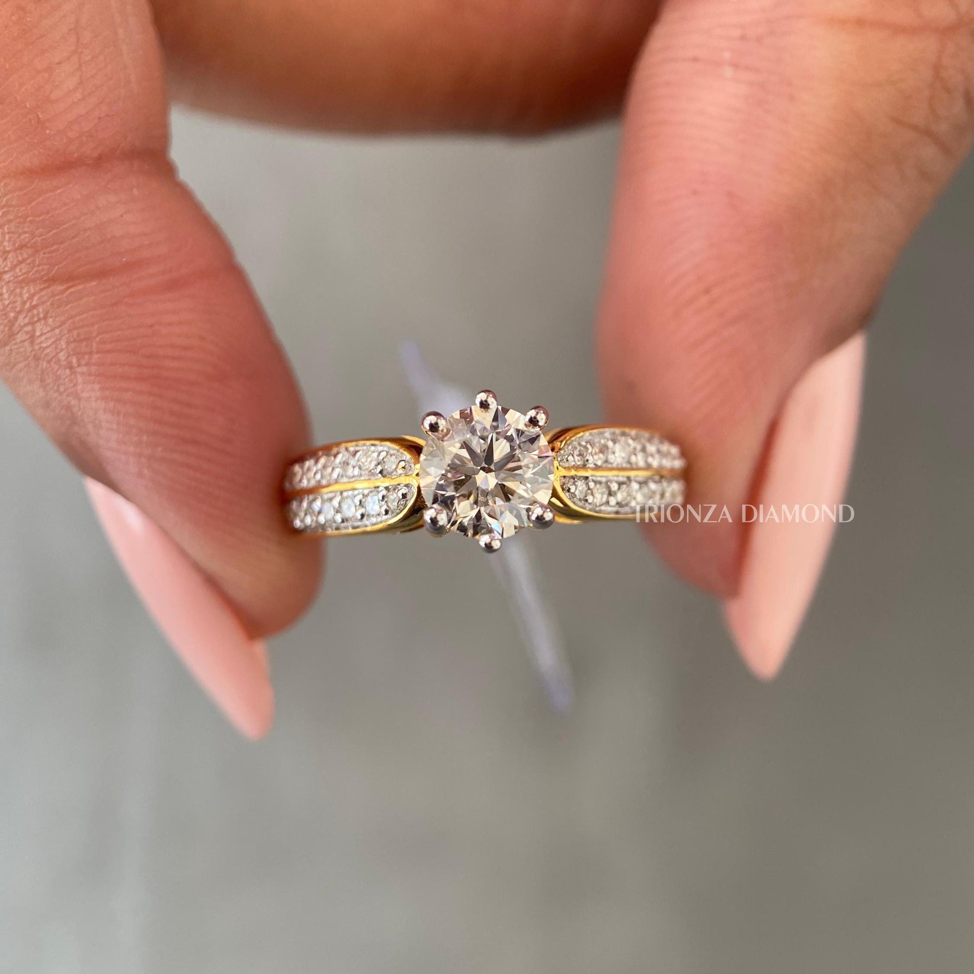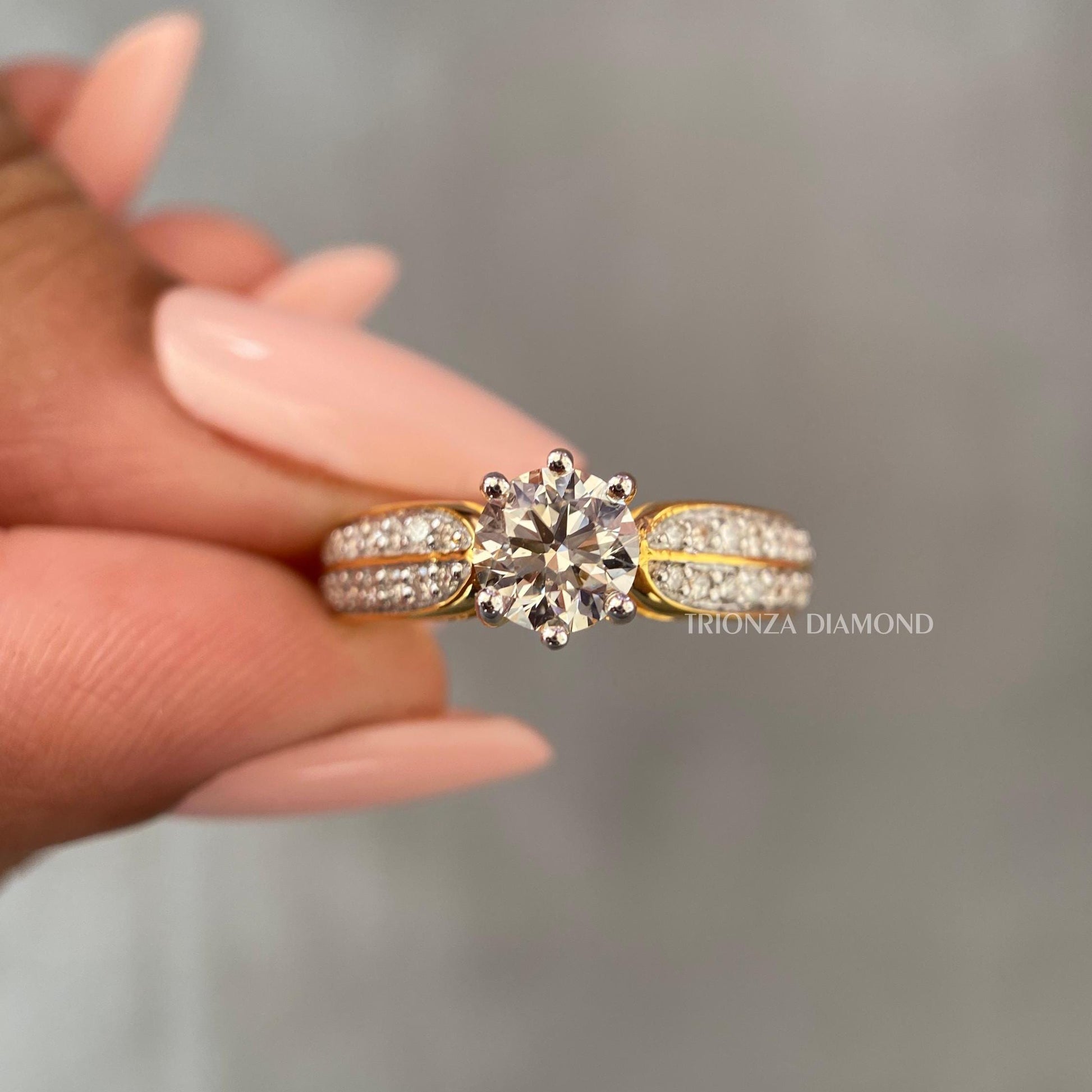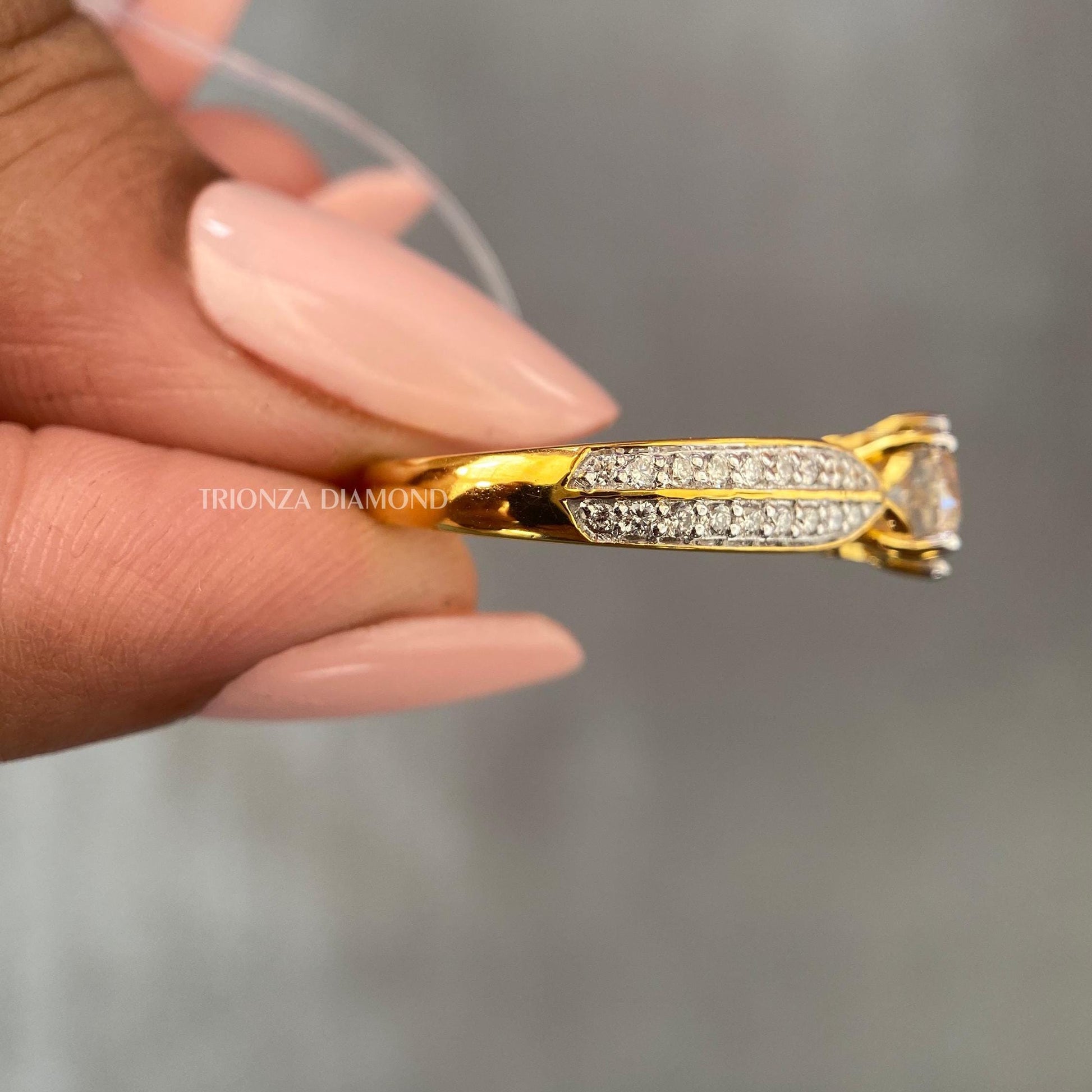 Discover our stunning 0.75 CT Round Lab Grown Diamond Solitaire Pave Set Ring, a brilliant cut ideal for weddings, anniversaries, or proposals. This exquisite ring for women features an IGI Certified, eco-friendly, and conflict-free lab created diamond.
