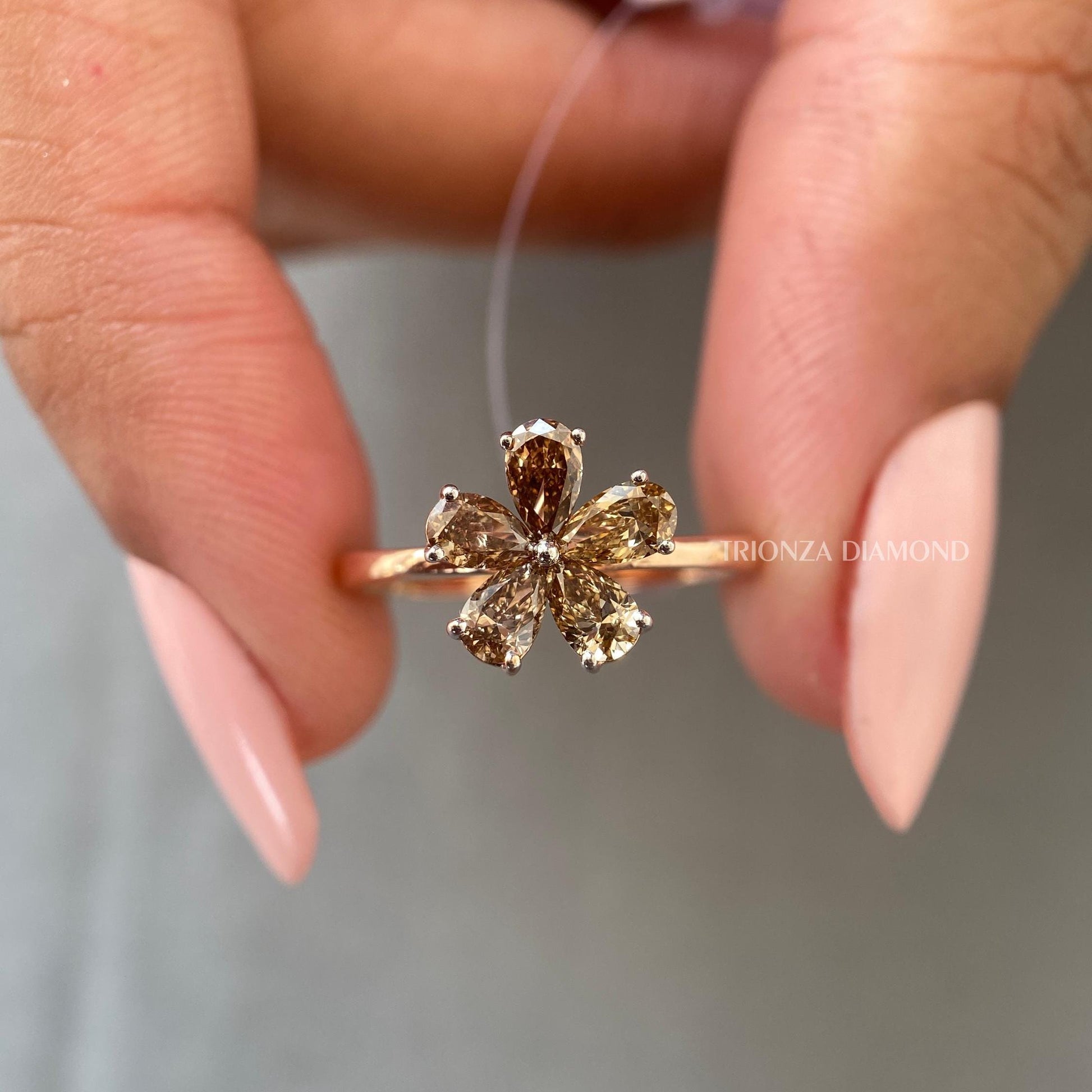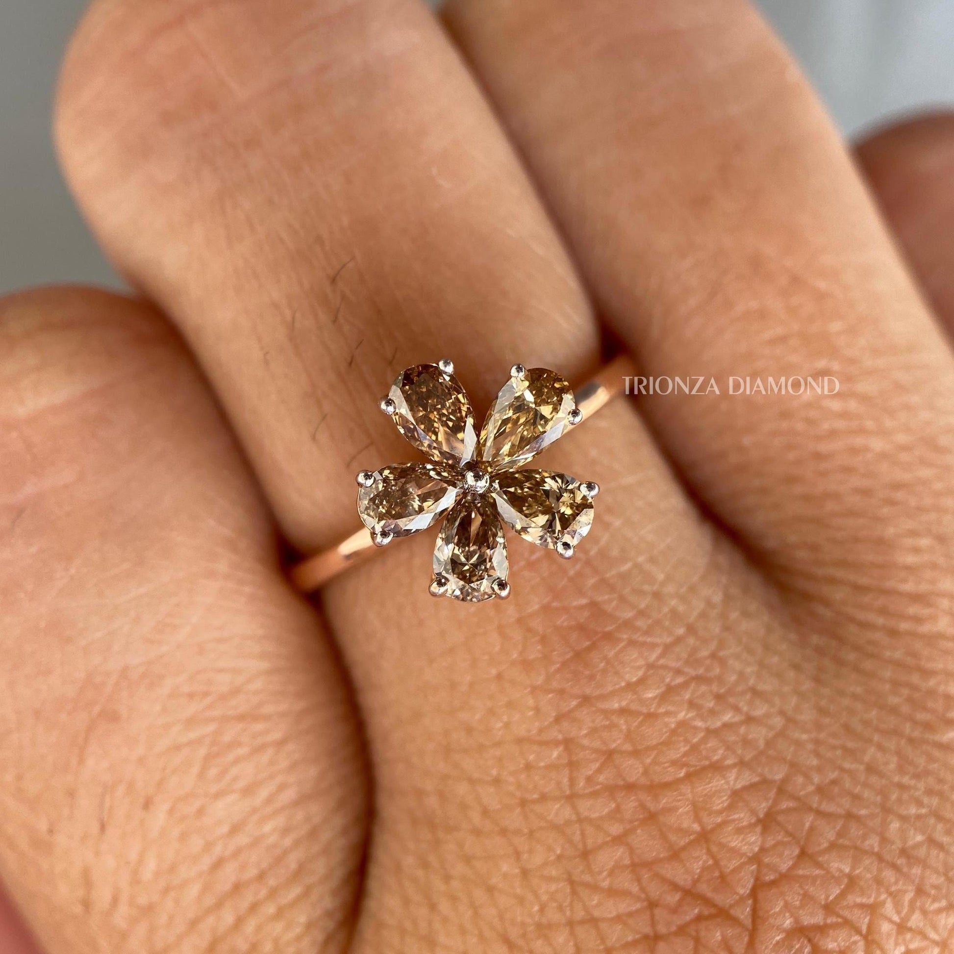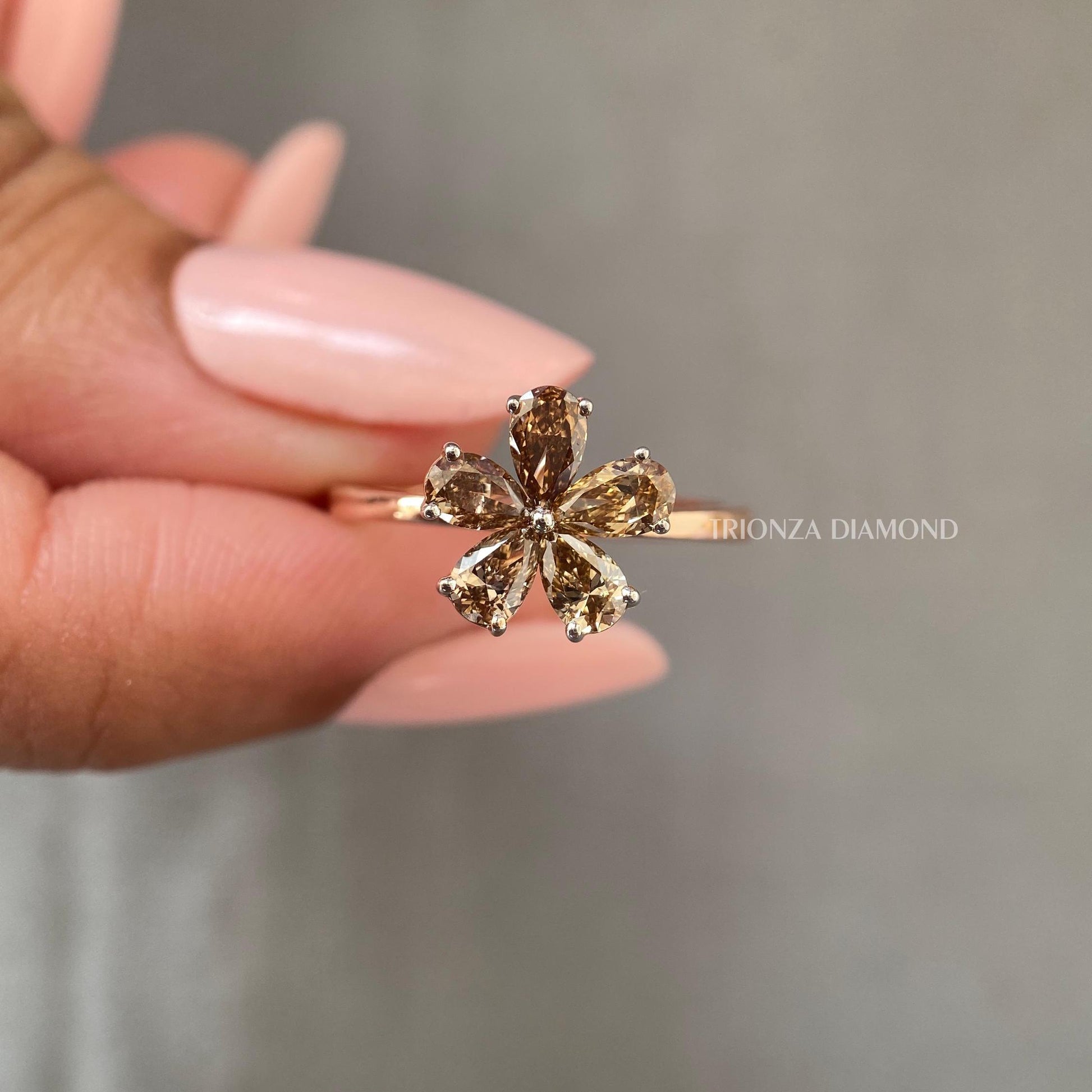 0.80 TCW Pear Brown Diamond Flower Ring - 14K Gold, IGI Certified