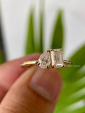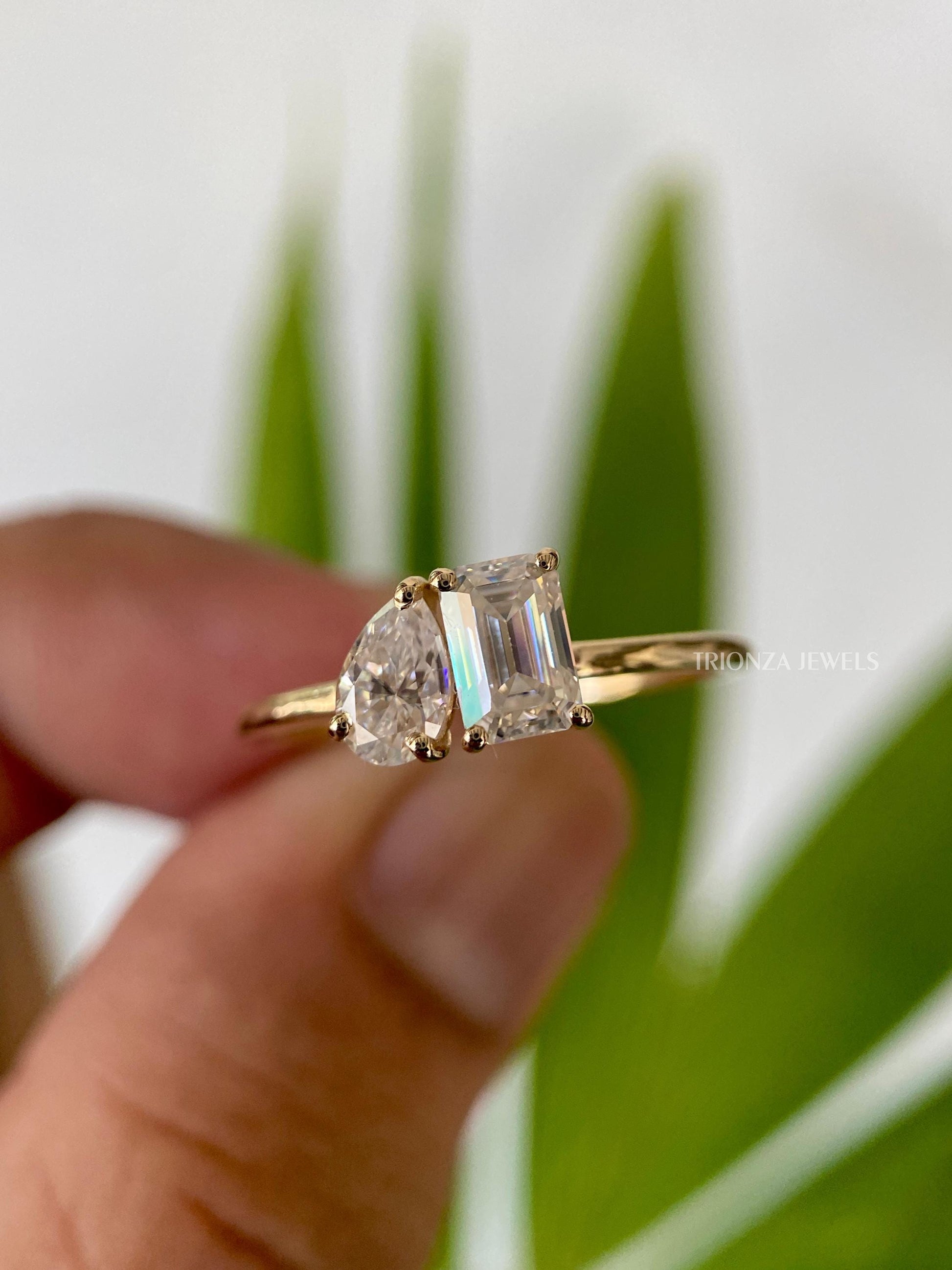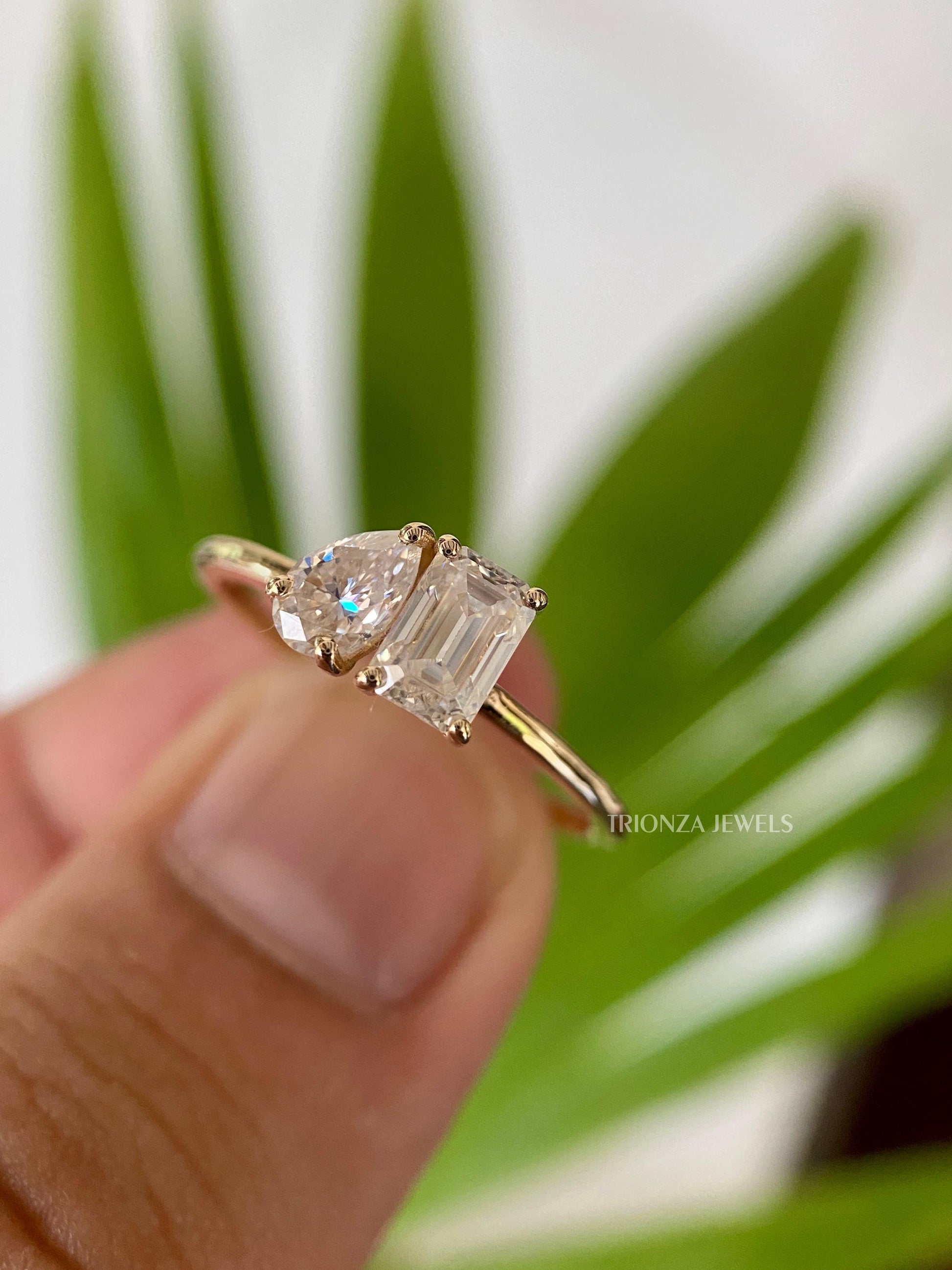 Discover our stunning 0.93 TCW Pear and Emerald Cut Colorless Moissanite Two Stone Engagement Ring, also known as a Toi Et Moi ring. This elegant piece is perfect as a wedding, bridal, or anniversary ring, crafted in 14k Solid Yellow Gold with a delicate thin shank.