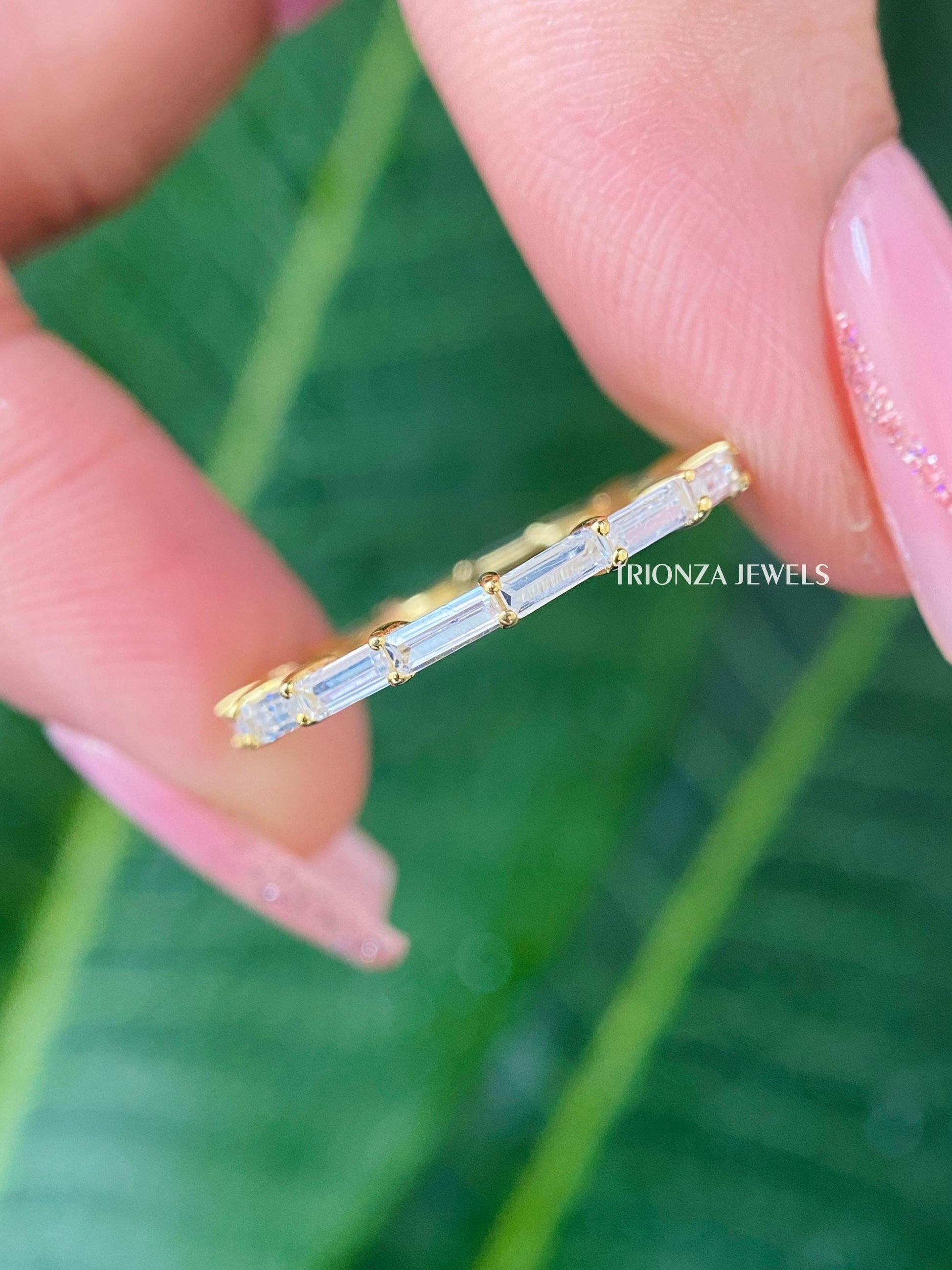 Discover our exquisite Minimalist Band Ring, a stunning 1.02 CT Baguette Cut Colorless Moissanite Full Eternity Wedding Stackable Band. This delicate ring for women makes an ideal Anniversary Gift, Christmas Handmade Jewelry, or a captivating Moissanite Engagement Ring. Part of the TRIONZA JEWELS collection, each piece is finely crafted as handmade jewelry for her.