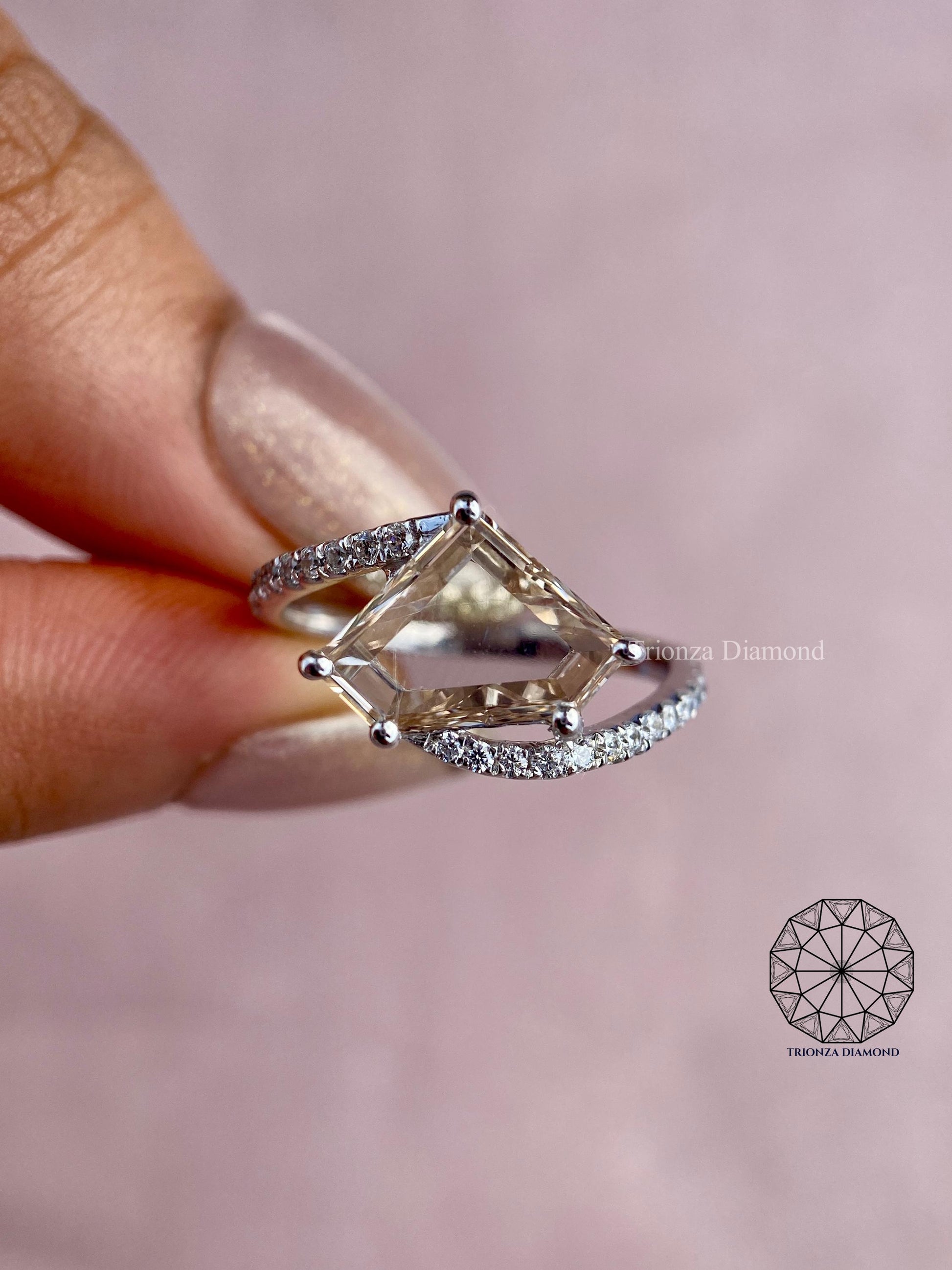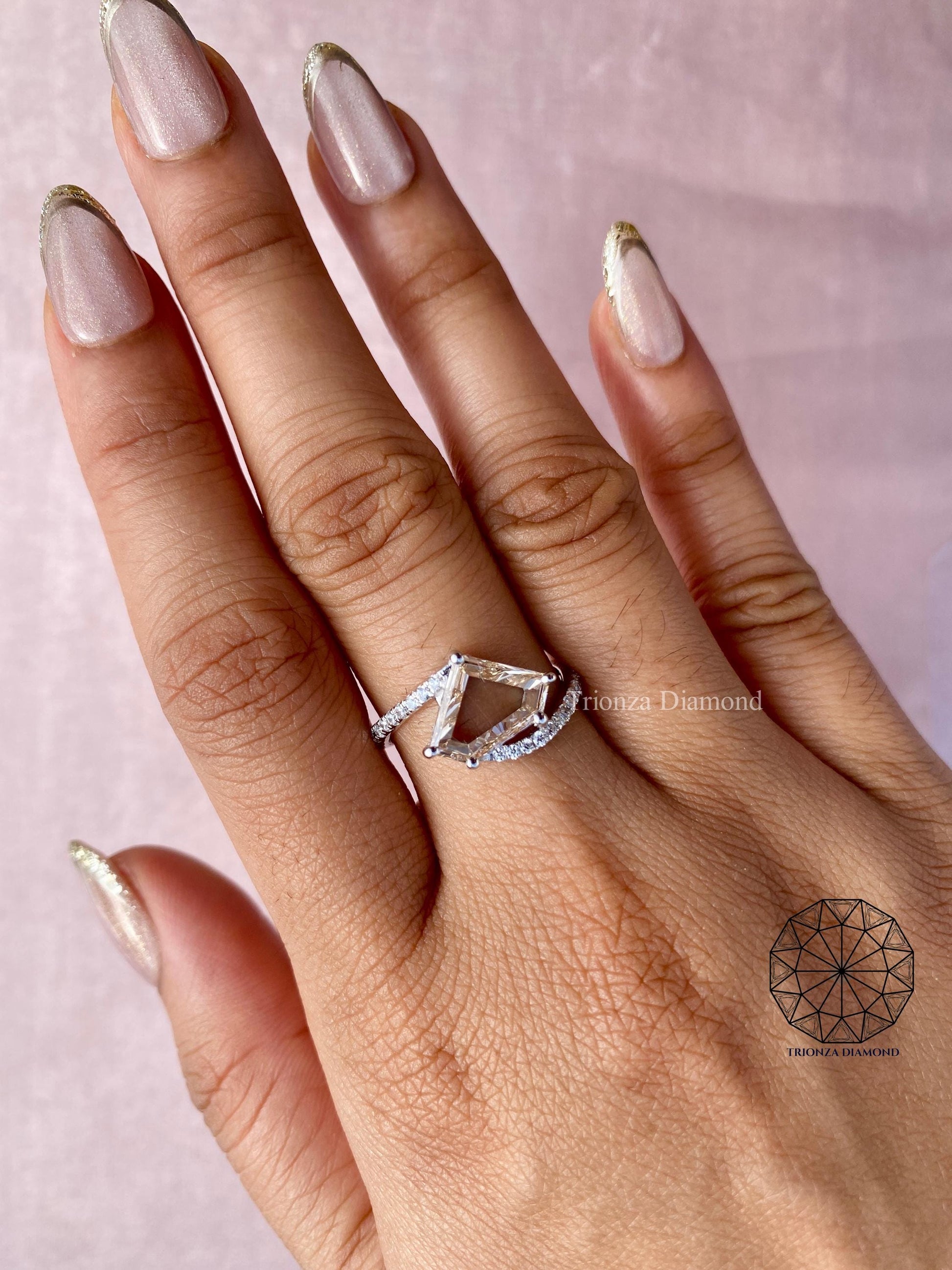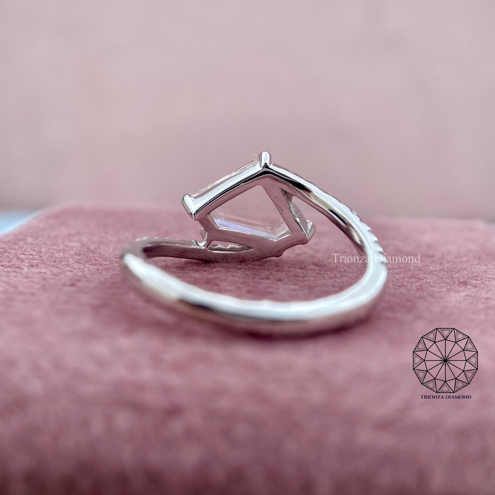 Discover this exquisite 1.49 CT Modified Trillion Rose Cut Lab Grown Diamond Engagement Ring, IGI Certified. Featuring a stunning bypass shank with pave-set lab diamonds, this unique piece from Trionza Diamond is perfect as a modern wedding ring or an elegant bridal ring. All our diamonds are 100% pure lab-grown (CVD acceptable worldwide IGI).