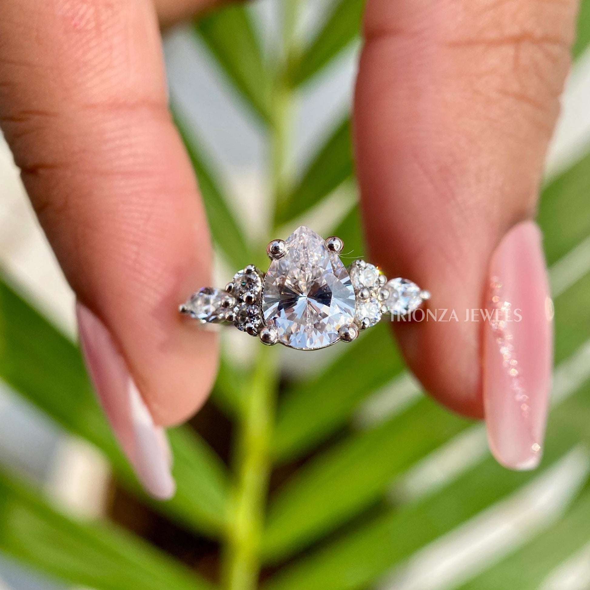 Discover the stunning Pear Cut Moissanite Engagement Ring from TRIONZA JEWELS. This gorgeous 1.5 CT pear-shaped solitaire ring, crafted in 14K Gold with a delicate thin band, makes an exquisite proposal ring, wedding gift, or personalized wedding band for her. Embrace confidence with our environmentally-friendly Moissanite diamond, also known as Eco-Friendly, Ethical, Sustainable, or Man-Made Diamond.