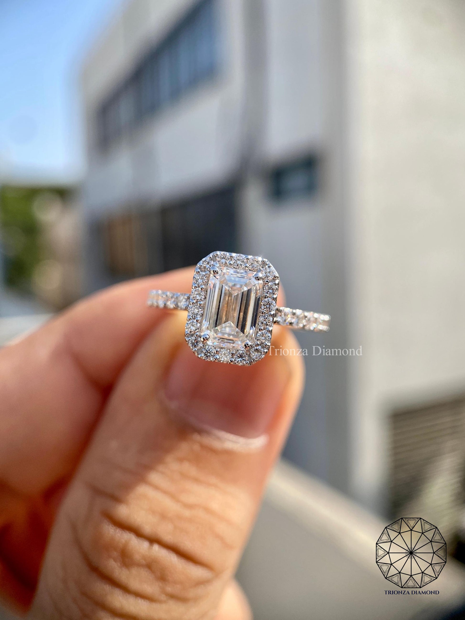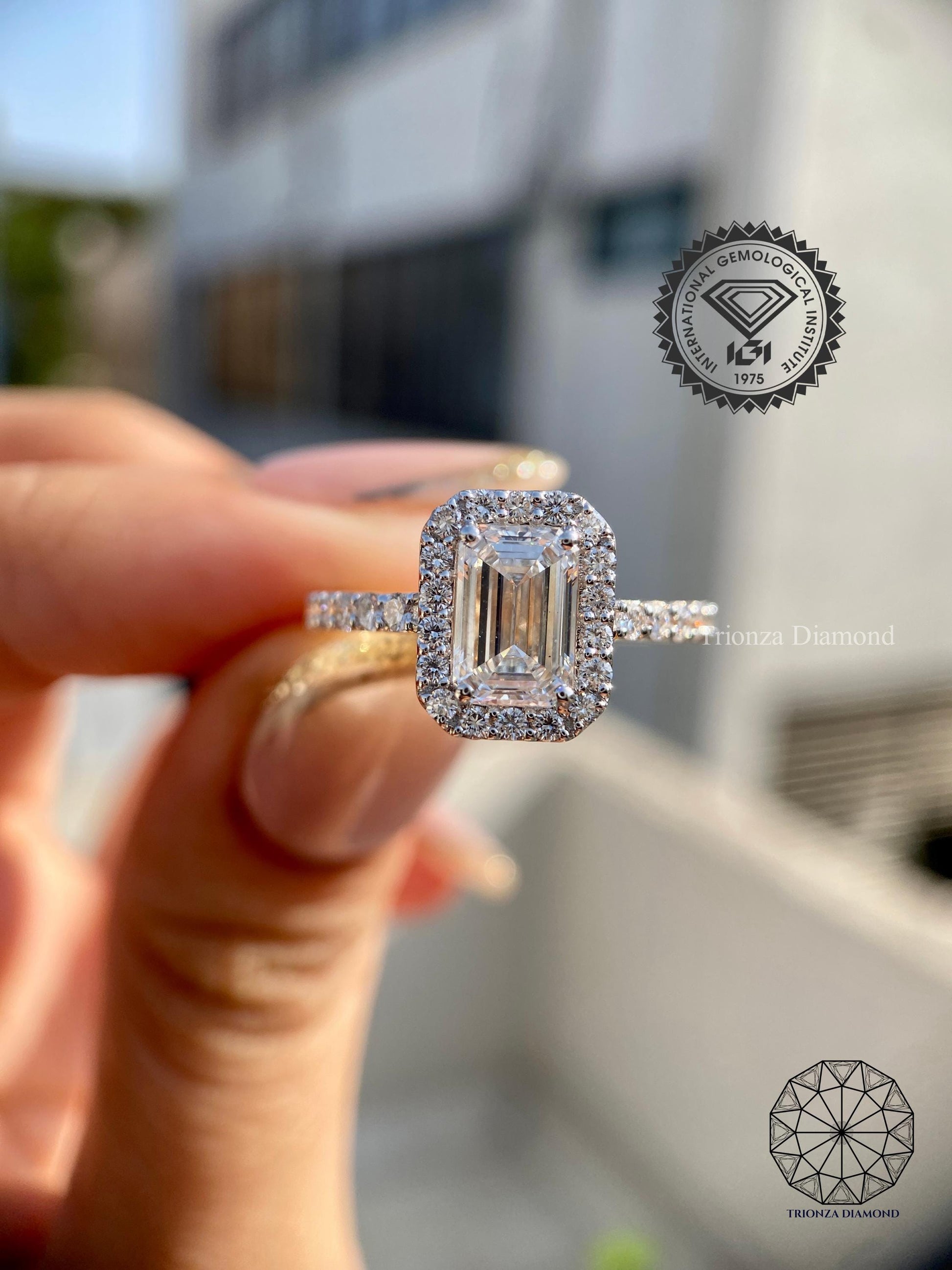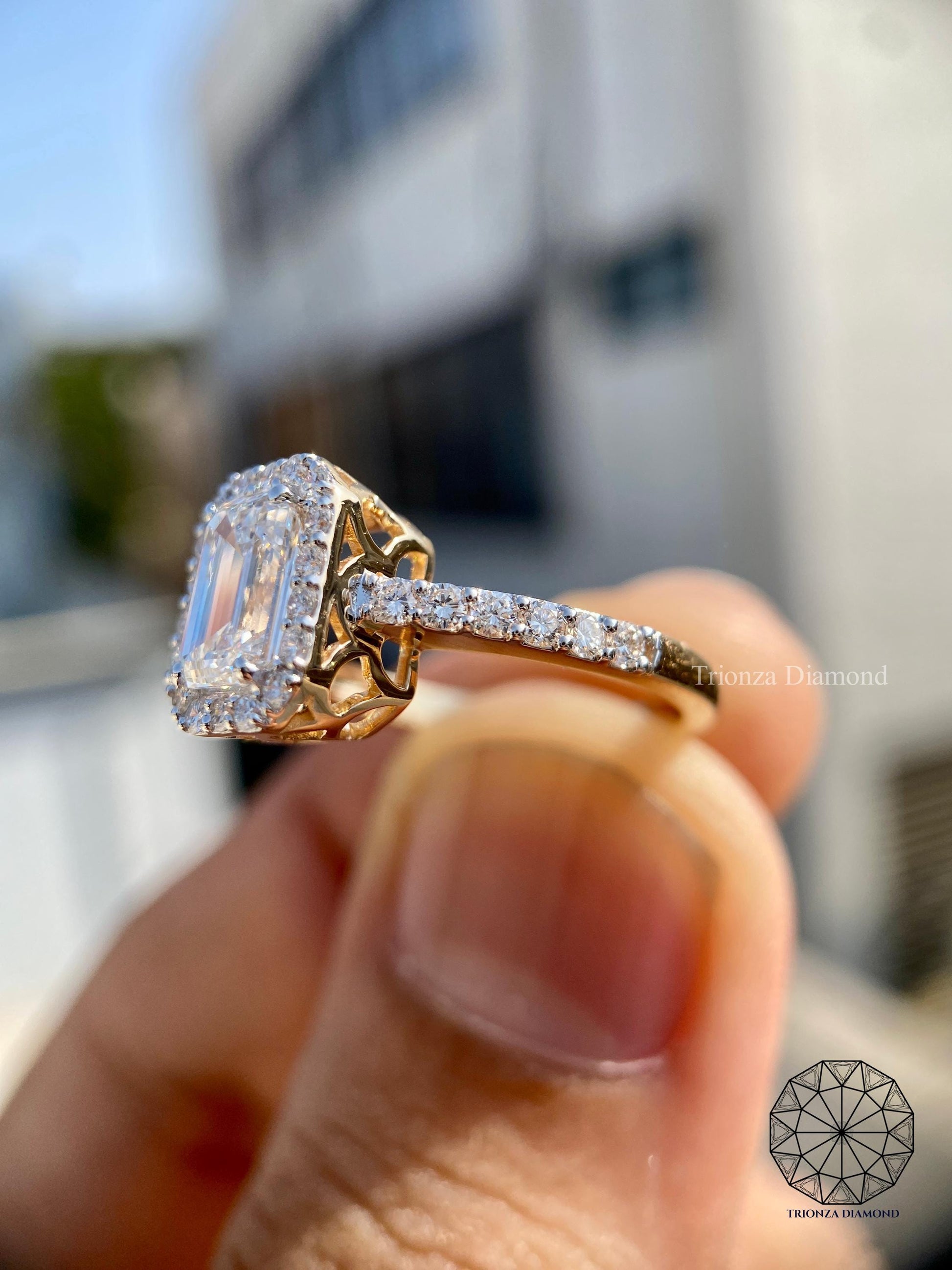Discover our stunning 1.50 CT D VVS2 Emerald Cut Lab Grown Diamond Halo Pave Engagement Ring. IGI certified for exceptional quality, this ring offers sustainable luxury, perfect as a wedding, anniversary, or special occasion gift for her.