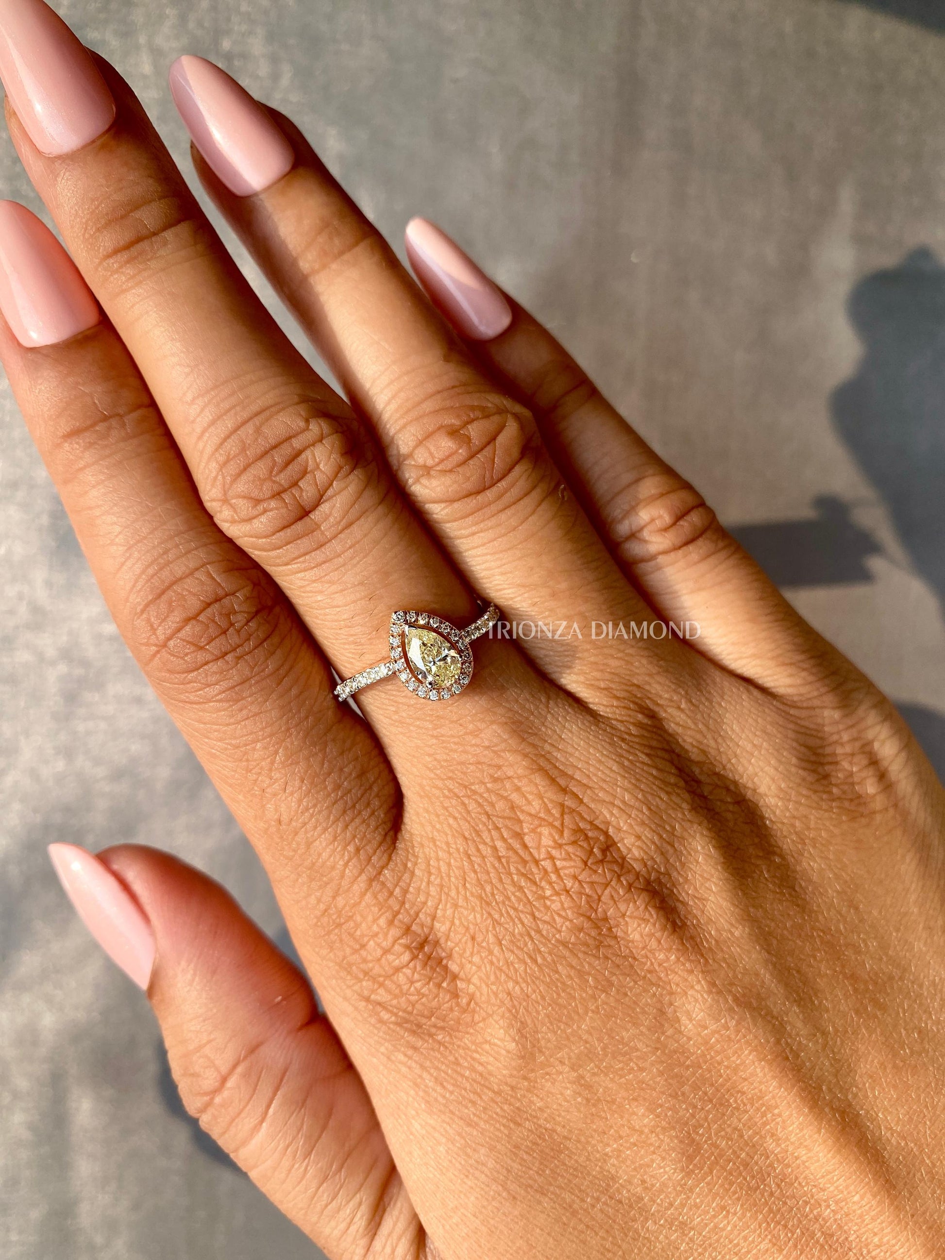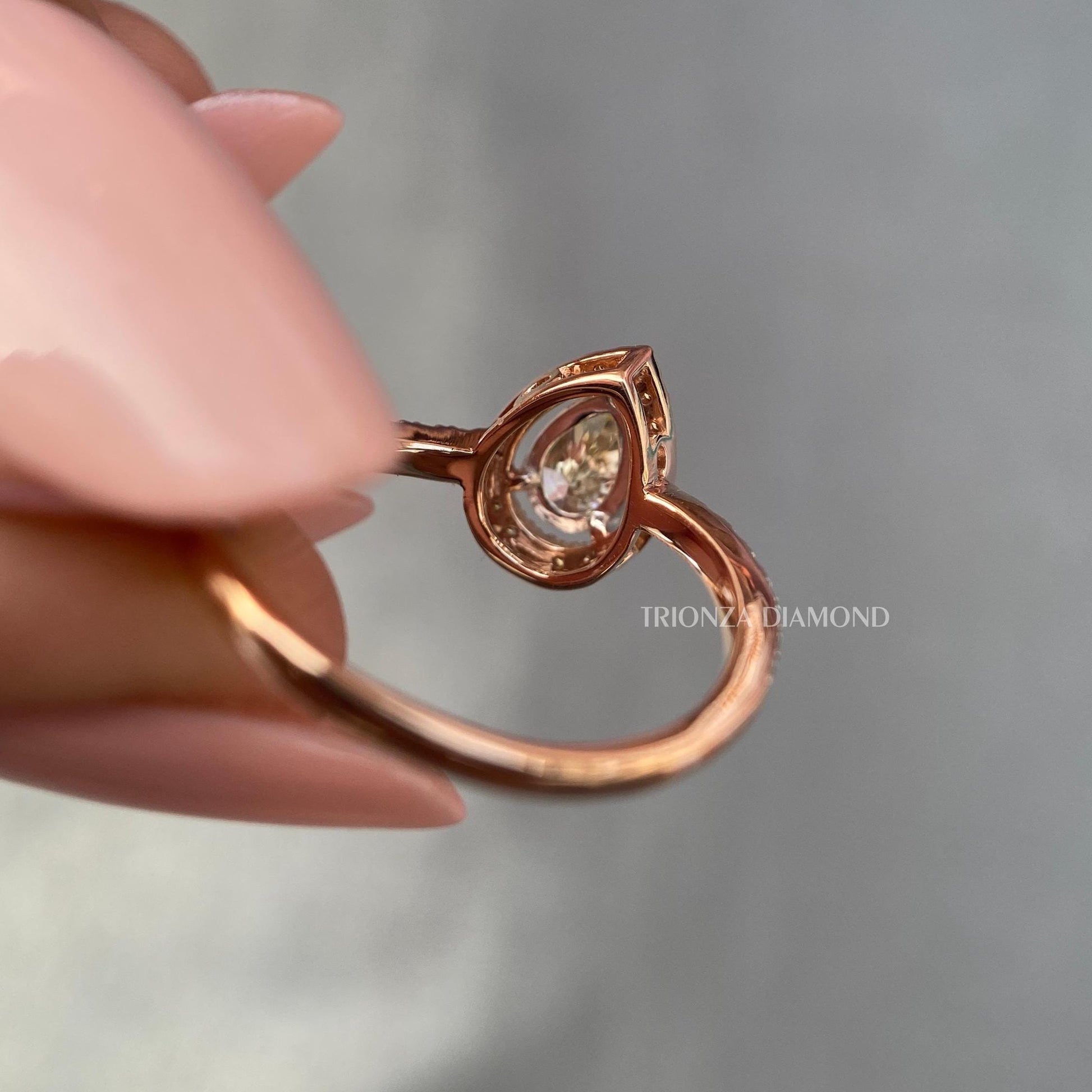 Discover our exquisite Intense Yellow 1.50 CT Pear Cut IGI Certified Lab Created Diamond Ring, featuring a fancy design in 14k Rose Gold. This conflict-free gold wedding ring for her is meticulously crafted with love by TRIONZADIAMOND. Our skilled craftsmen hand-craft, cut, and polish all stones to ensure the highest quality.