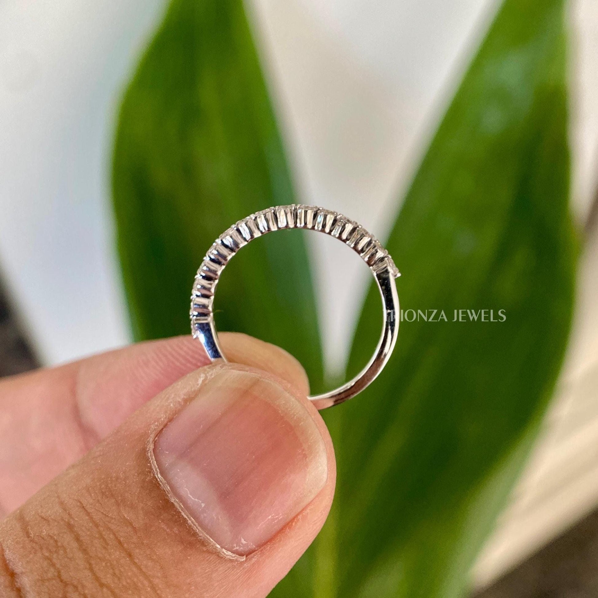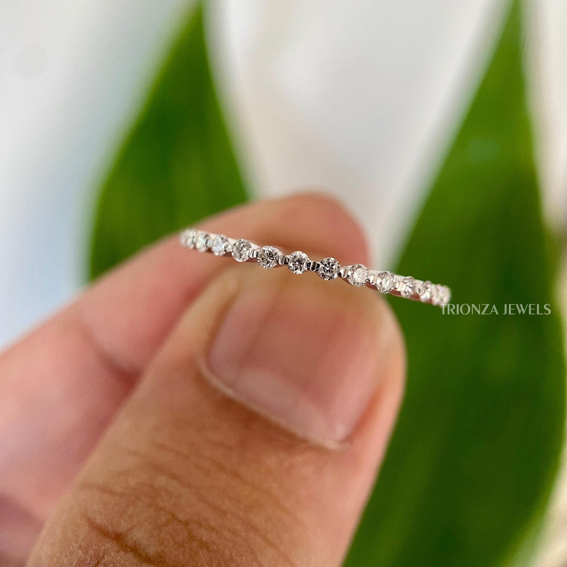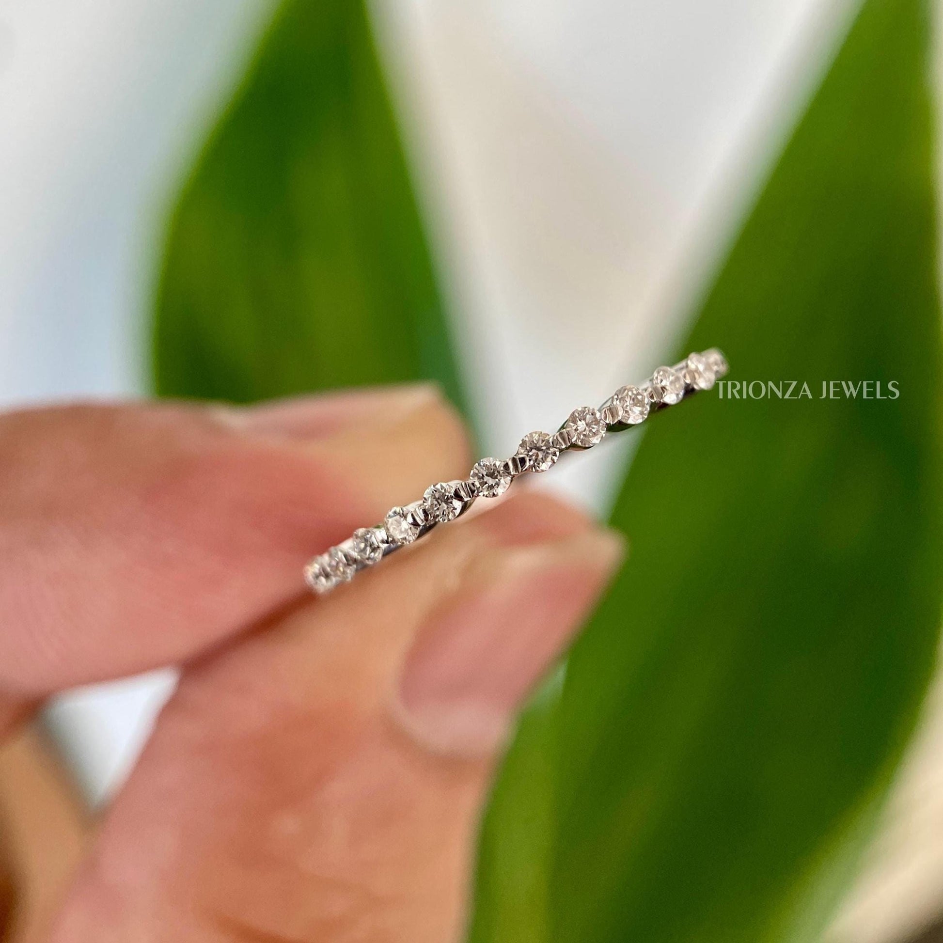 Discover our exquisite 1.50mm Round Cut Colorless Moissanite Wedding Band, a minimalist and elegant choice for any woman. This stunning half eternity band features a unique bubble prong setting, showcasing the brilliance of each 0.39 TCW VVS colorless moissanite.