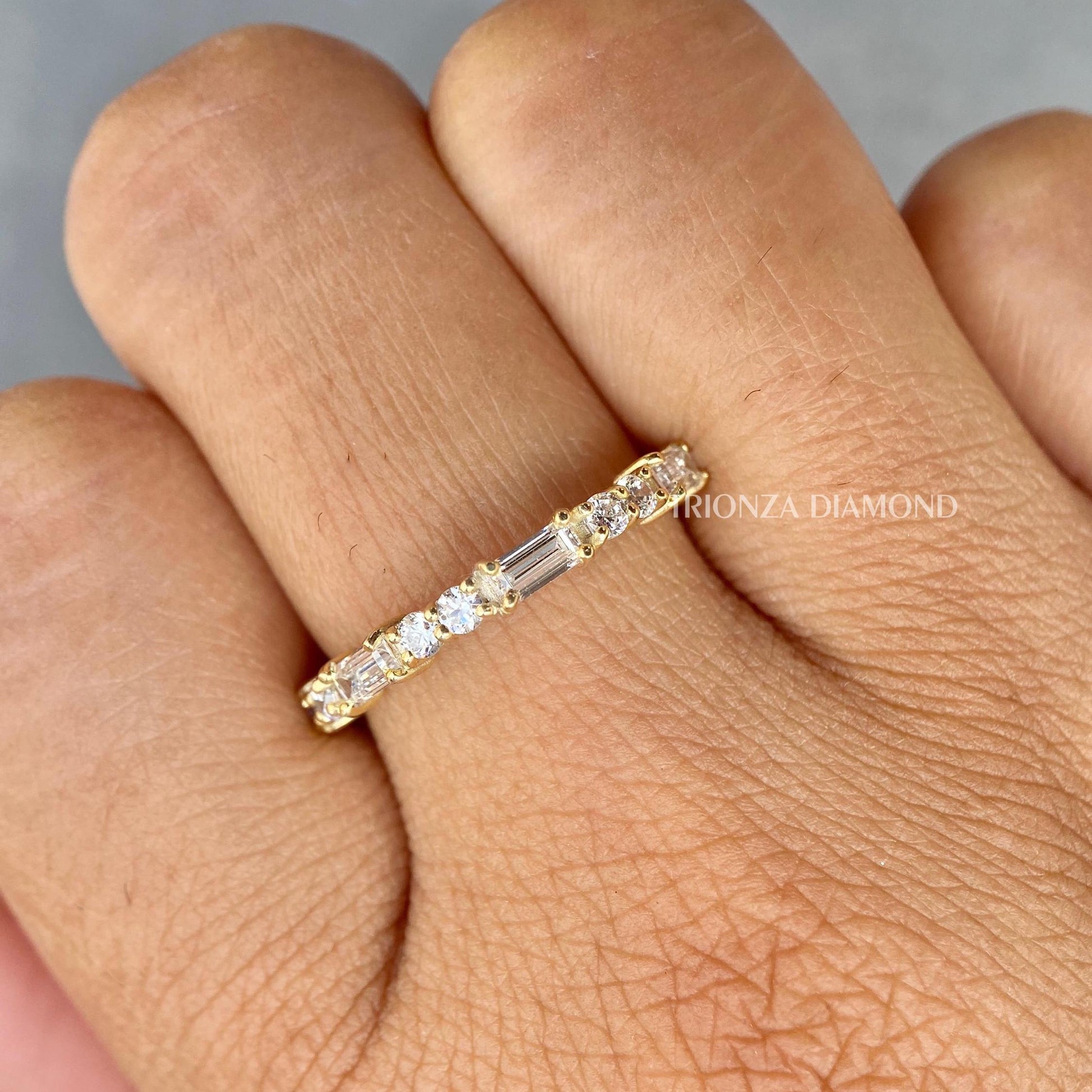 Discover timeless elegance with this exquisite Lab Grown Diamond Baguette Half Eternity Band from Trionza Diamond. Meticulously handcrafted, this 14k solid gold stacking ring is perfect for every occasion, offering sustainable luxury and exceptional craftsmanship.