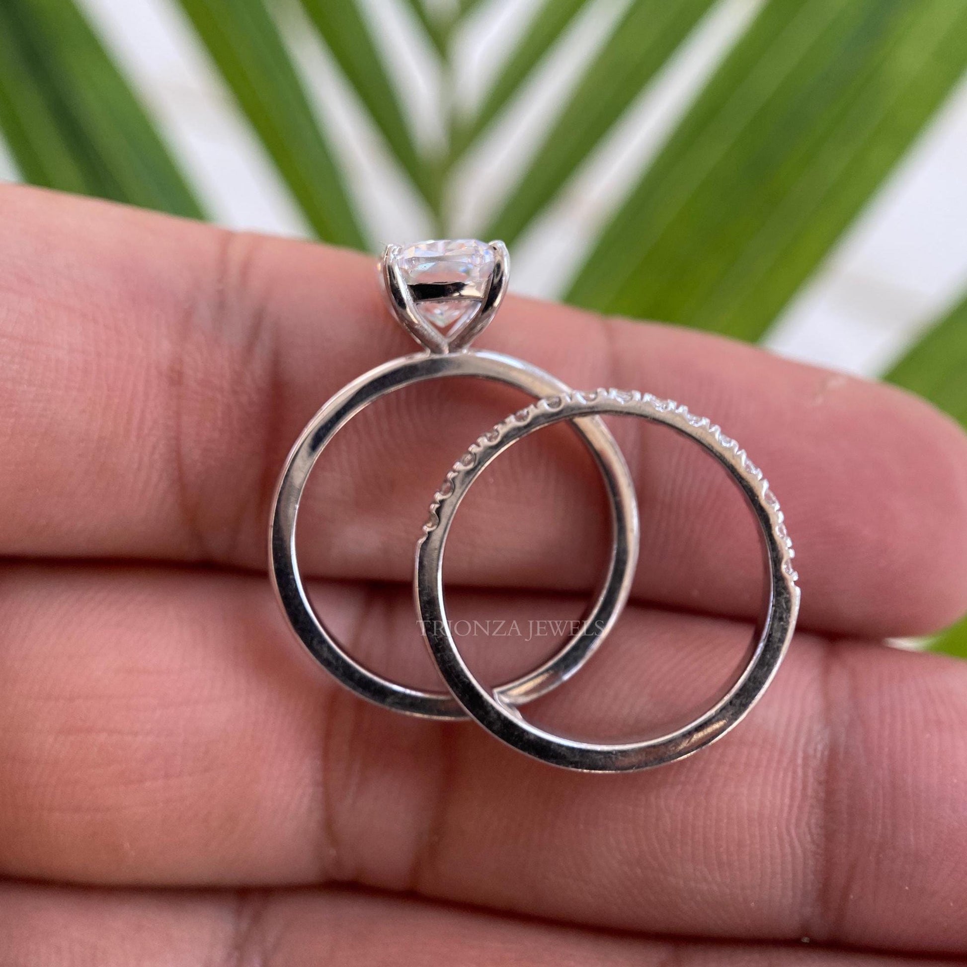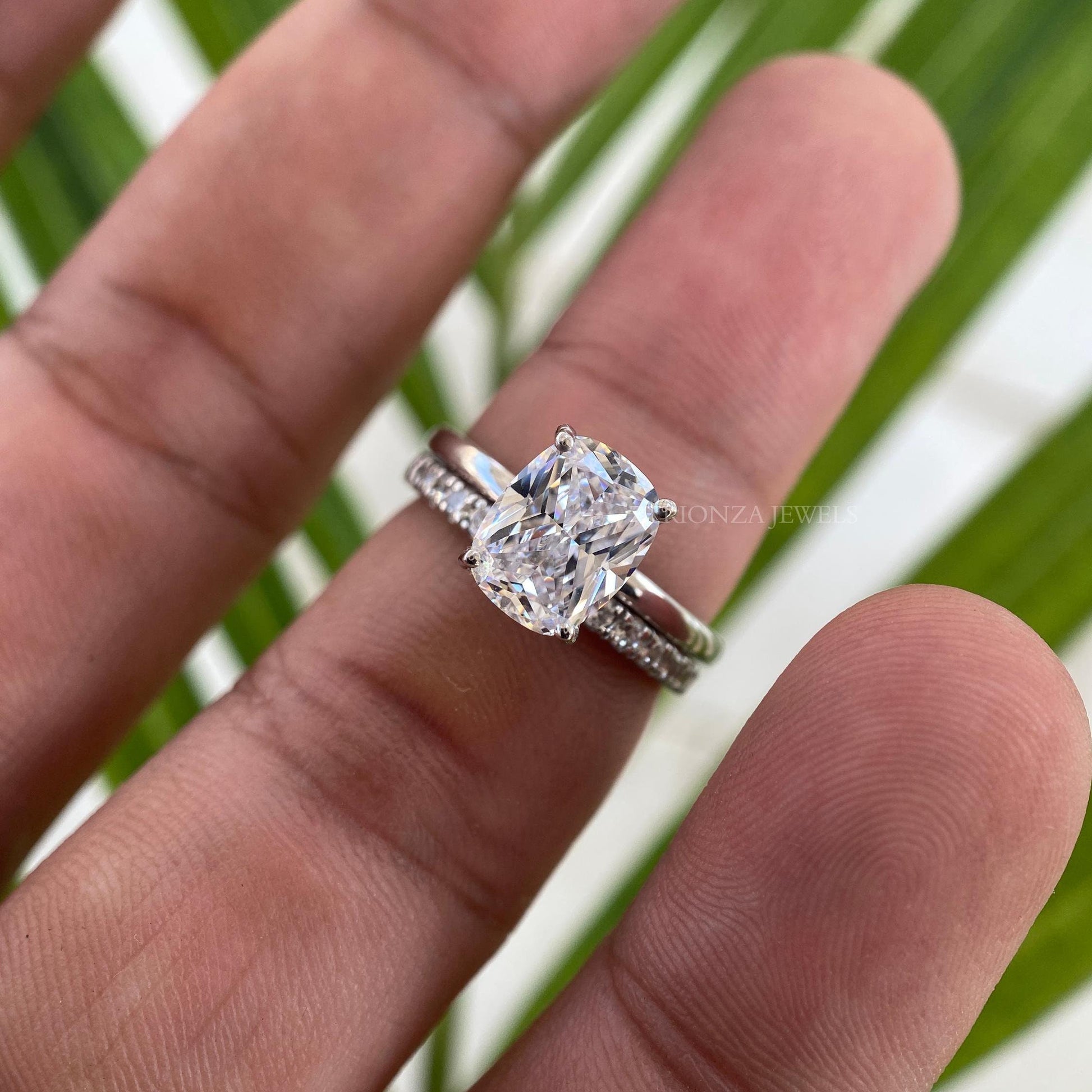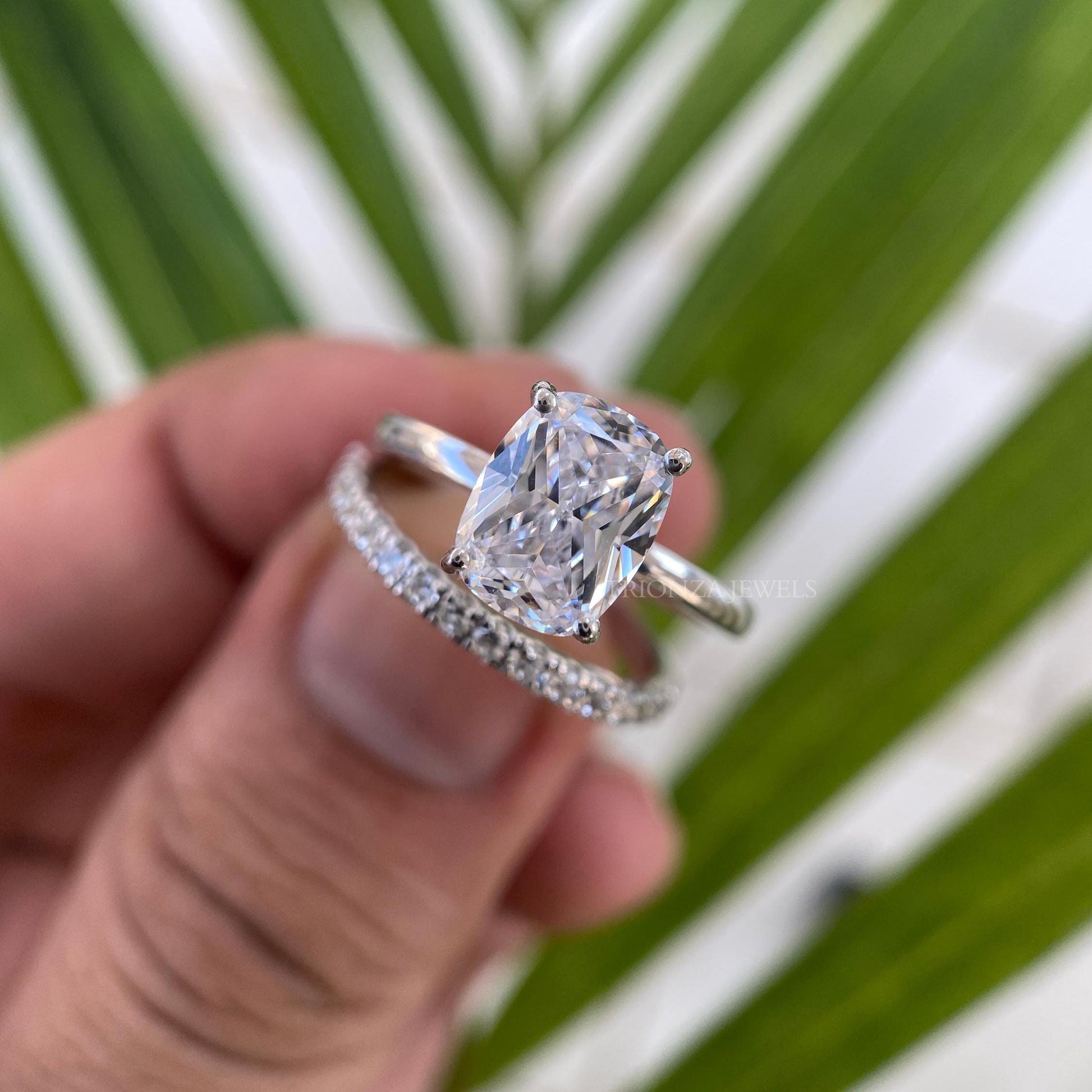Celebrate your special moments with this stunning 2.05 CT Ice Crushed Cushion Cut Moissanite Bridal Engagement Ring Set, a perfect anniversary gift for her. Crafted by TRIONZA JEWELS, this set embodies confidence and is an environmentally-friendly choice, also known as Eco-Friendly, Ethical, Sustainable, or Man-Made Diamond.