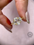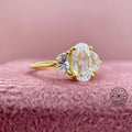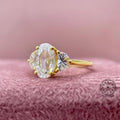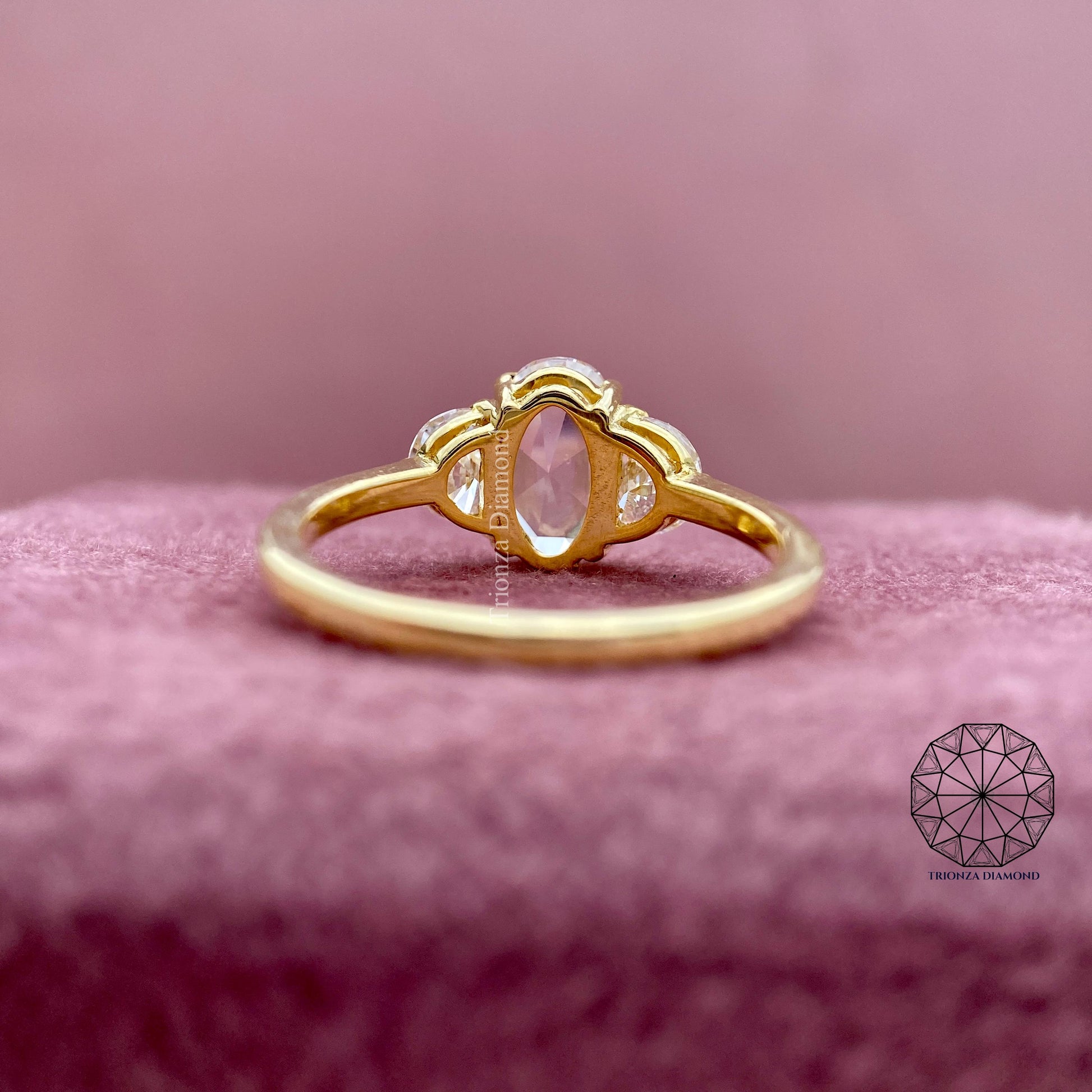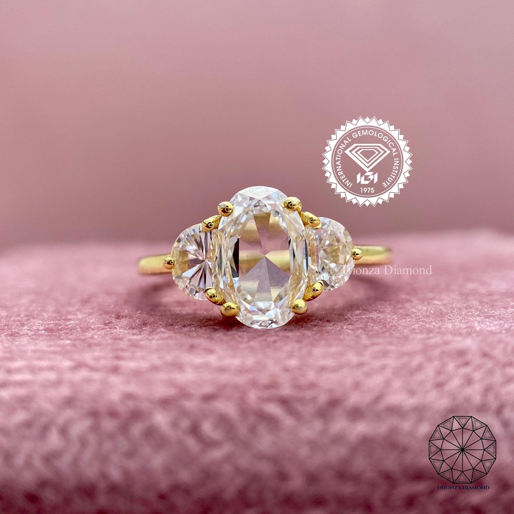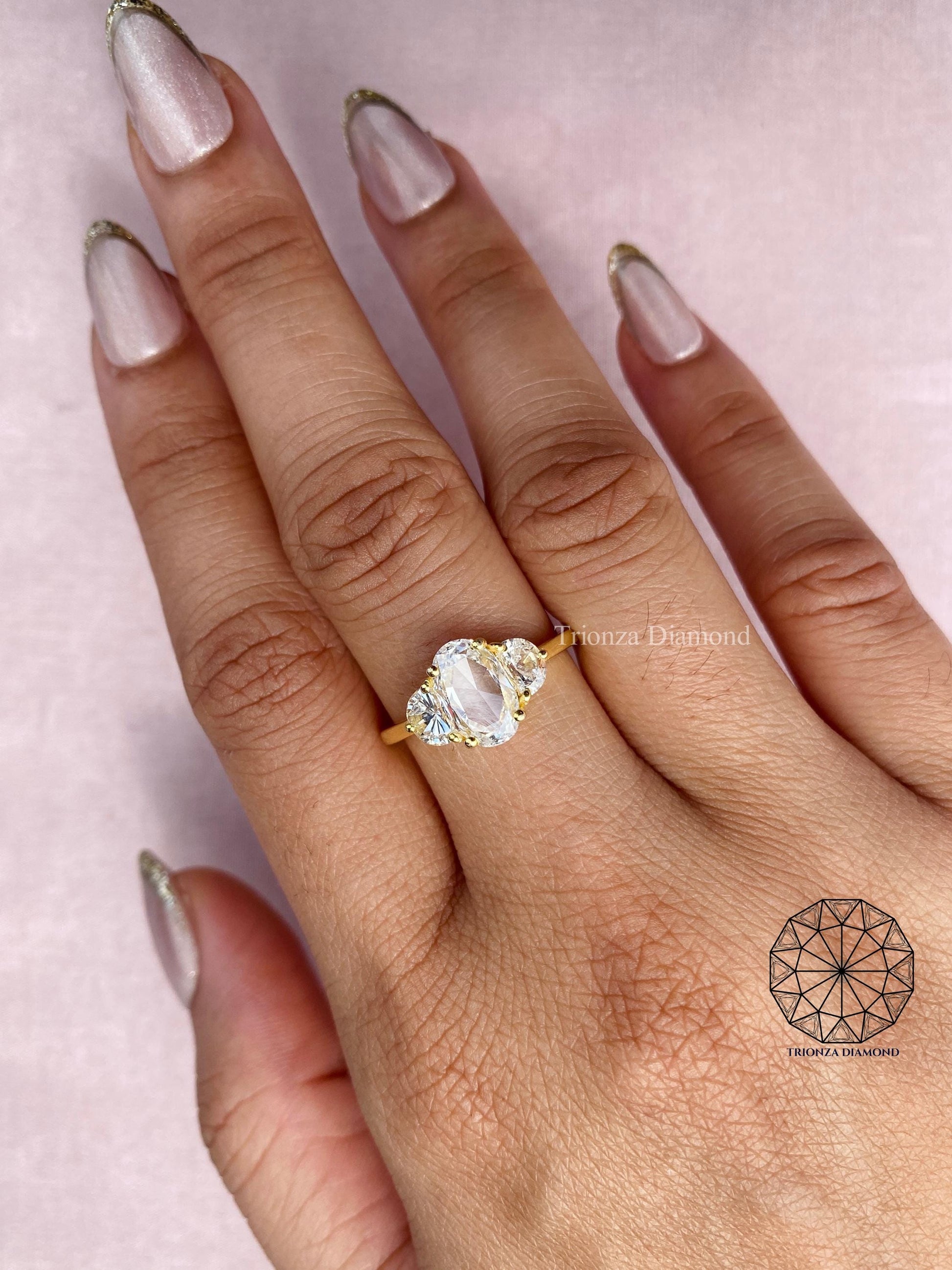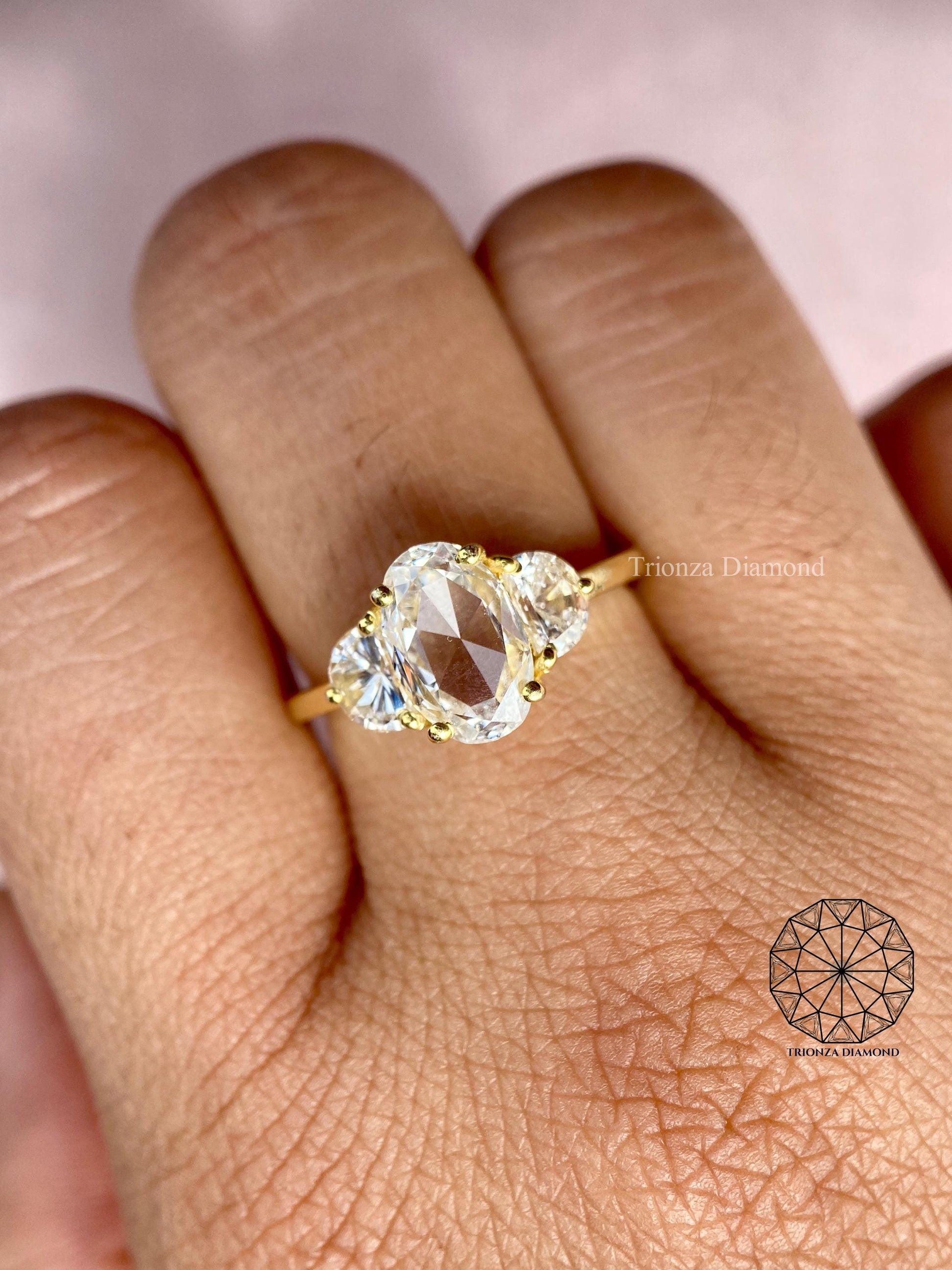 This stunning 2.46 TCW lab grown diamond ring features a captivating rose cut oval center diamond complemented by two elegant half moon side diamonds. Each diamond is IGI certified, ensuring exceptional quality and trust. This refined three-stone design is perfect for modern brides, symbolizing past, present, and future love. Ethically crafted, it's an ideal choice for an engagement or wedding ring, offering a classic-meets-contemporary flair. Celebrate timeless romance, ethical beauty, and a true connection with this exquisite piece.