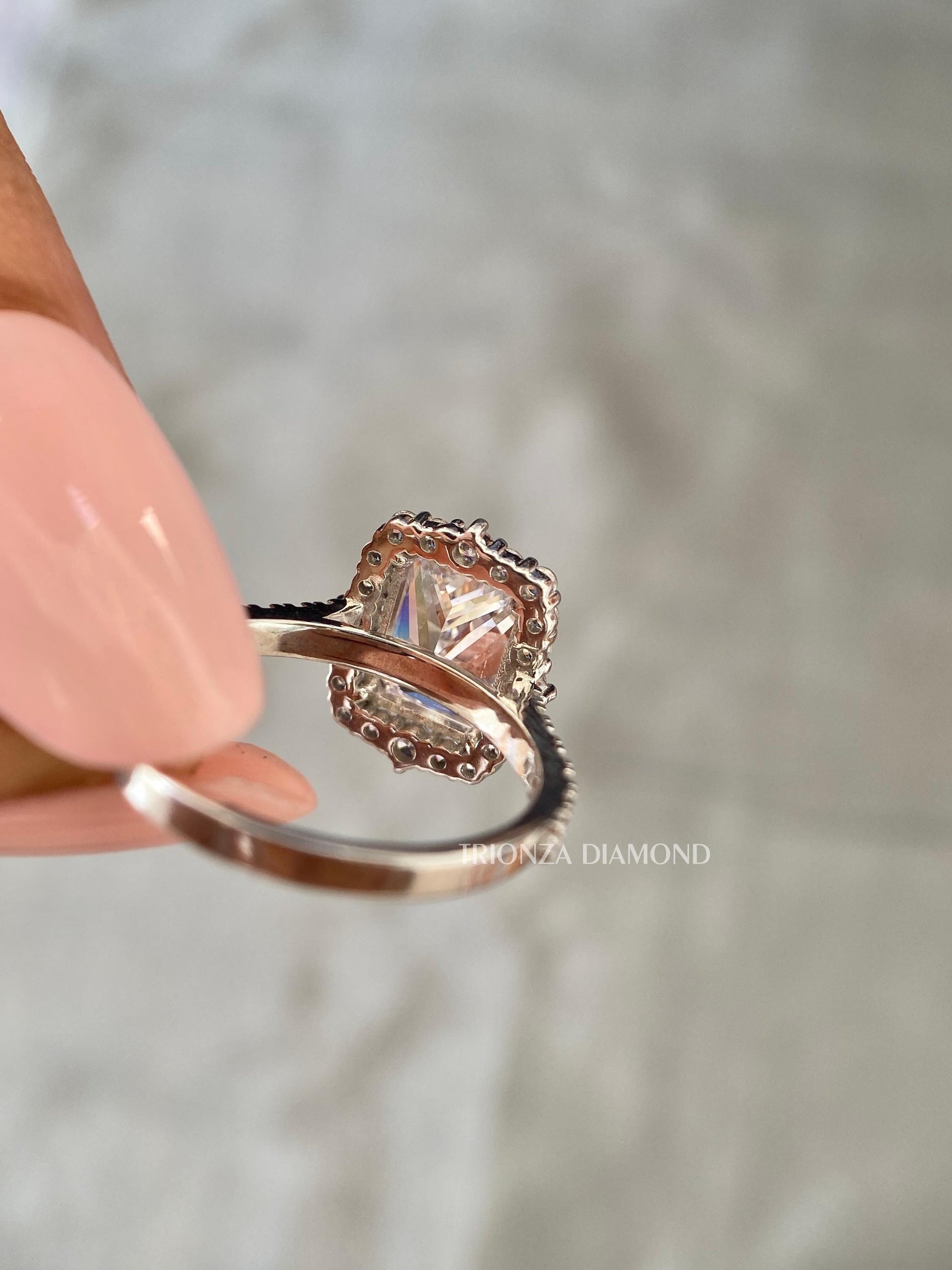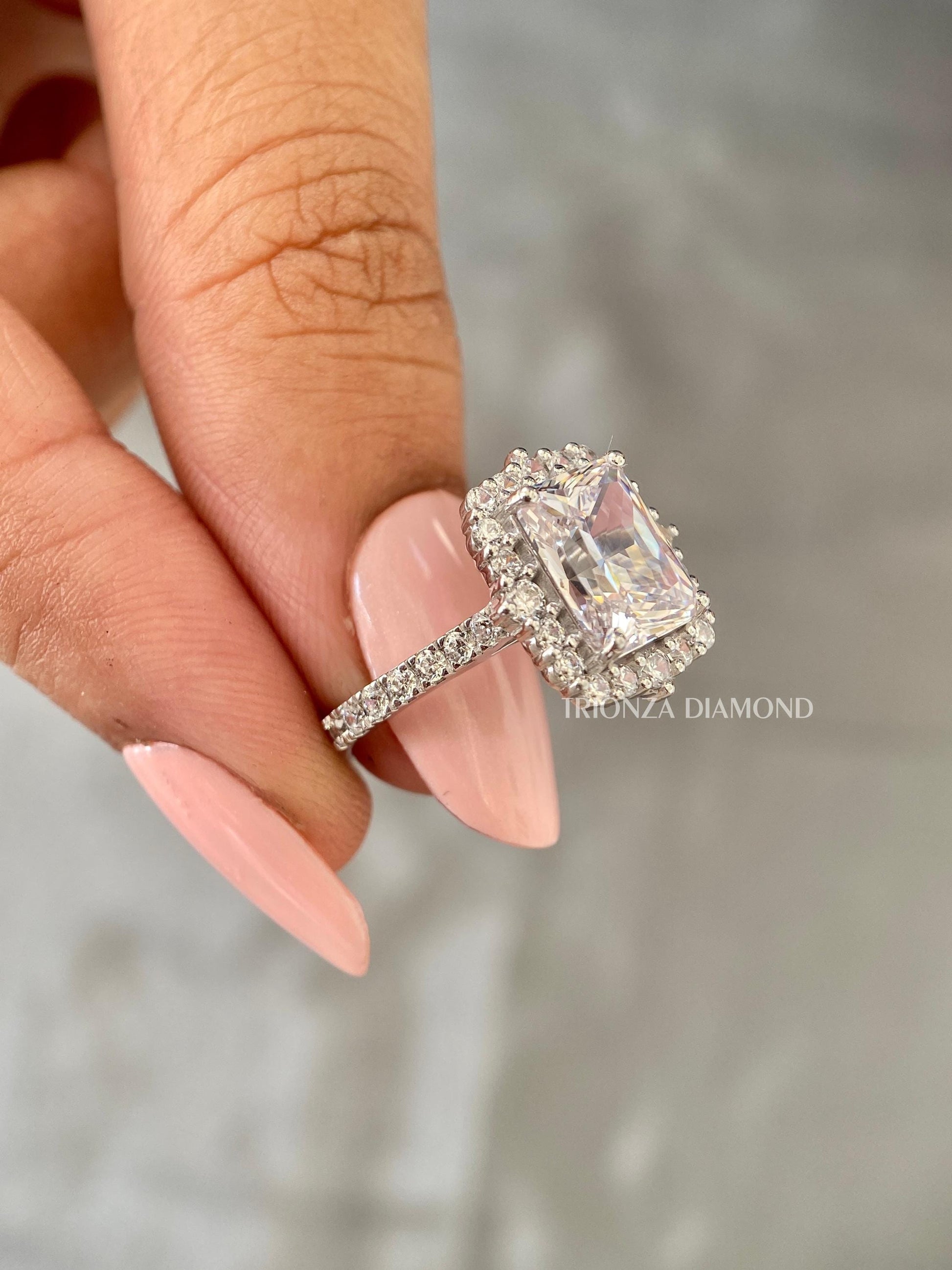 Discover our stunning 2.50 CT Radiant Lab Diamond Engagement Ring, a perfect symbol of love. This exquisite ring features an E/VS1 certified, eco-friendly, man-made diamond, beautifully set in a halo design.