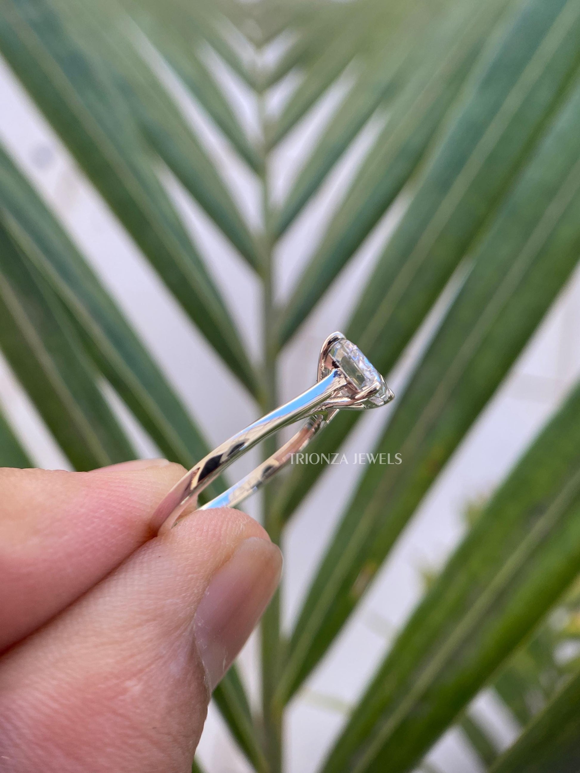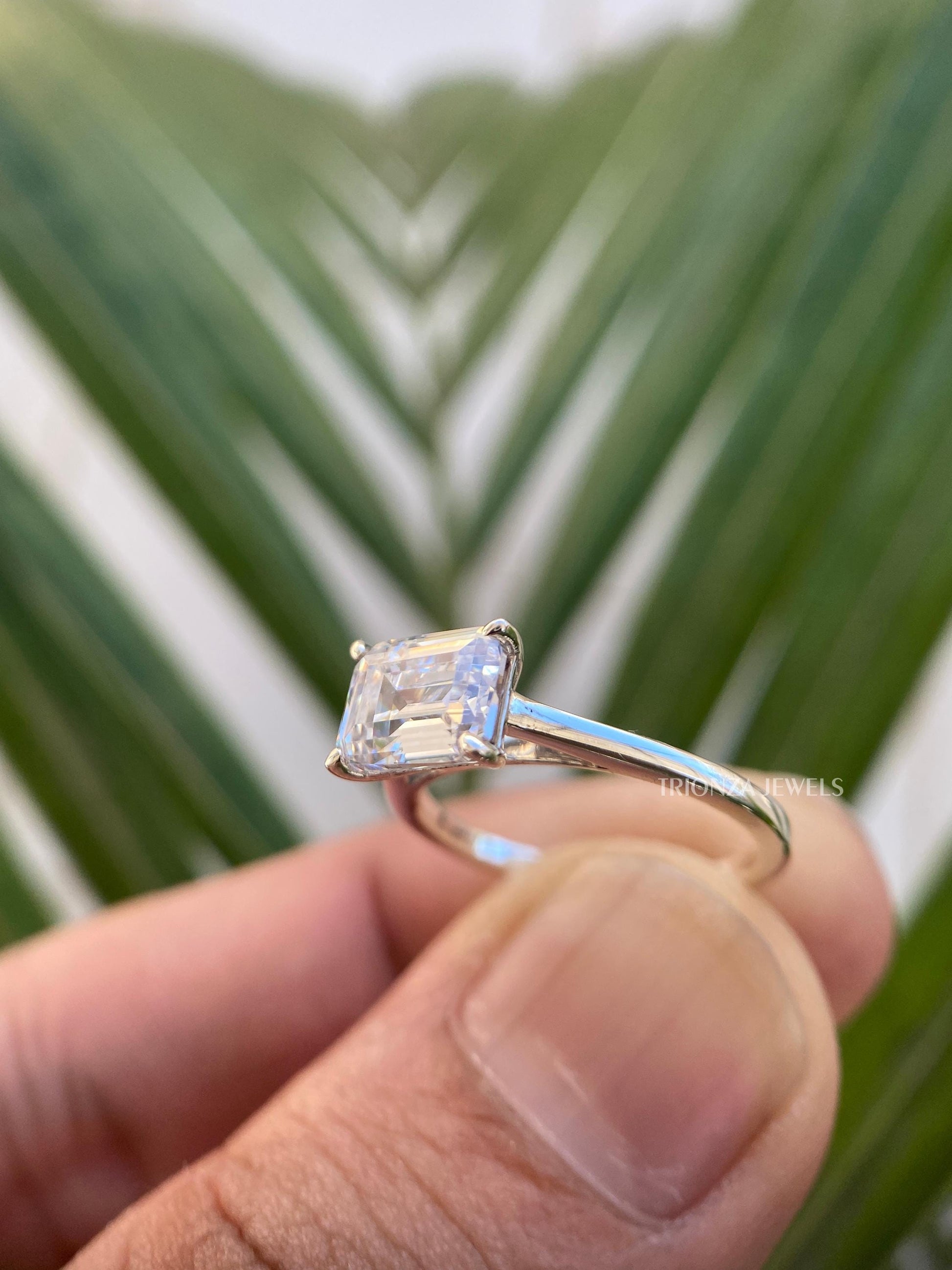 Discover our stunning 2 CT Emerald Cut East To West Engagement Ring, a perfect symbol of love. This exquisite solitaire wedding ring features a brilliant emerald cut Moissanite diamond, set with four claw prongs. An ideal choice for an anniversary, promise, or a special gift for her.