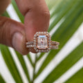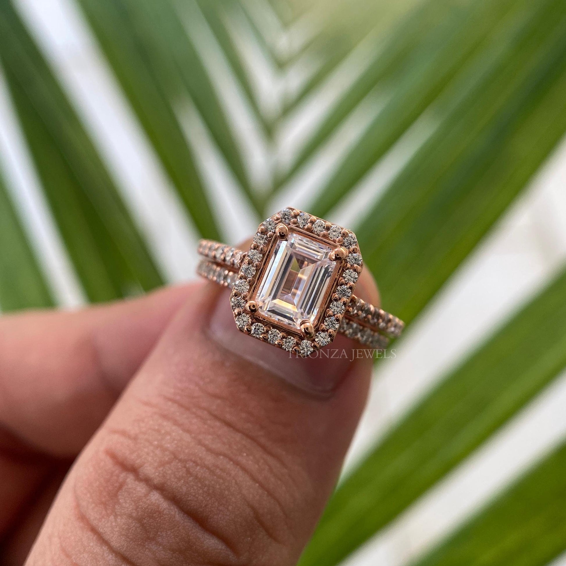 Discover our stunning Emerald Halo Setting Moissanite Bridal Set, featuring a 2 CT Emerald VVS Moissanite. This exquisite set includes a flush eternity band crafted in 14K Solid Gold, perfect as an engagement ring, wedding ring, or a special gift for her. Ideal for anniversaries, proposals, or simply as a beautiful promise ring.