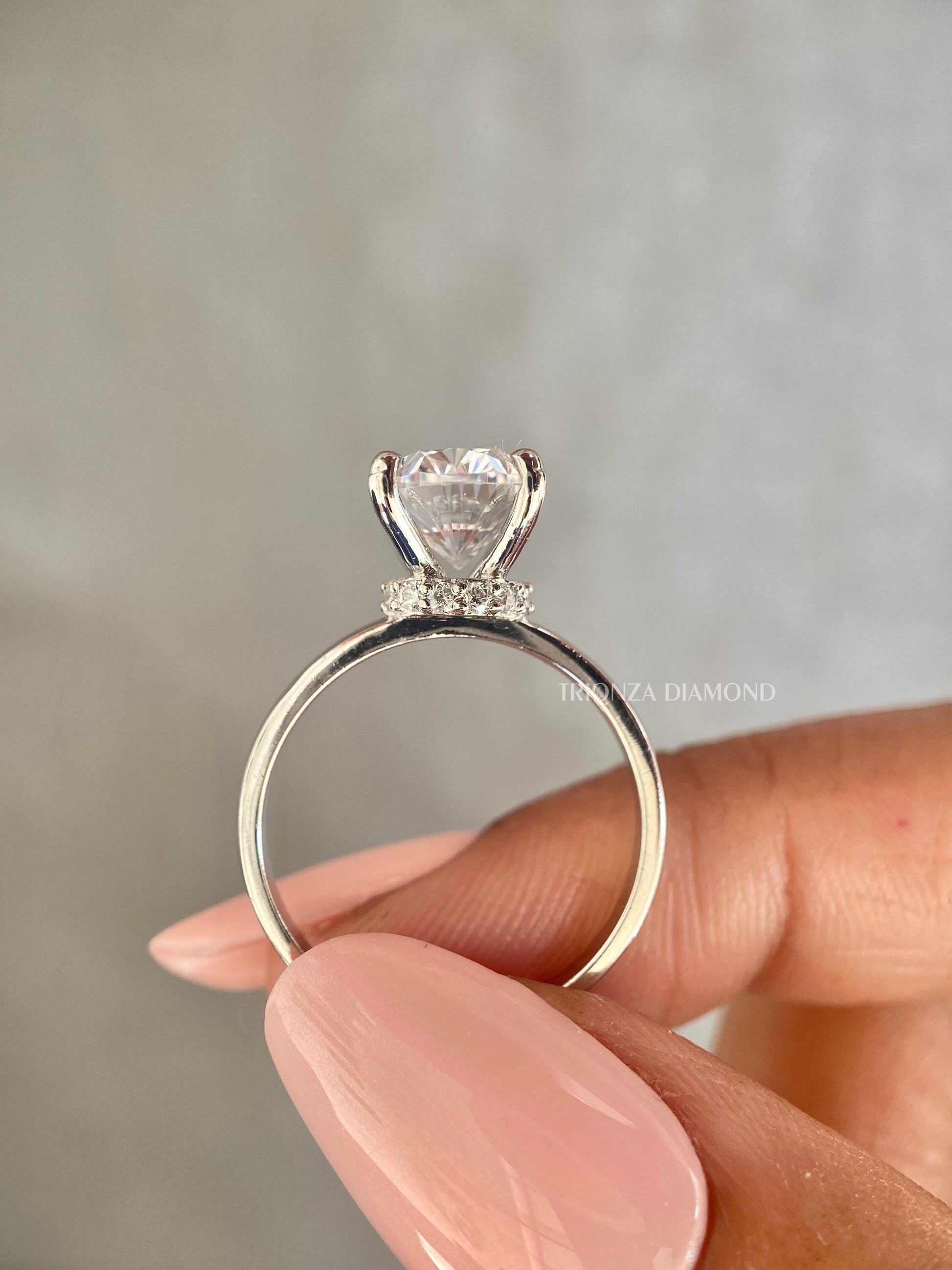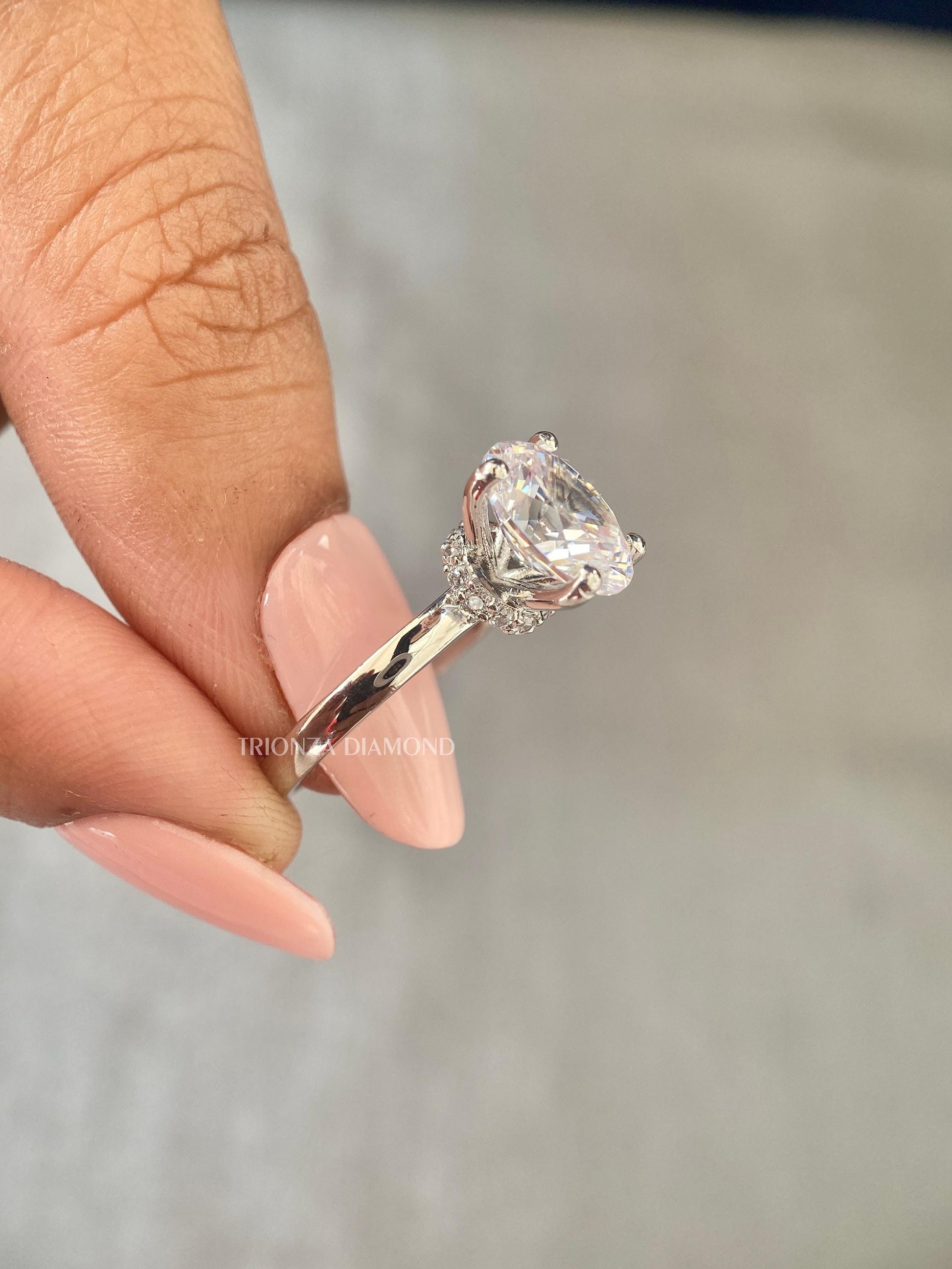 Celebrate your love with this exquisite 2 CT Oval Lab Grown Diamond Hidden Halo Engagement Ring. Featuring a unique hidden halo design, this oval cut solitaire ring is perfect for engagements, anniversaries, or a special gift. All our diamonds are 100% pure lab-grown (CVD), offering an eco-friendly and conflict-free choice, made with love by TRIONZADIAMOND.