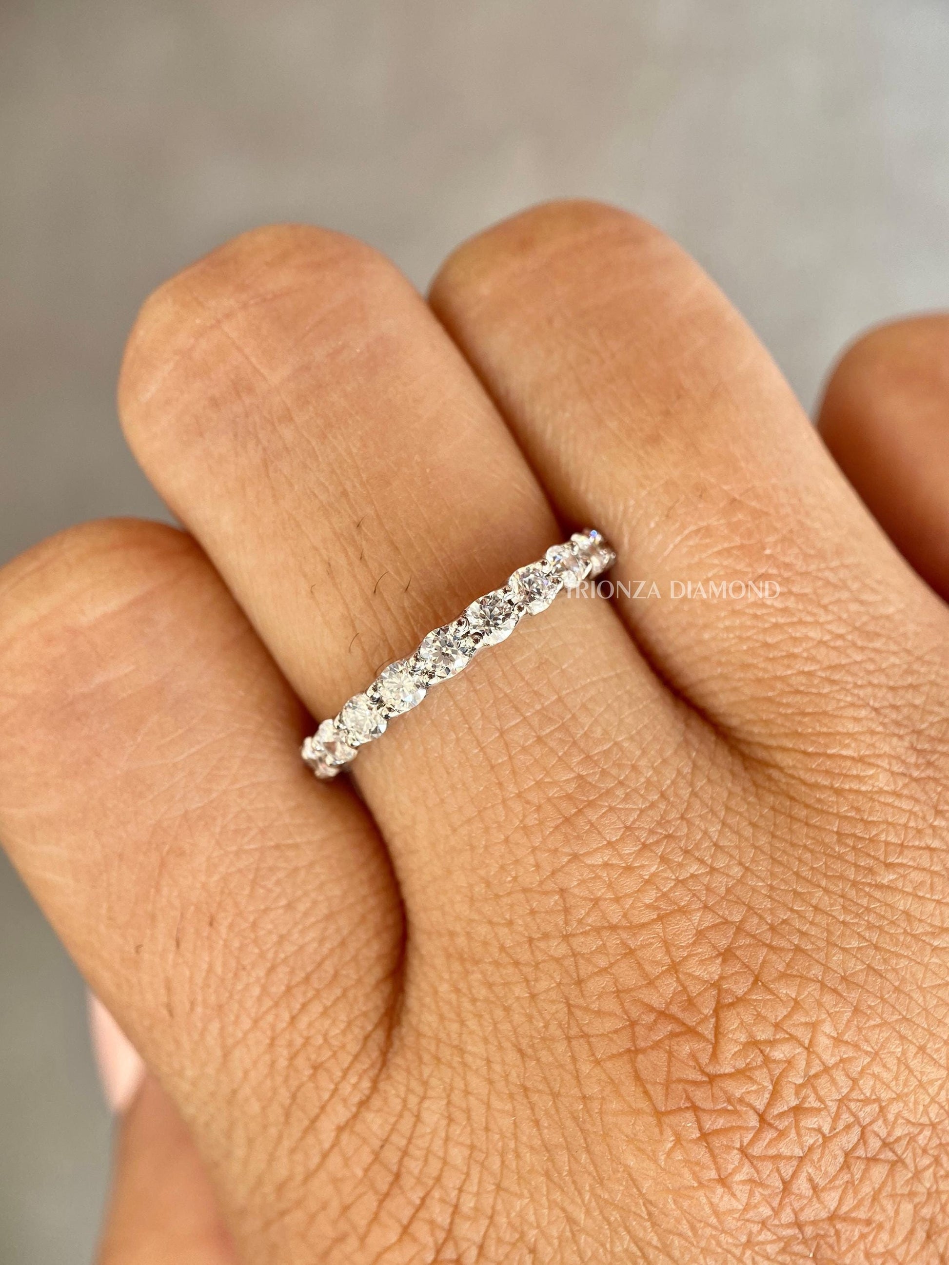 Discover our exquisite custom order of two platinum bands, featuring a 2.5mm lab-created diamond eternity wedding band with 11 U-prong set stones. All diamonds are 100% pure lab-grown.