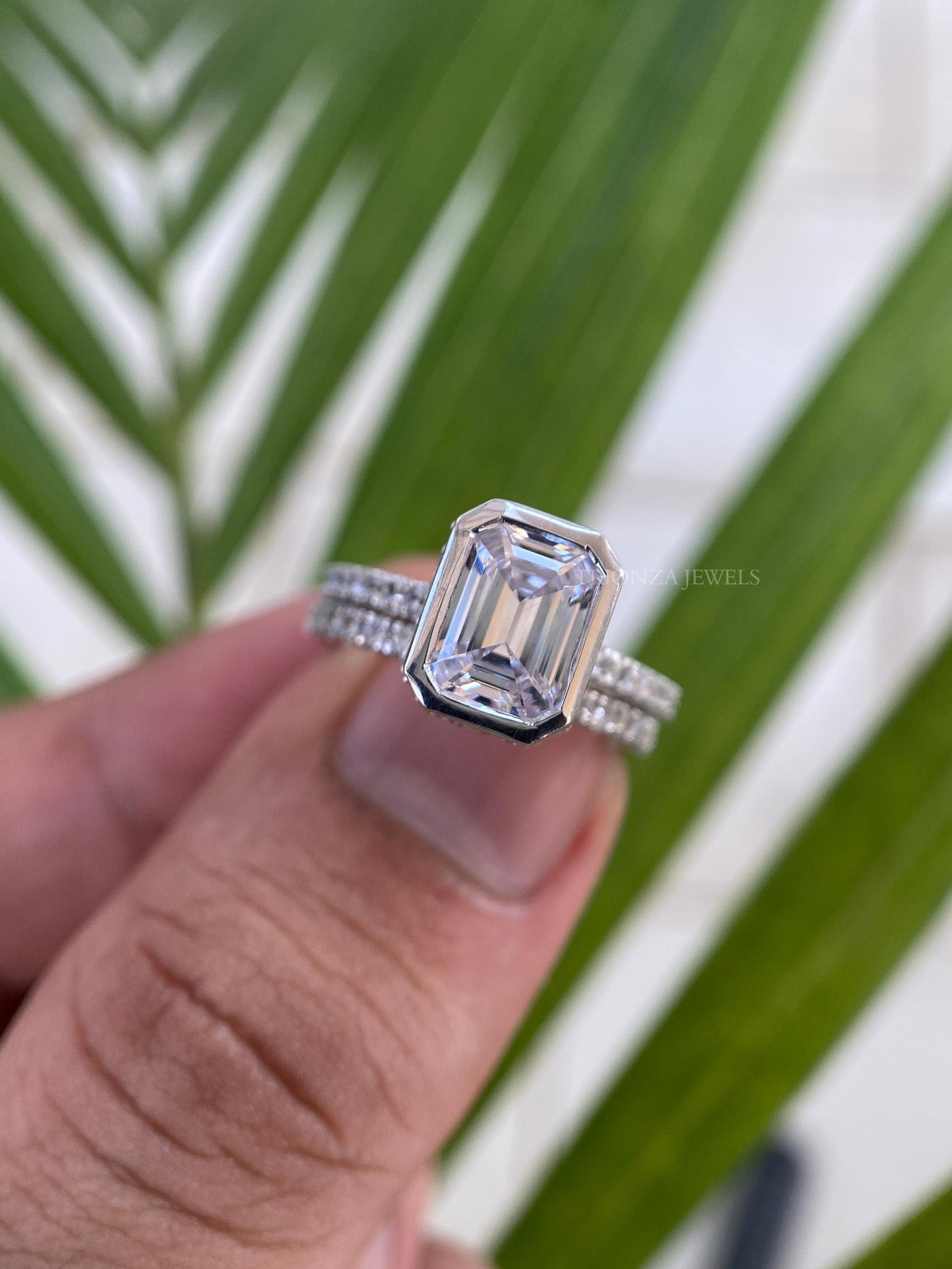 Discover our stunning 2ct Emerald Cut Moissanite Bridal Set, perfect for weddings, anniversaries, or as a timeless engagement ring. This elegant set features a brilliant emerald cut moissanite in a bezel setting, crafted in your choice of 14K solid gold.