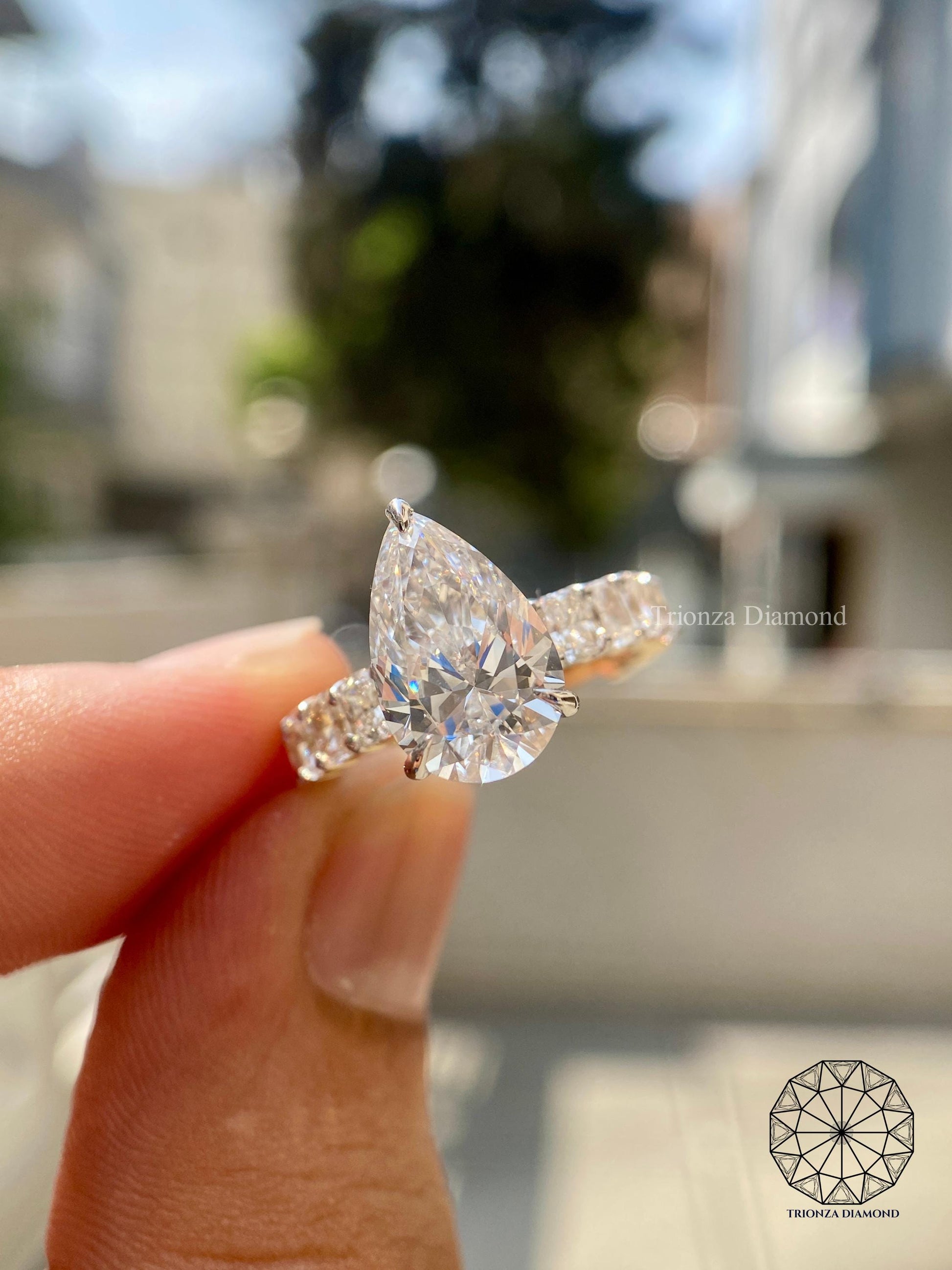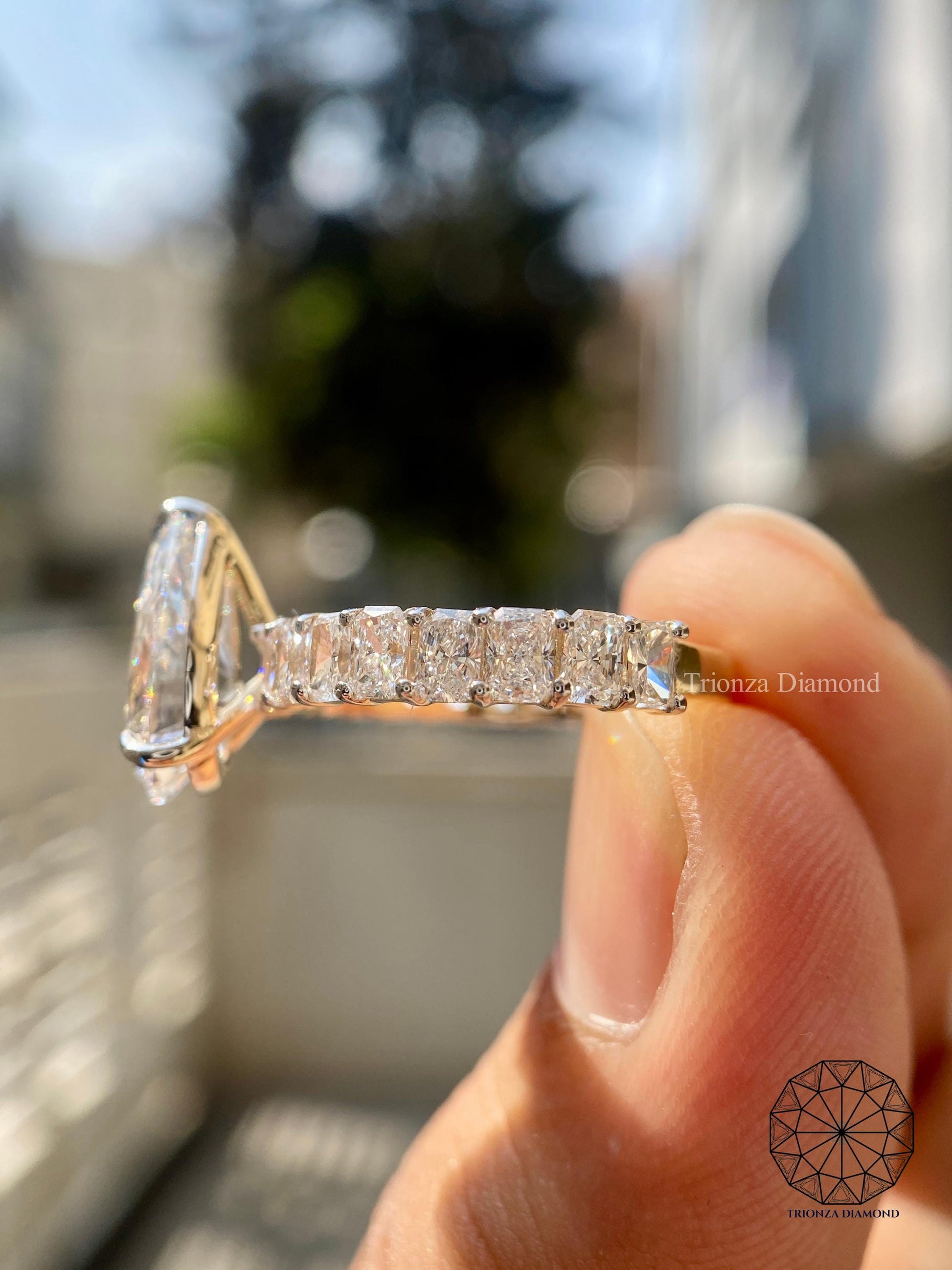 This stunning 2CT Long Pear Cut Lab Grown Diamond Ring with a Radiant Pave Band is IGI Certified, making it a perfect choice for an engagement, wedding, or promise gift. Its exceptional craftsmanship ensures it will be a lifelong keepsake.