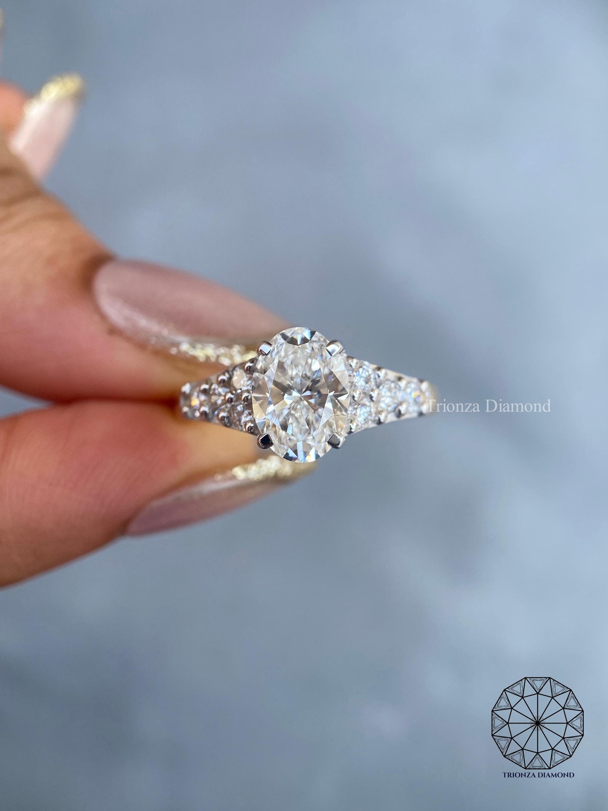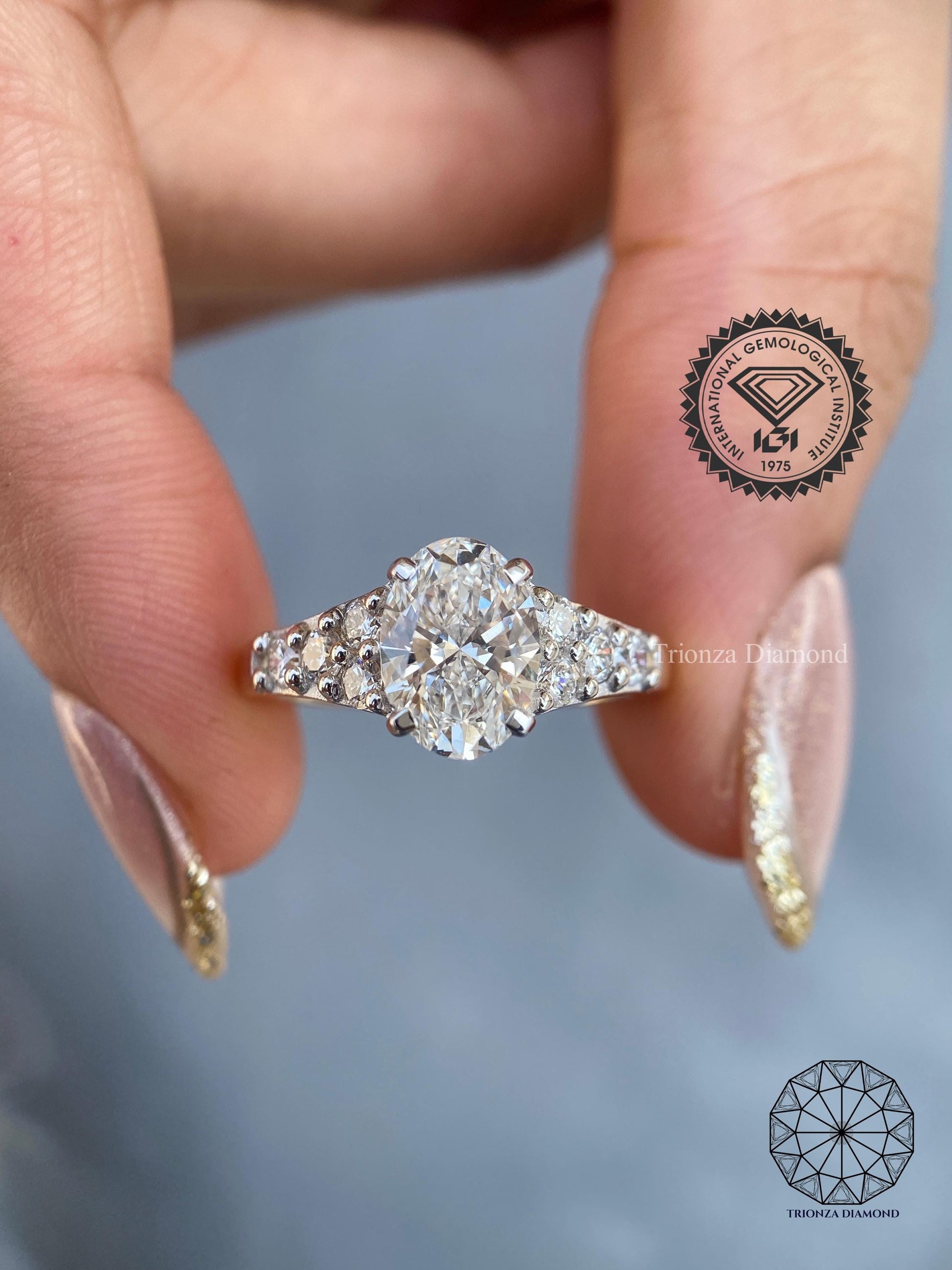 2CT Oval Cut Lab Grown Diamond D VVS2 Ring with Side Round Diamonds, IGI Certified Engagement Ring, Wedding Promise Gift Ring, Bridal Jewelry. Forever love diamond ring, oval cut engagement ring, IGI certified jewelry, stunning bridal design, VVS2 clarity brilliance, lab grown diamond luxury, romantic wedding band, perfect gift jewelry.
