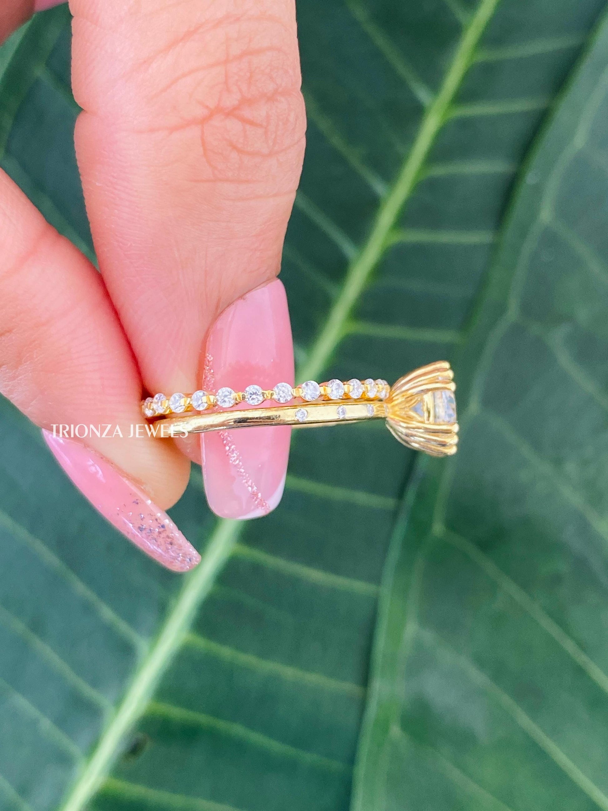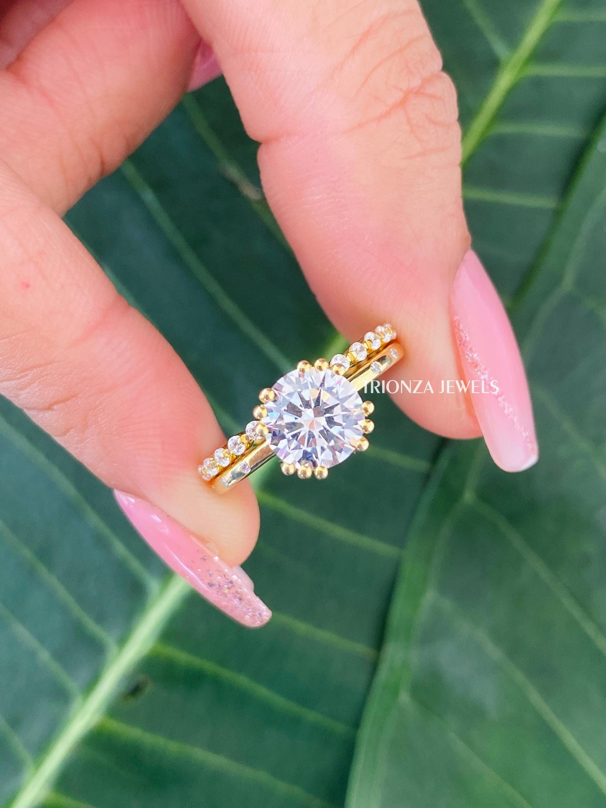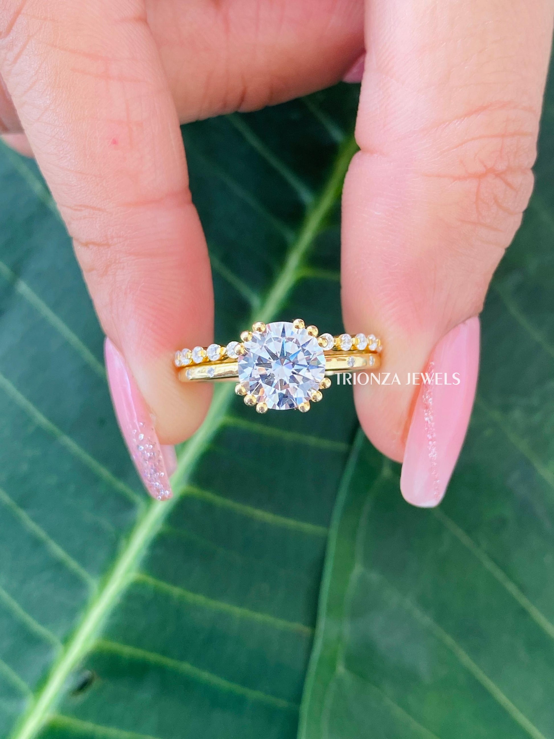 This exquisite 2 CT Round Cut Moissanite Diamond Bridal Set from TRIONZA JEWELS is perfect for your special day. Designed with confidence and an environmentally-friendly approach, our moissanite diamonds are also known as Eco-Friendly, Ethical, Sustainable, or Man-Made Diamonds.