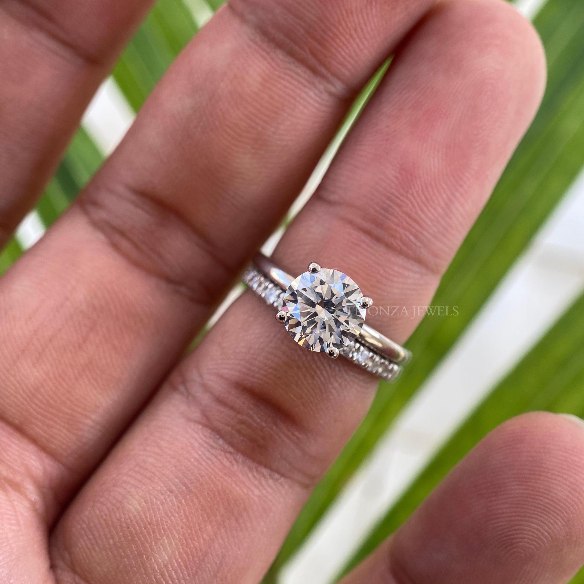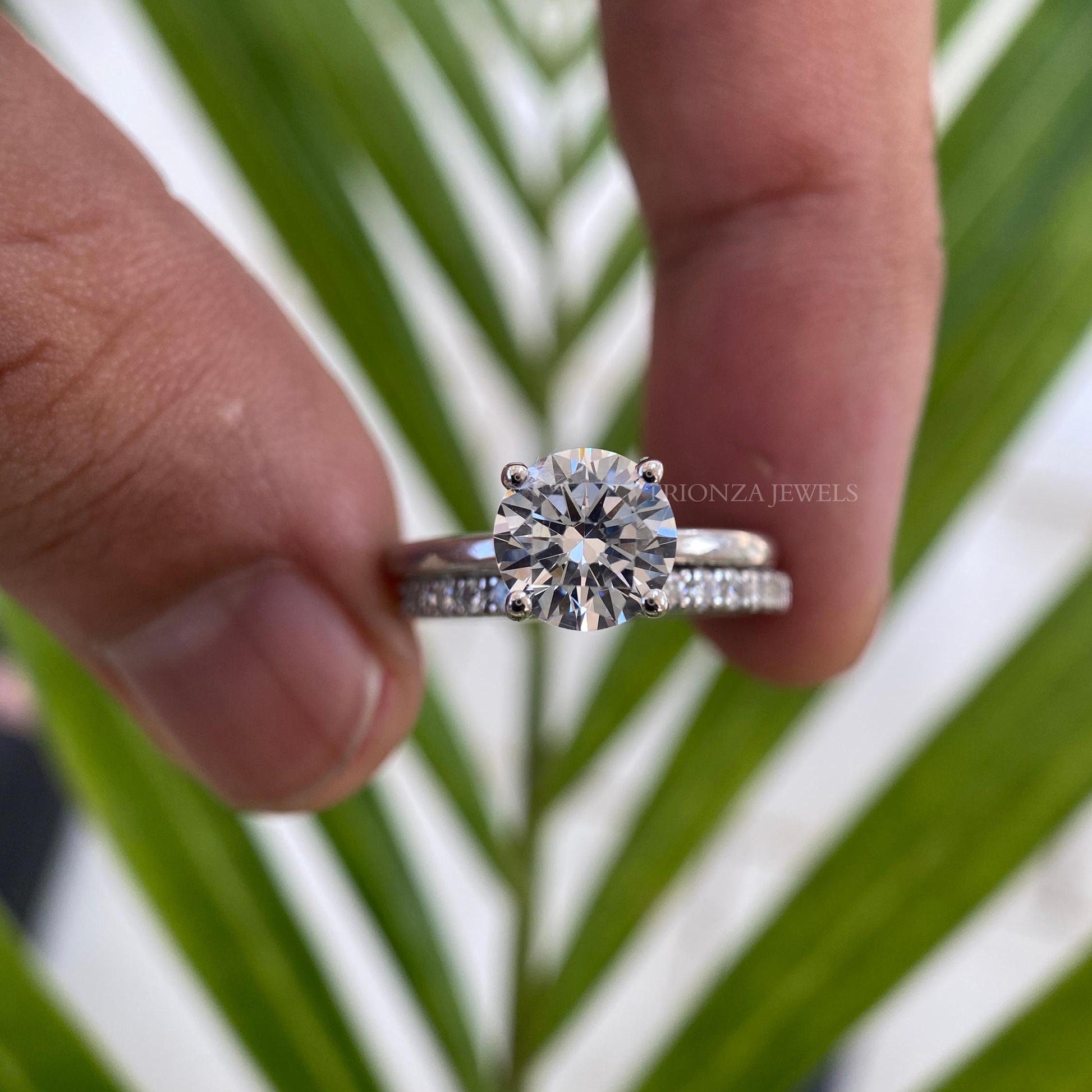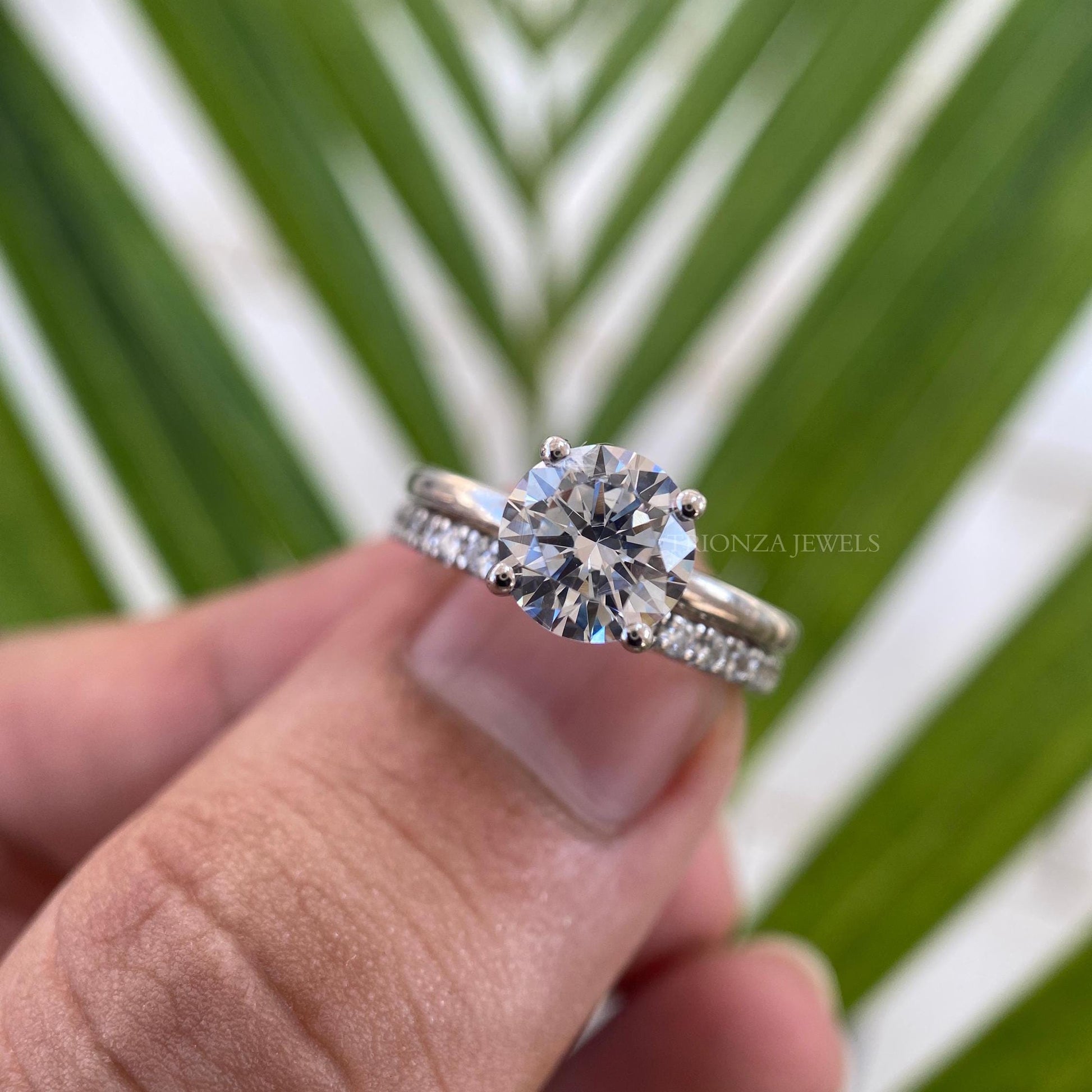 Elevate your special moment with our exquisite Round Cut Moissanite Diamond Bridal Set. This stunning 2 carat solitaire ring, accompanied by a flush set band, is crafted in radiant 14K gold, perfect for the modern bride.