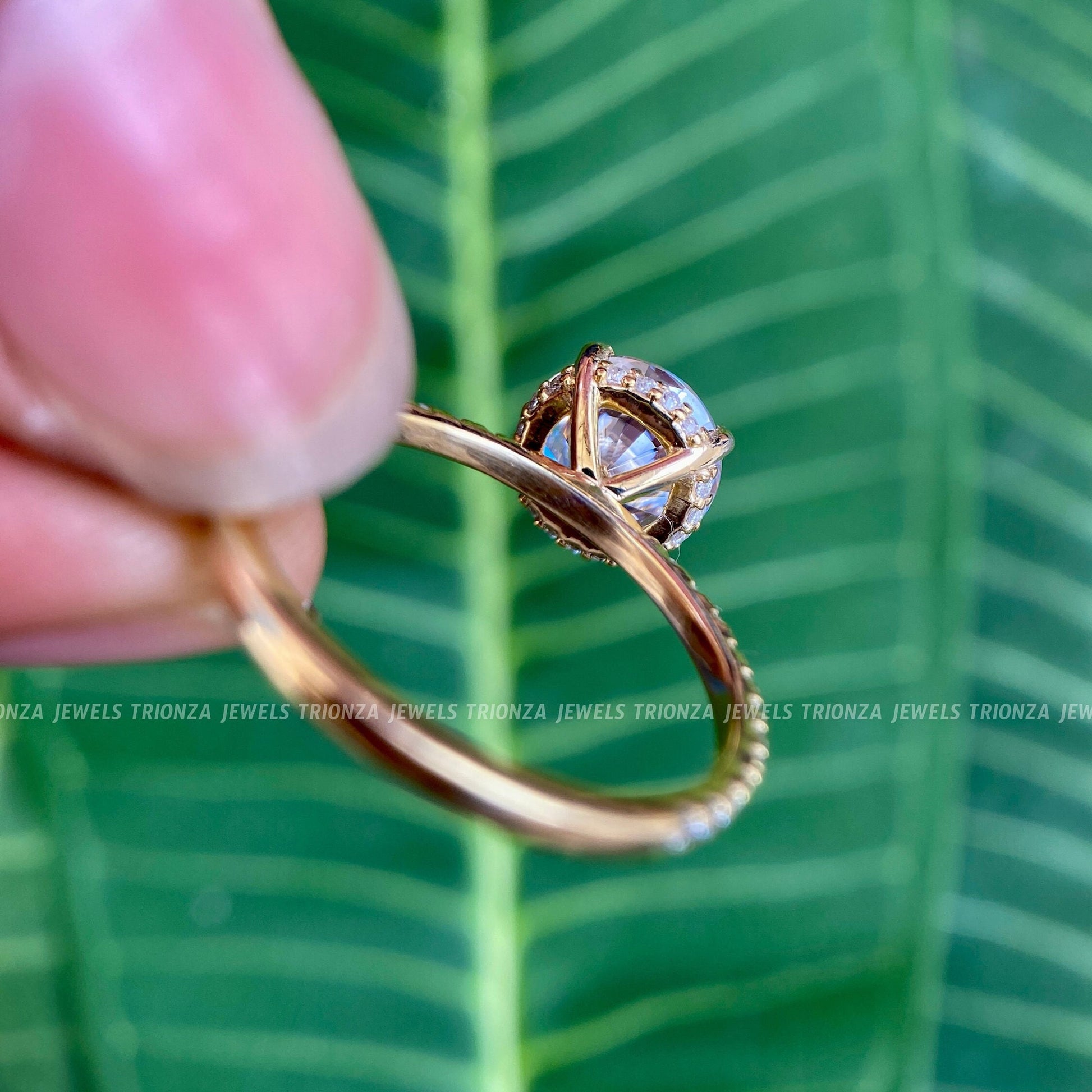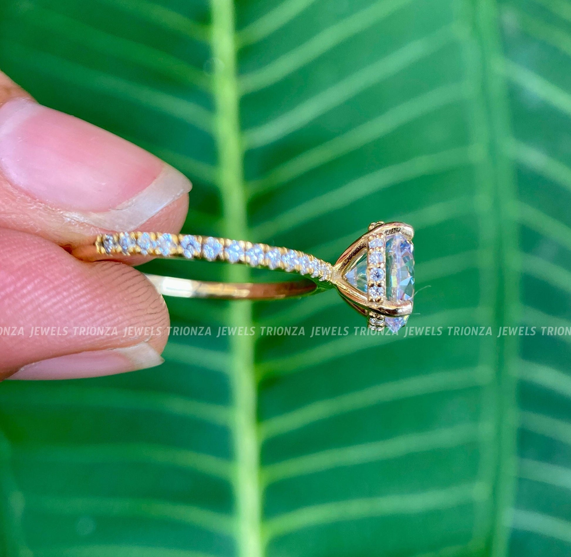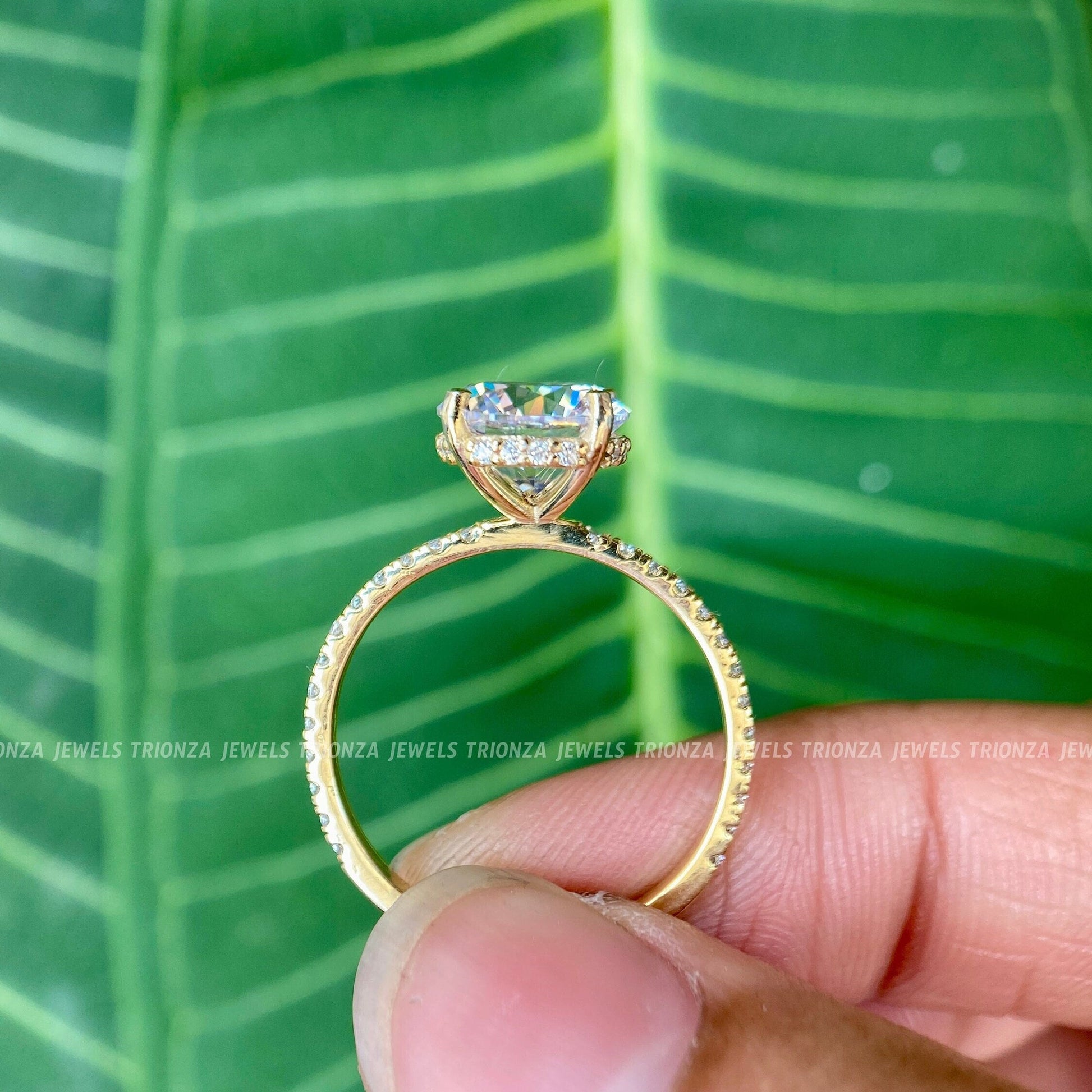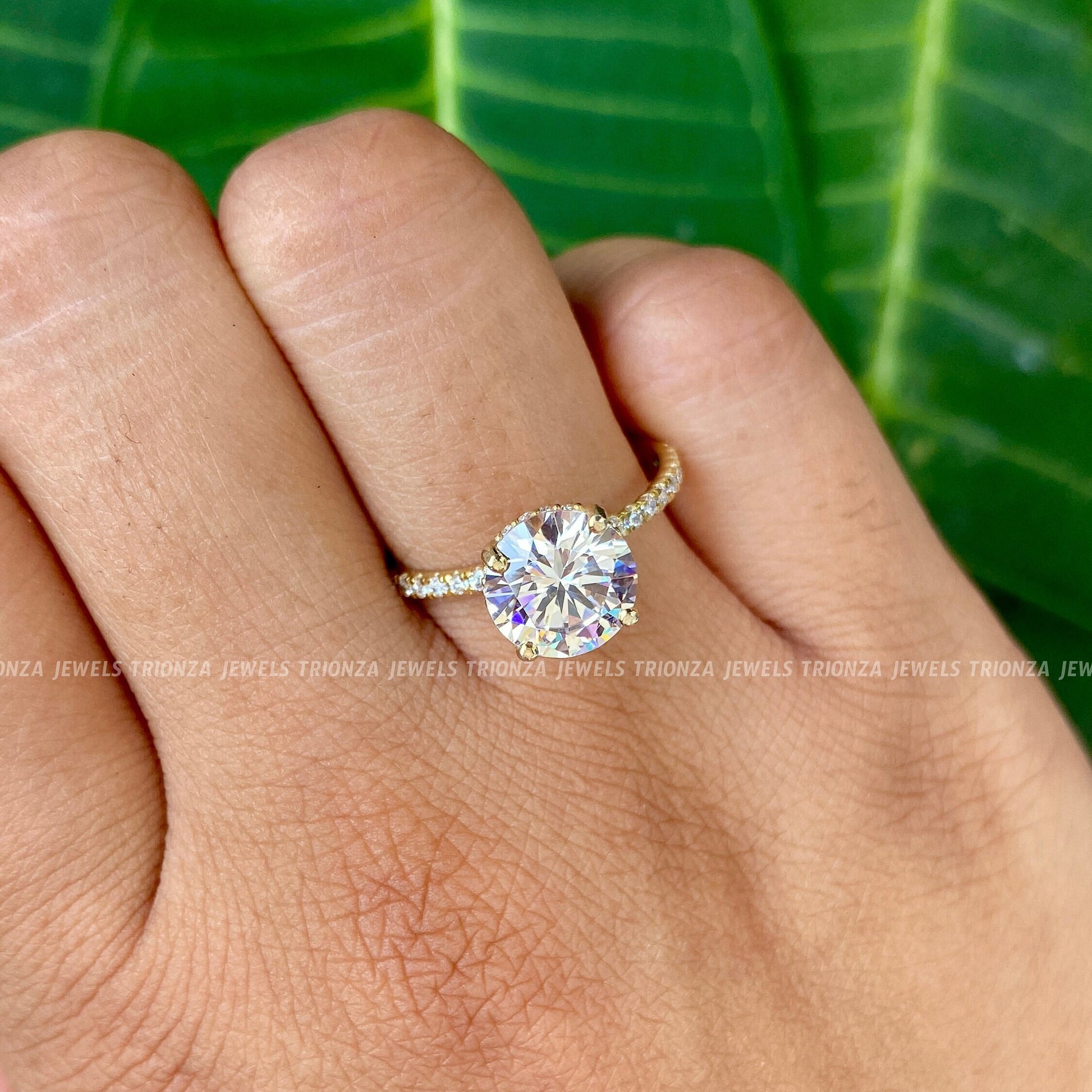 Discover the exquisite 2CT Round Moissanite Engagement Ring by TRIONZA JEWELS. This stunning ring features a brilliant round cut moissanite, a delicate hidden halo, and a dazzling pave half eternity band, set in luxurious 14K gold.