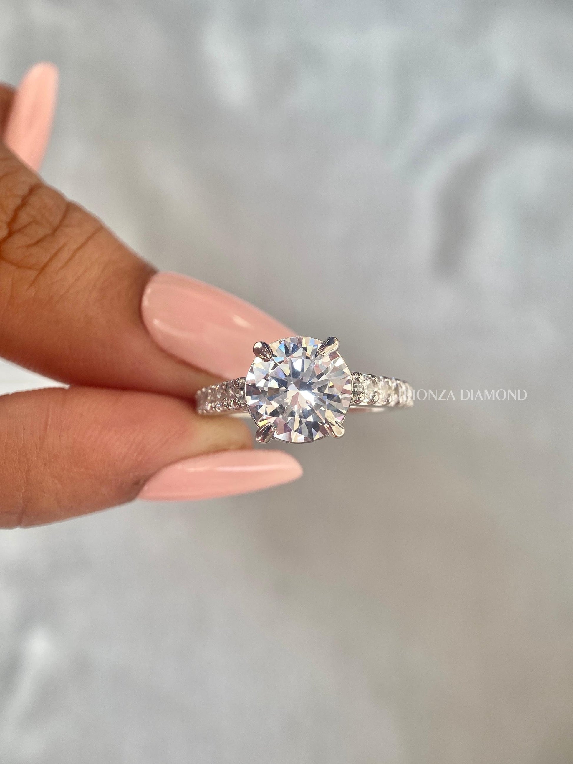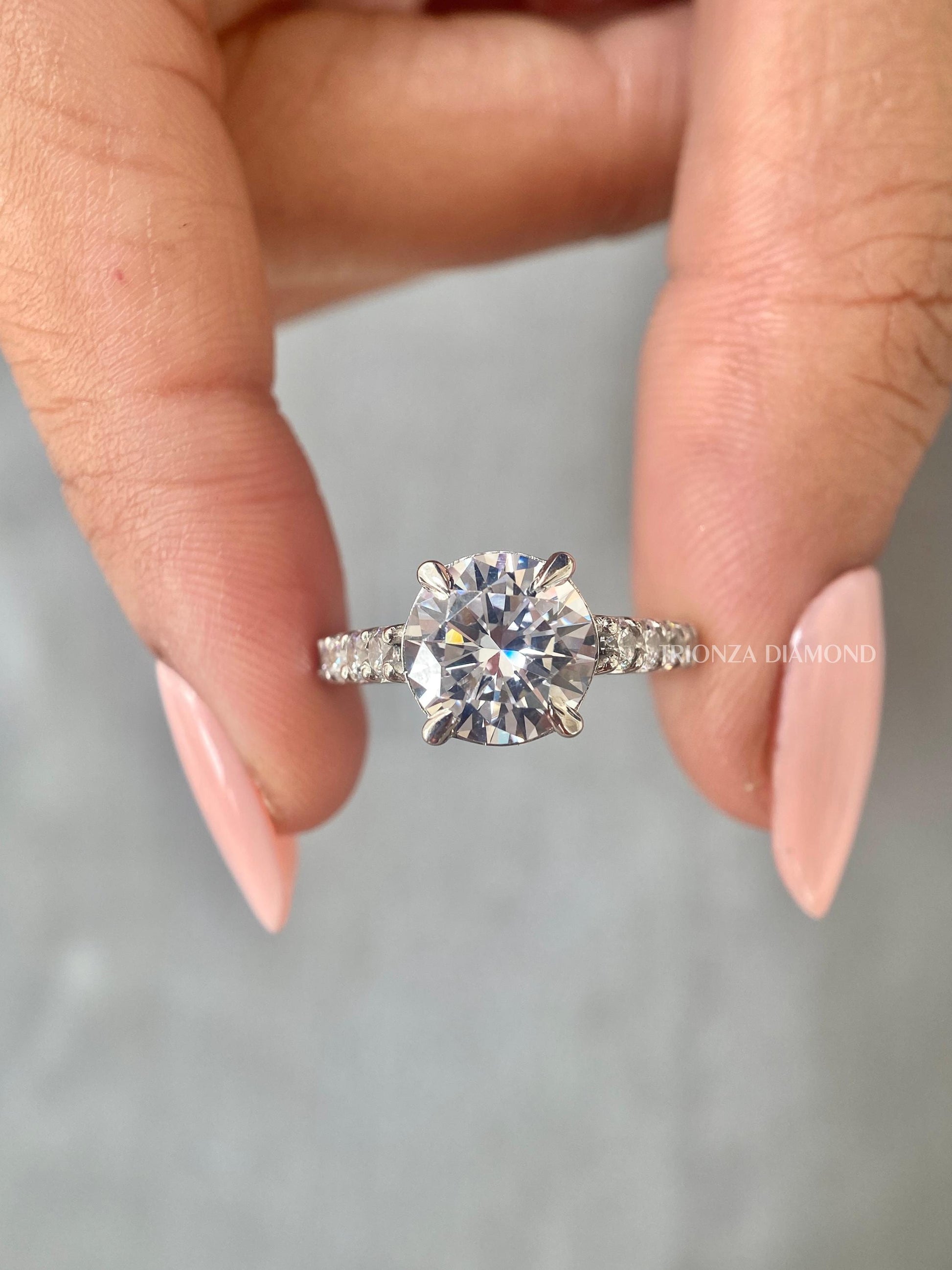 Discover our exquisite 3.0 CT Round Cut Lab Created Diamond Engagement Ring, featuring an E/VVS2 clarity and a beautiful pave setting. This personalized prong setting ring is a perfect choice for an engagement or anniversary gift, offering a unique, conflict-free diamond experience, handcrafted with love by TRIONZADIAMOND.