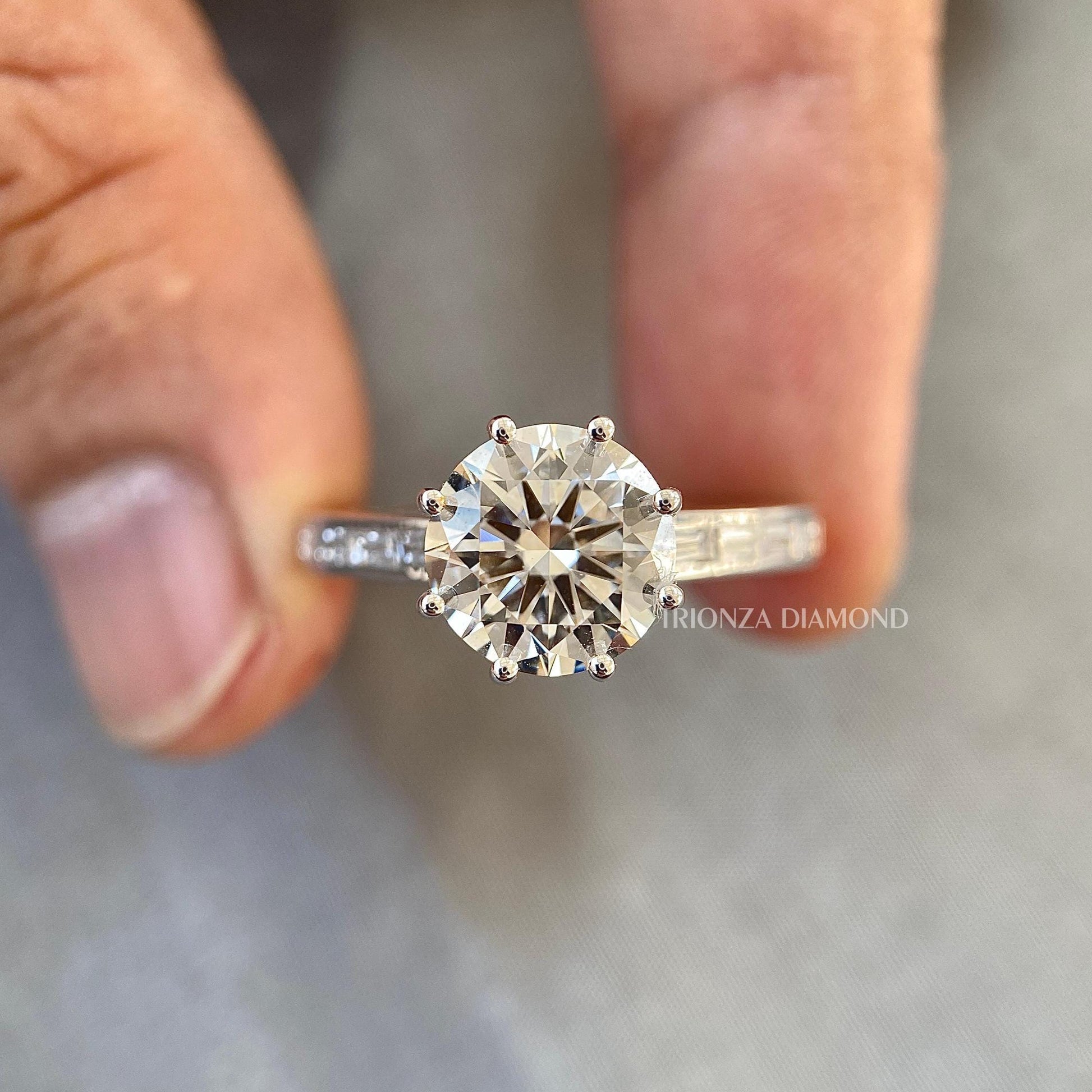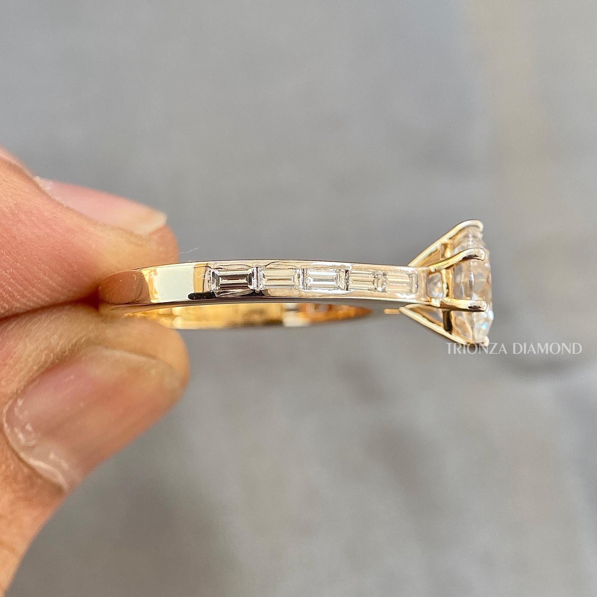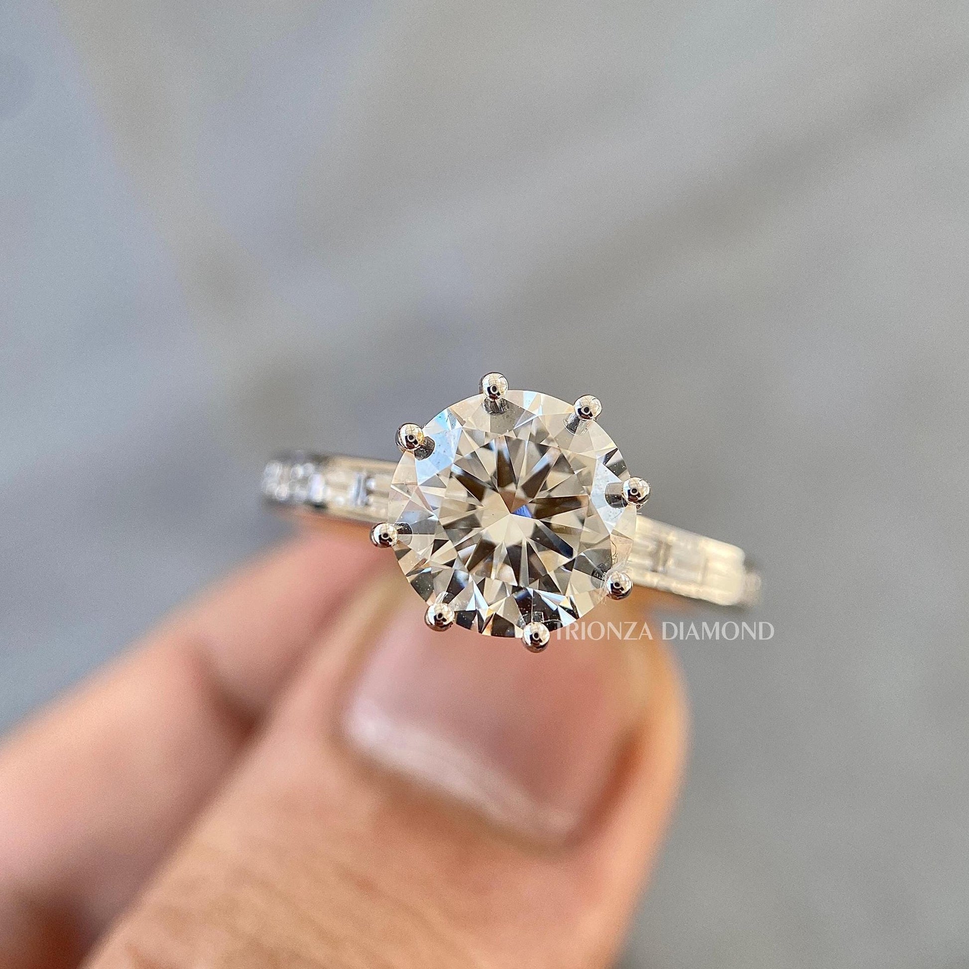 Discover our stunning 3 Carat IGI Certified Lab Created Diamond Wedding Ring, featuring a D Color, VVS1 Clarity round brilliant diamond with elegant baguette pave setting. Perfect as an engagement ring or a unique diamond ring, it's conflict-free and handcrafted by TRIONZA DIAMOND.