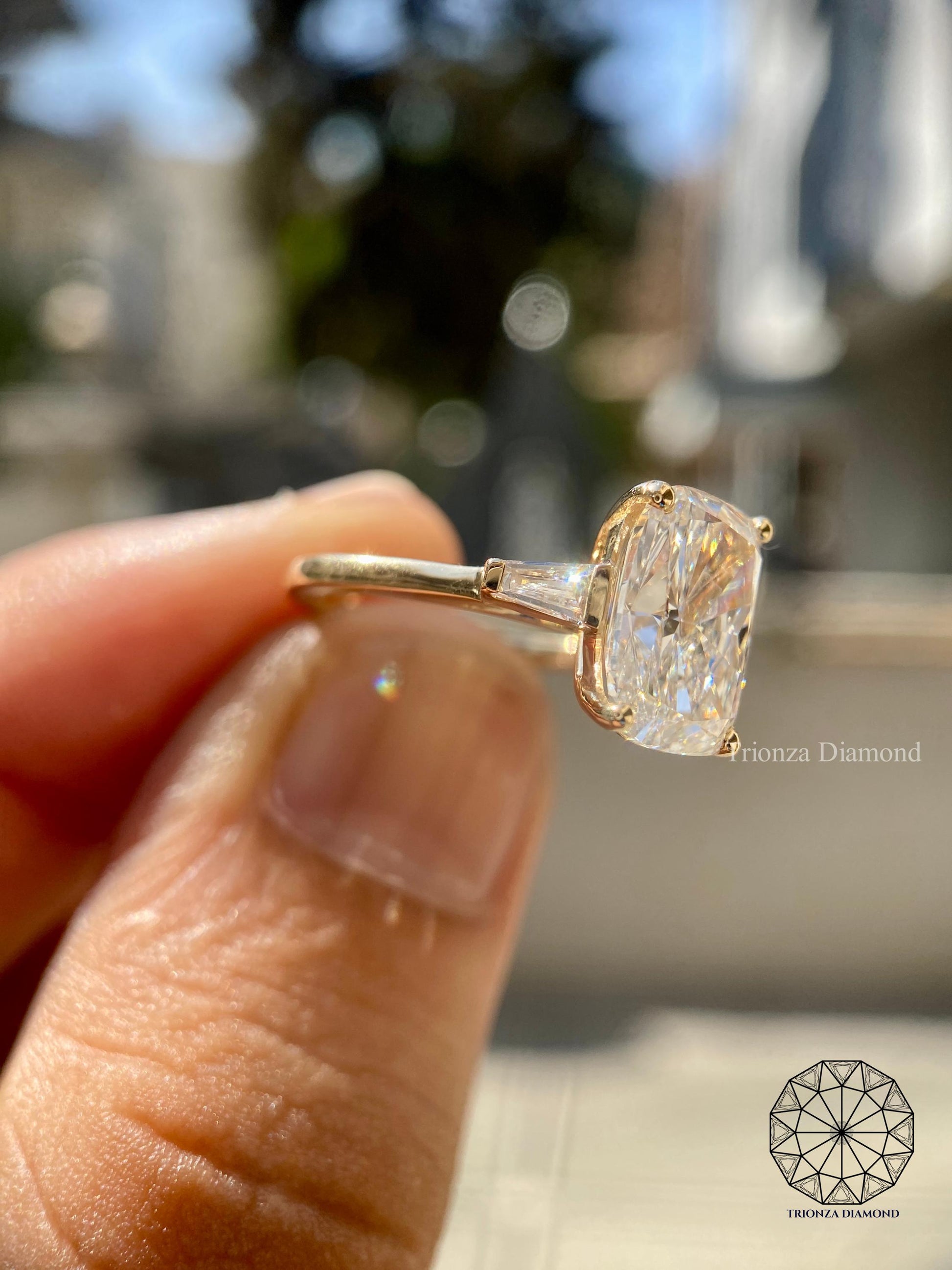 Discover our stunning 3 CT Elongated Cushion Cut Lab Diamond Engagement Ring. Featuring an E/VVS2 clarity, IGI Certified lab diamond, and elegant tapered baguettes, set in 14K gold. This three-stone bridal ring offers high sparkle, sustainability, and conflict-free brilliance.