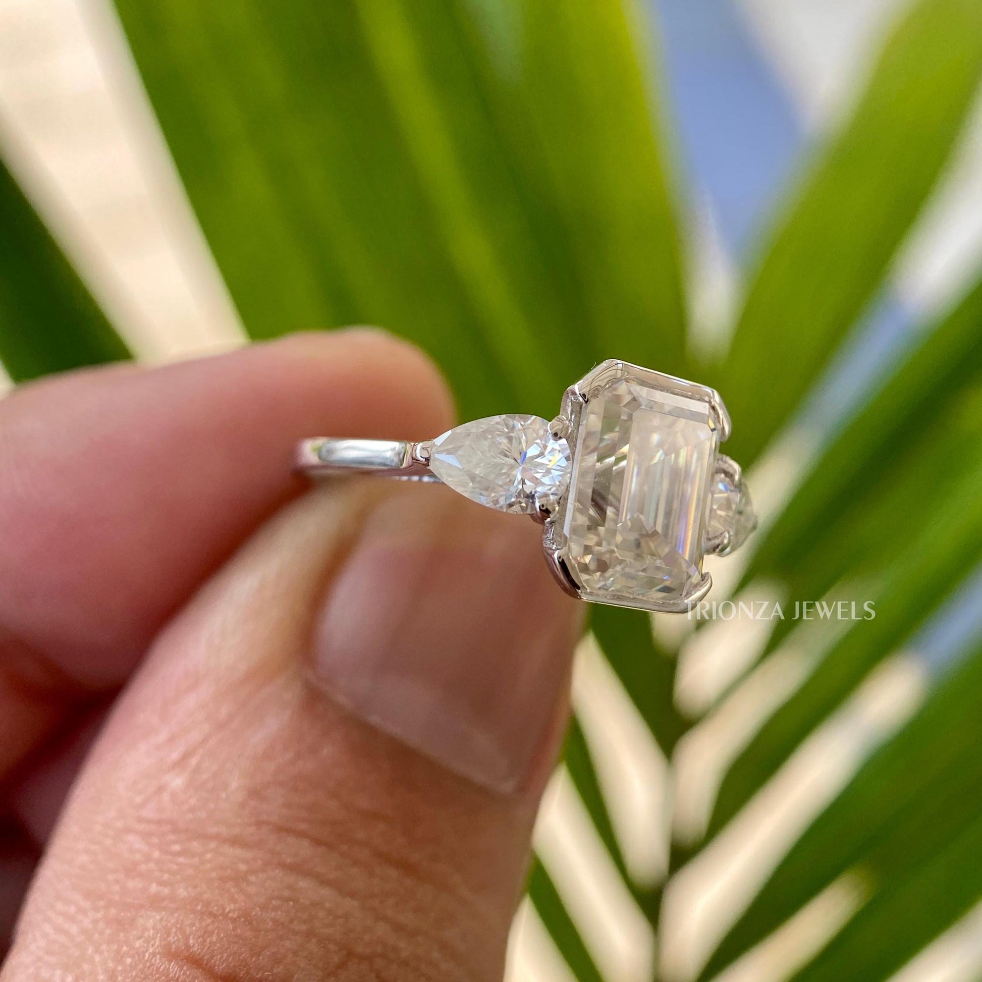 Celebrate your love with our stunning 3 CT Half Bezel Set Emerald Cut Three Stone Ring. This exquisite anniversary or wedding ring features a brilliant emerald cut moissanite center stone, complemented by elegant side pear stones, all set in luxurious 14k gold.