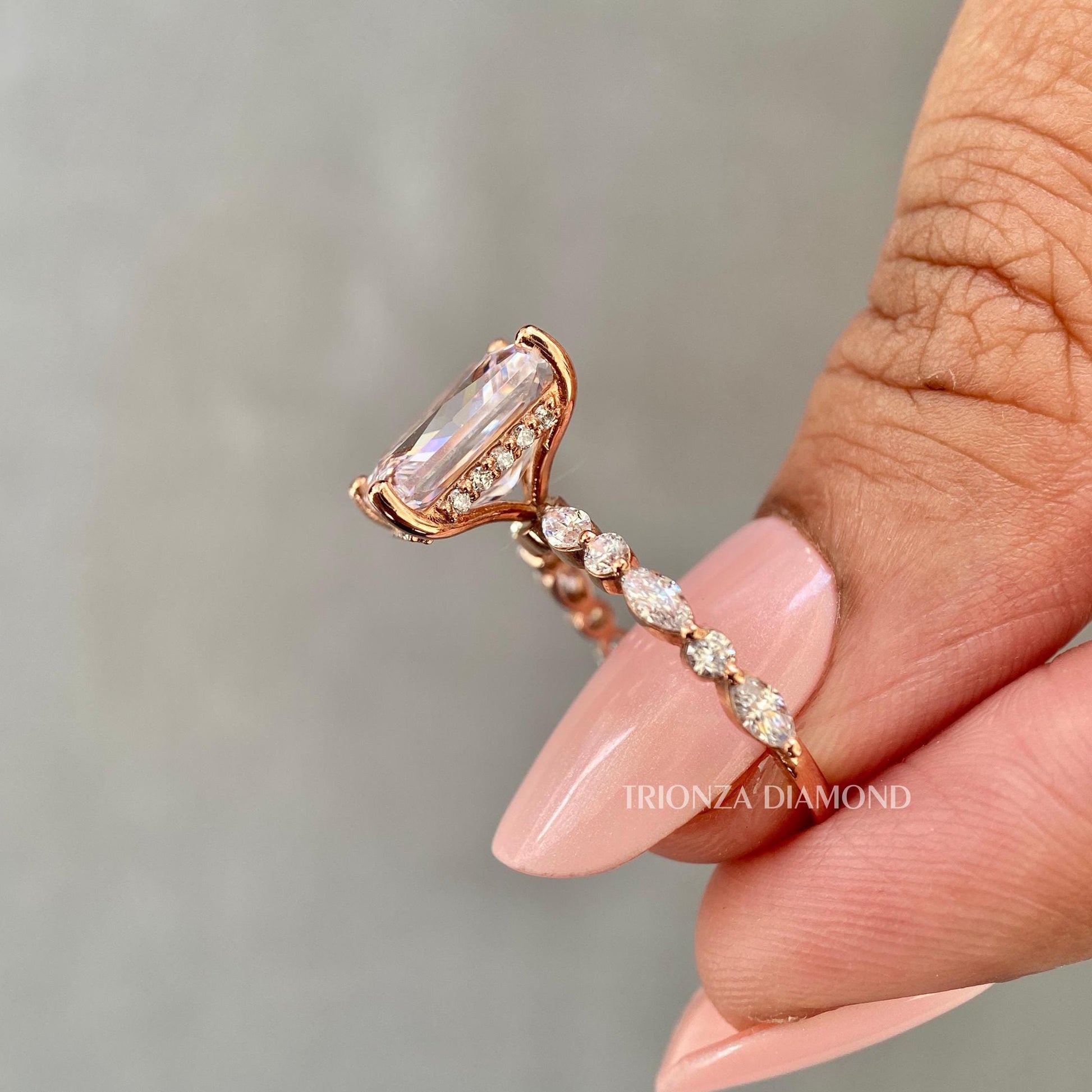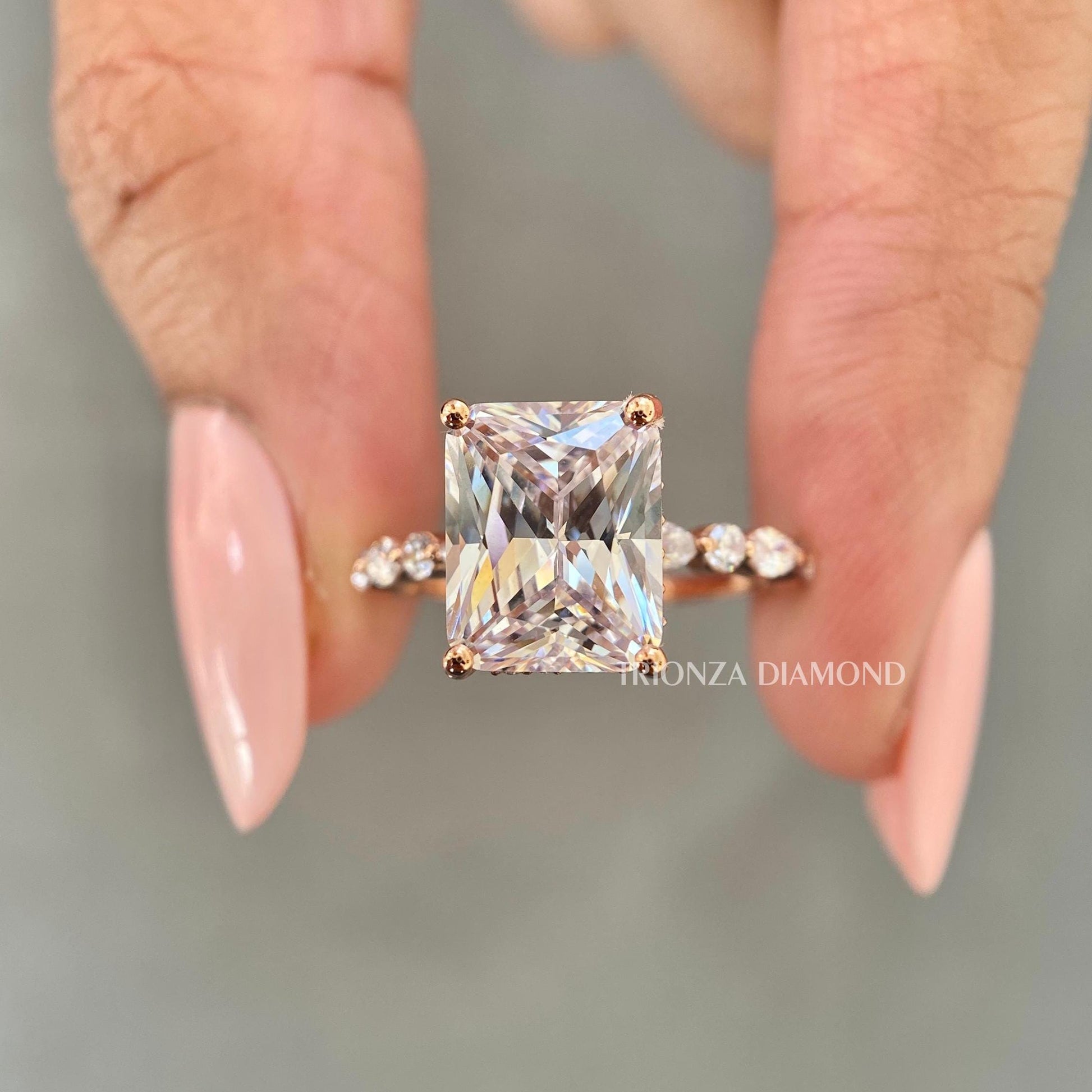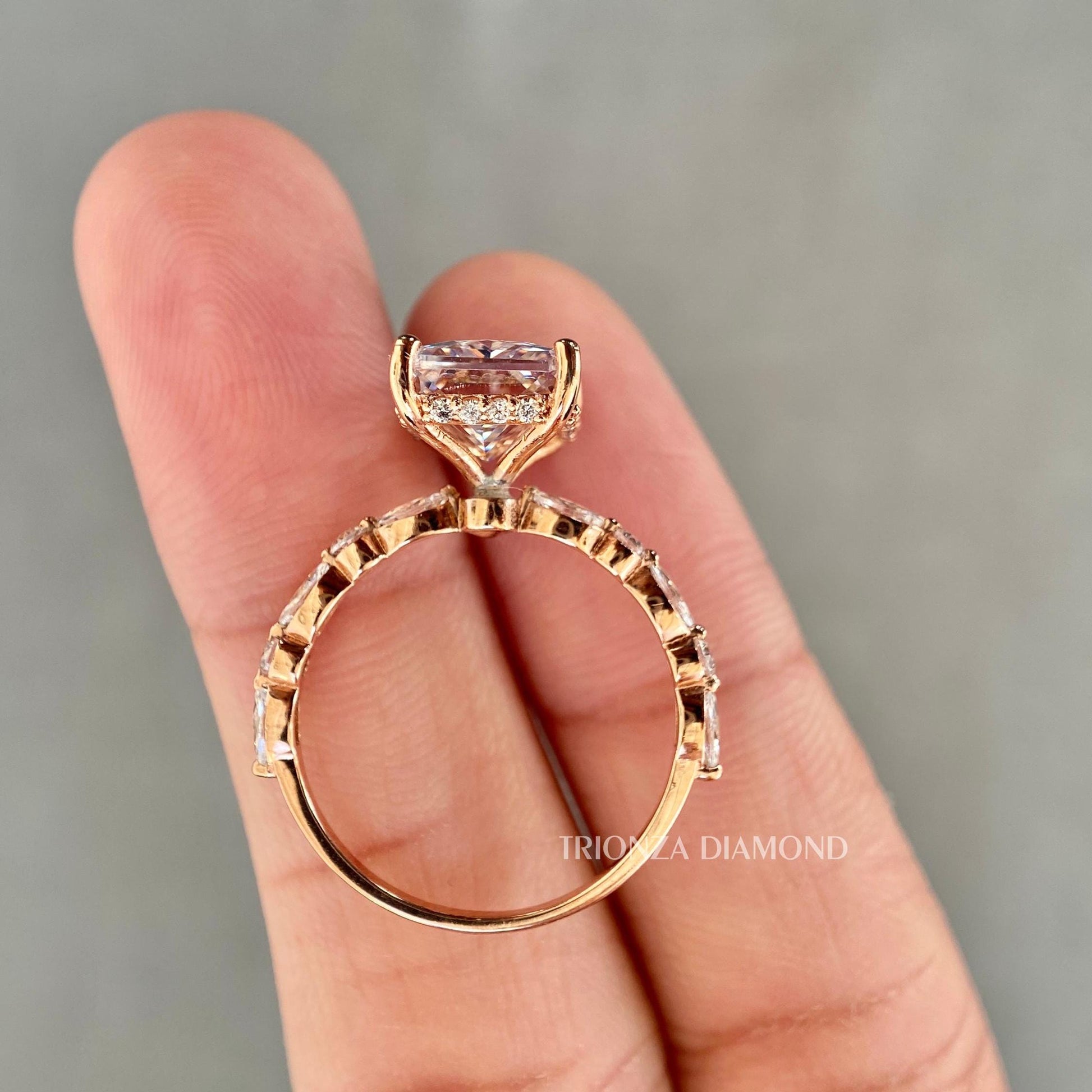 Discover our stunning 3 CT IGI Certified E/VS1 Lab Grown Radiant Cut Diamond Engagement Ring. This exquisite ring features marquise and round pave-set lab-created diamonds, making it a perfect symbol of love for her. Our eco-friendly and conflict-free lab diamonds offer exceptional brilliance and quality.