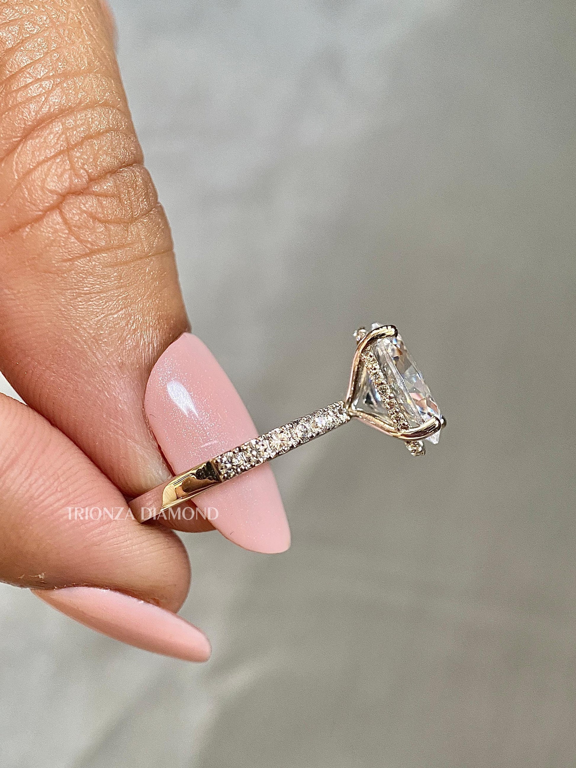 This stunning 3 CT Oval Lab Grown Diamond Engagement Ring features an F/VVS2 Oval Cut diamond with a hidden halo and pave setting. Each ring is IGI Certified, making it a perfect anniversary gift or a symbol of your love. Our lab-created diamonds are eco-friendly and conflict-free.