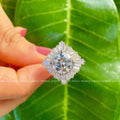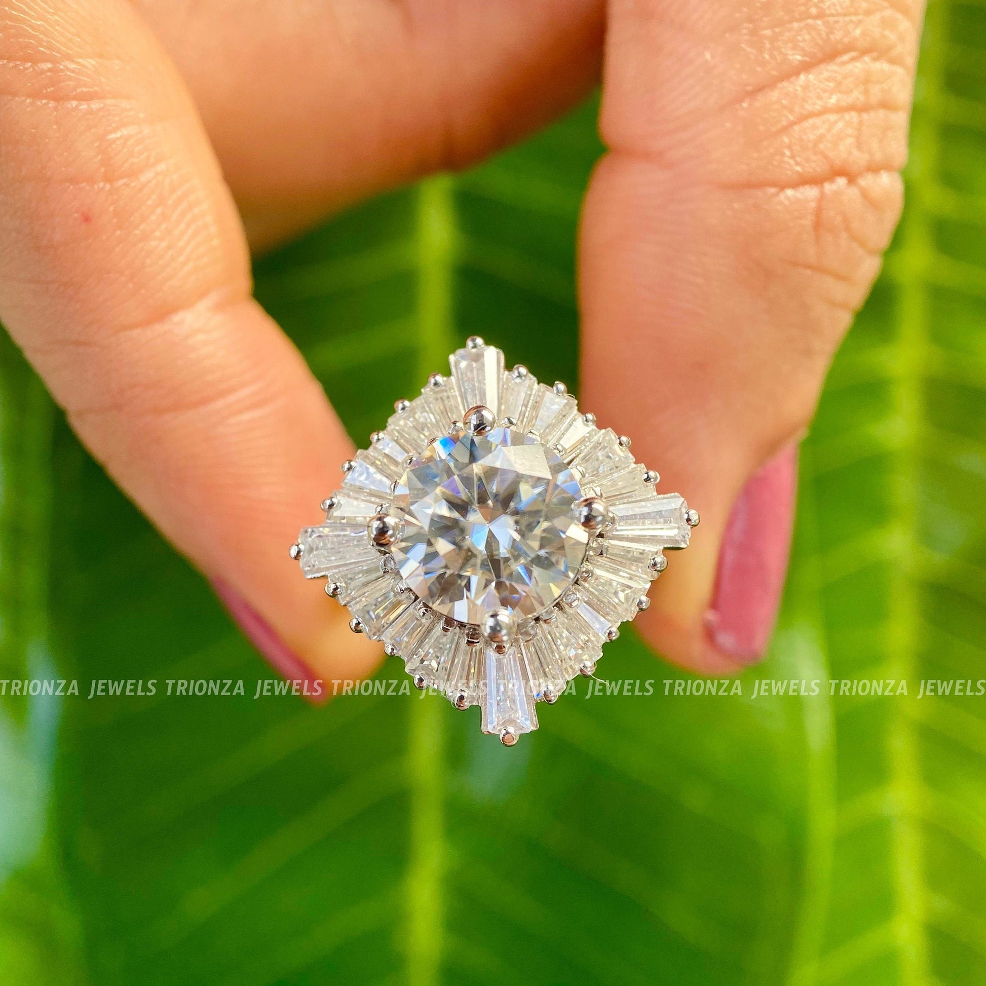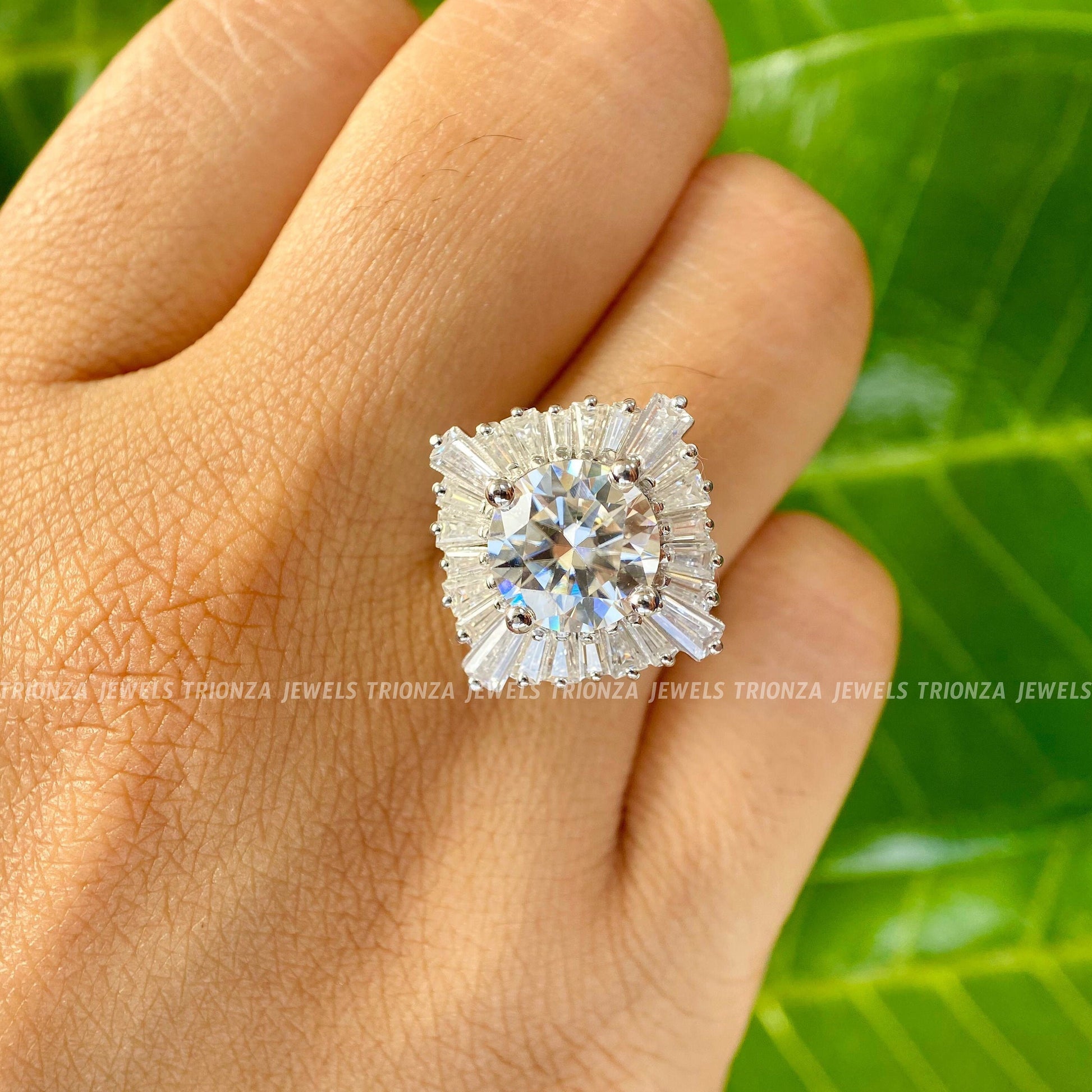 This stunning 3 CT Round Cut Moissanite Diamond Wedding Ring is perfect for brides-to-be, featuring a gorgeous baguette cluster halo set, ideal for engagement or anniversary celebrations. This eco-friendly and conflict-free moissanite ring is a beautiful symbol of love.