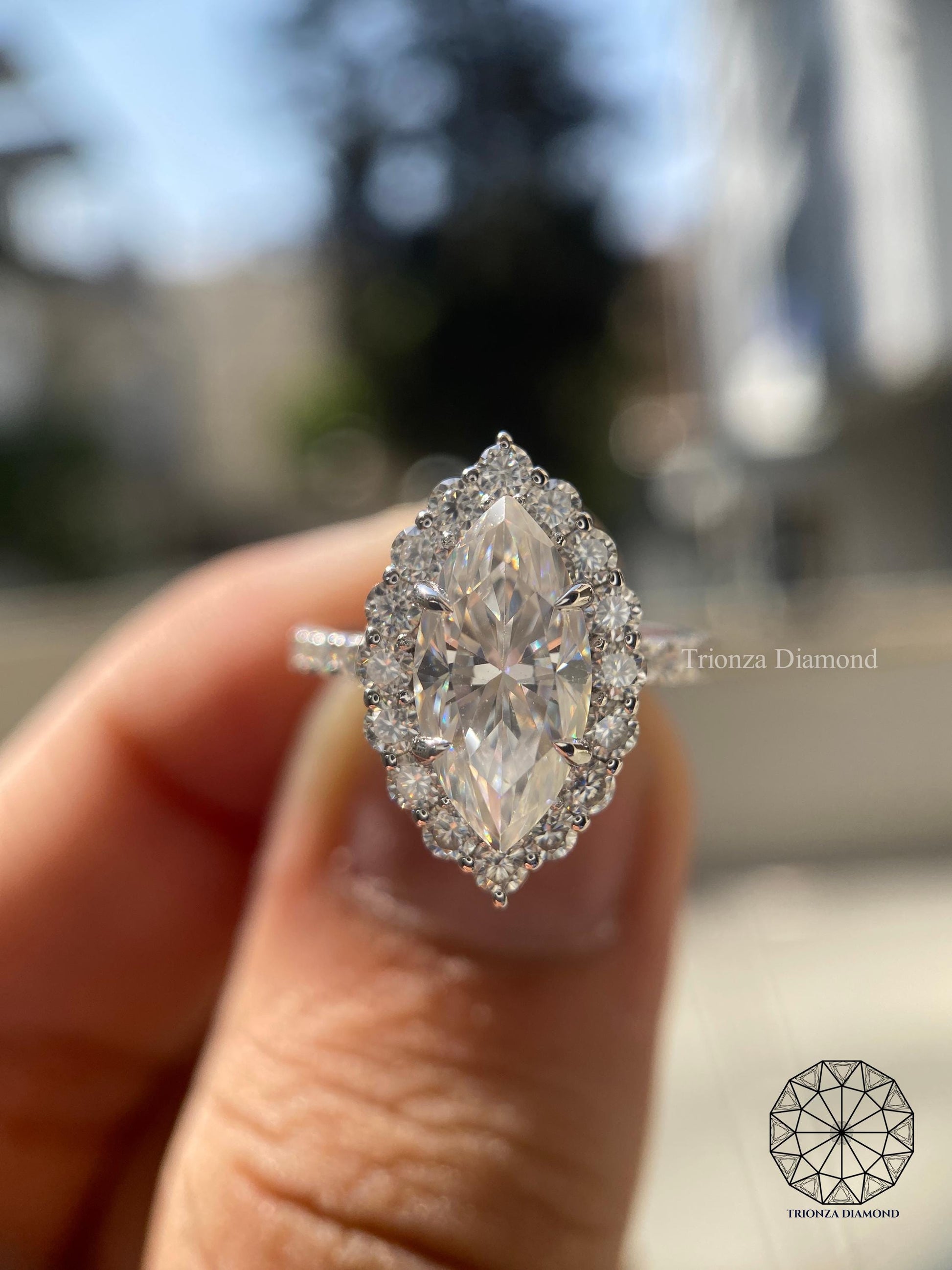 Discover timeless elegance with our 4.00 Total Carat Weight (TCW) IGI Certified Lab Grown Diamond Halo Engagement Ring. Featuring a stunning Marquise Cut main diamond and brilliant round accent diamonds, this 14k Gold ring is perfect for engagements, weddings, or a cherished anniversary gift. Our eco-friendly and conflict-free lab created diamonds offer exceptional brilliance and verified quality.