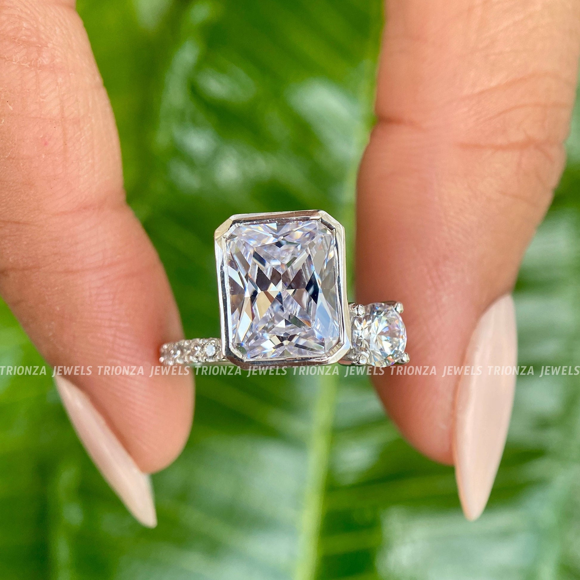 Propose with confidence with this stunning 4.45 CT Radiant Bezel and Round Cut Moissanite Two Stone Engagement Ring. A perfect blend of elegance and ethical sourcing, this gold wedding ring is also an ideal anniversary gift for your girlfriend. Moissanite diamonds are renowned for their brilliance and are also known as eco-friendly, ethical, sustainable, or man-made diamonds.